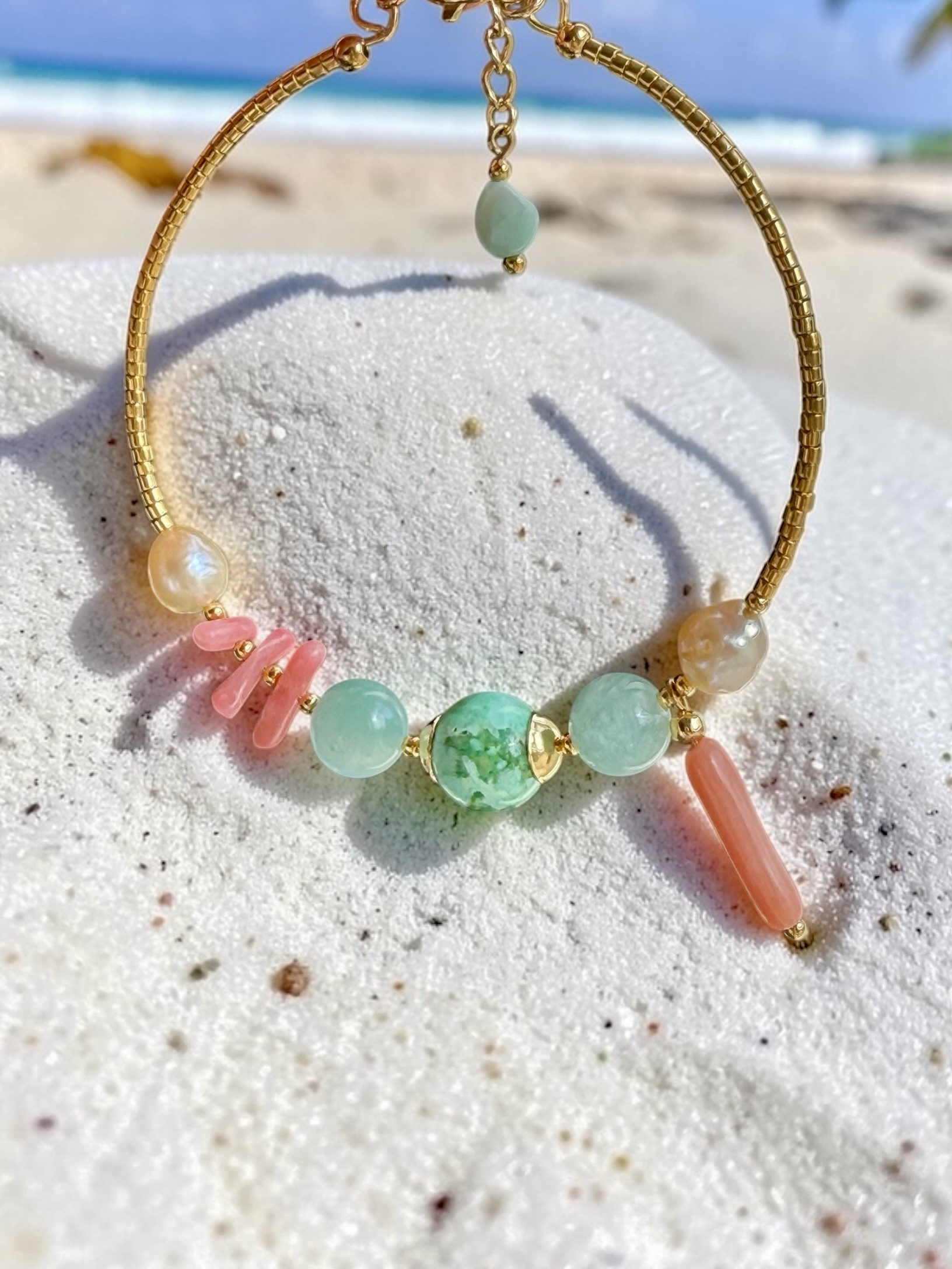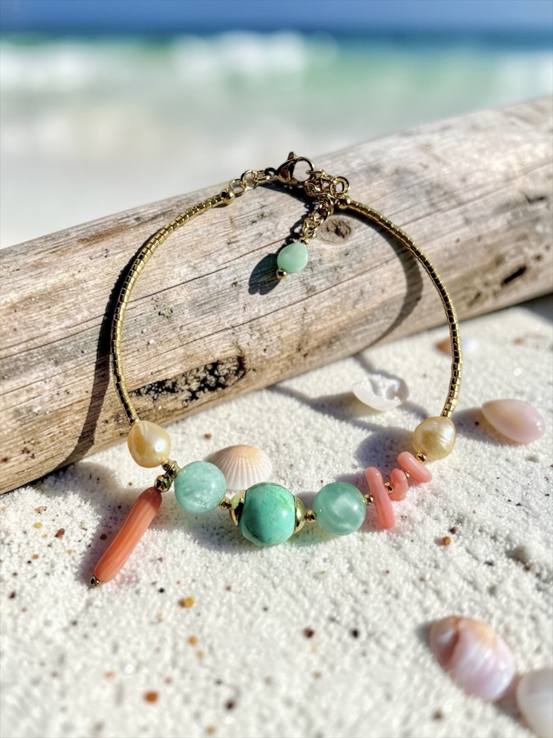 To egzotyczna kompozycja naturalnych kamieni, w której pastelowe turkusy spotykają się z ciepłym koralem i subtelnym blaskiem pereł. Całość tworzy harmonijną, luksusową biżuterię przywołującą spokój i piękno natury.
