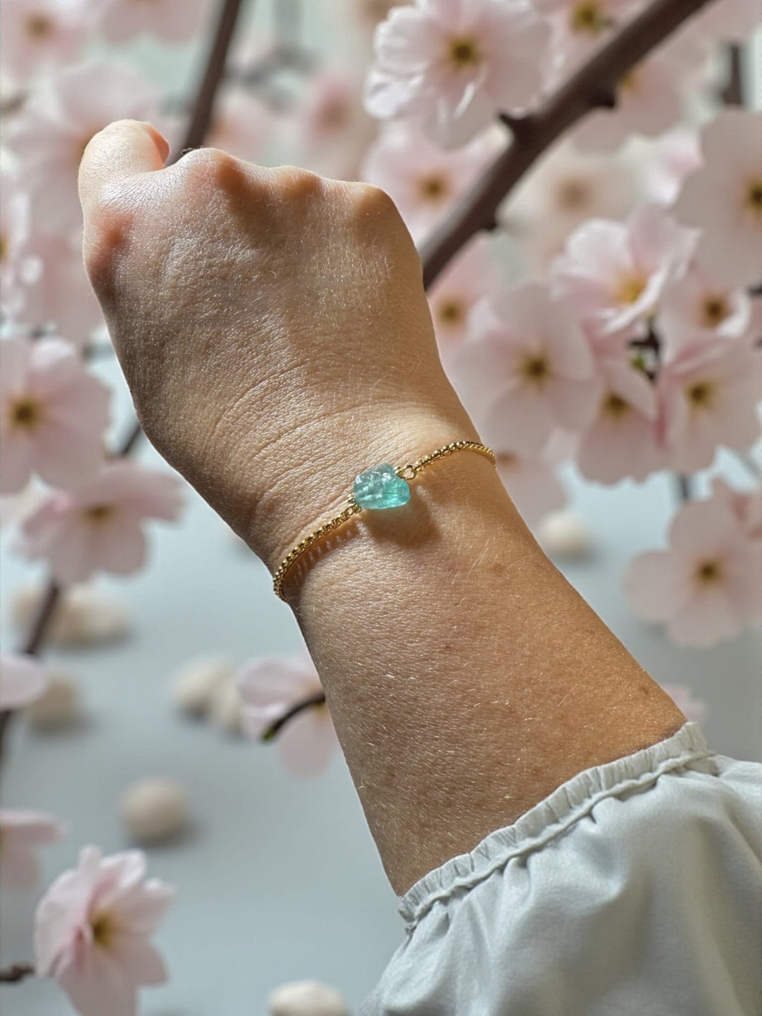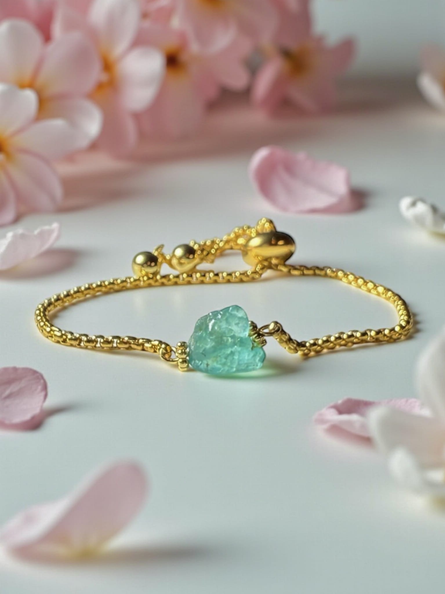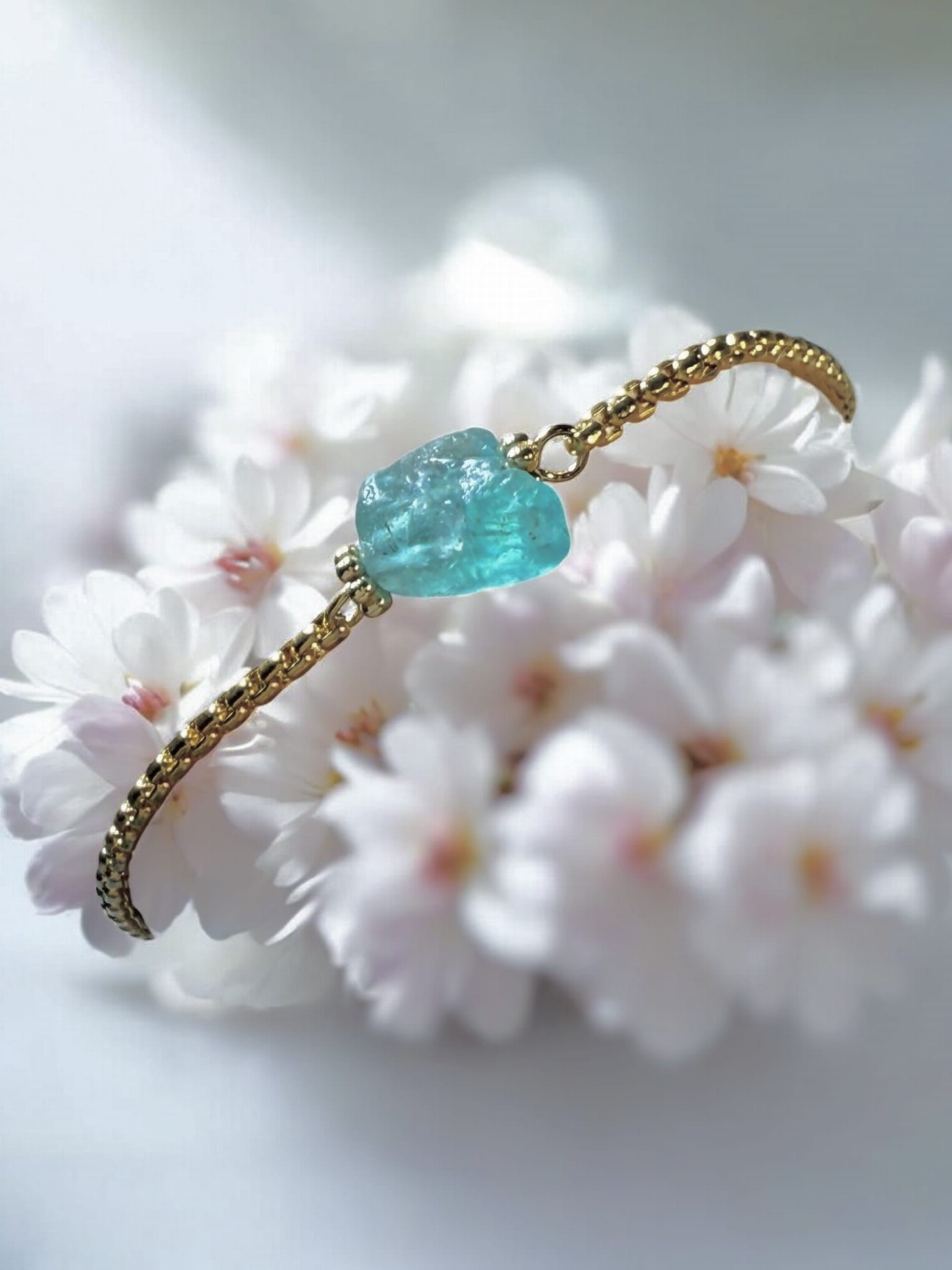 Ta ręcznie wykonana bransoletka łączy w sobie delikatność pozłacanej stali szlachetnej z mocą naturalnego kamienia – surowego apatytu. Każdy kryształ jest unikatowy – różni się kształtem i subtelnymi niuansami barwy, co czyni Twoją bransoletkę absolutnie wyjątkową.