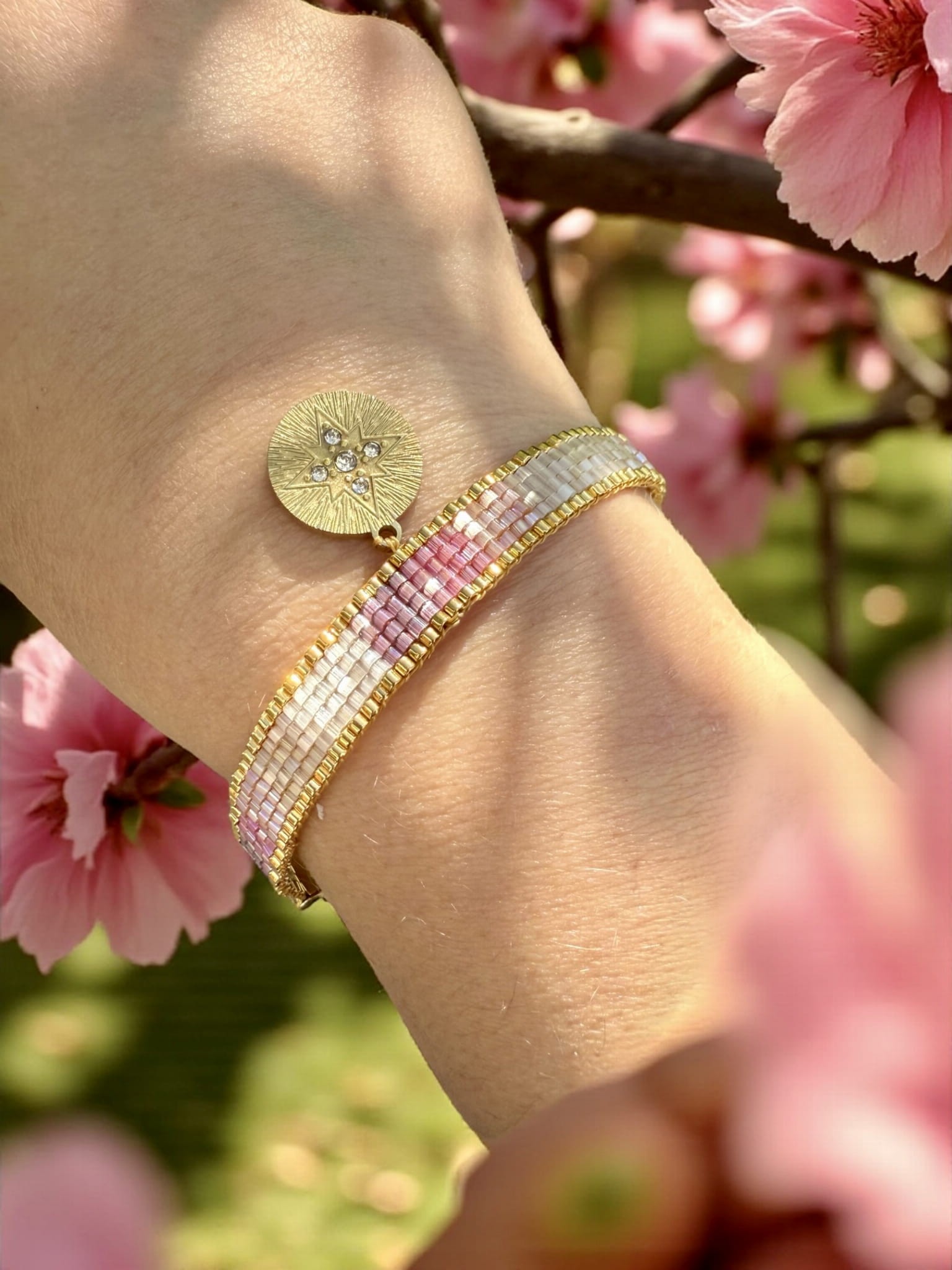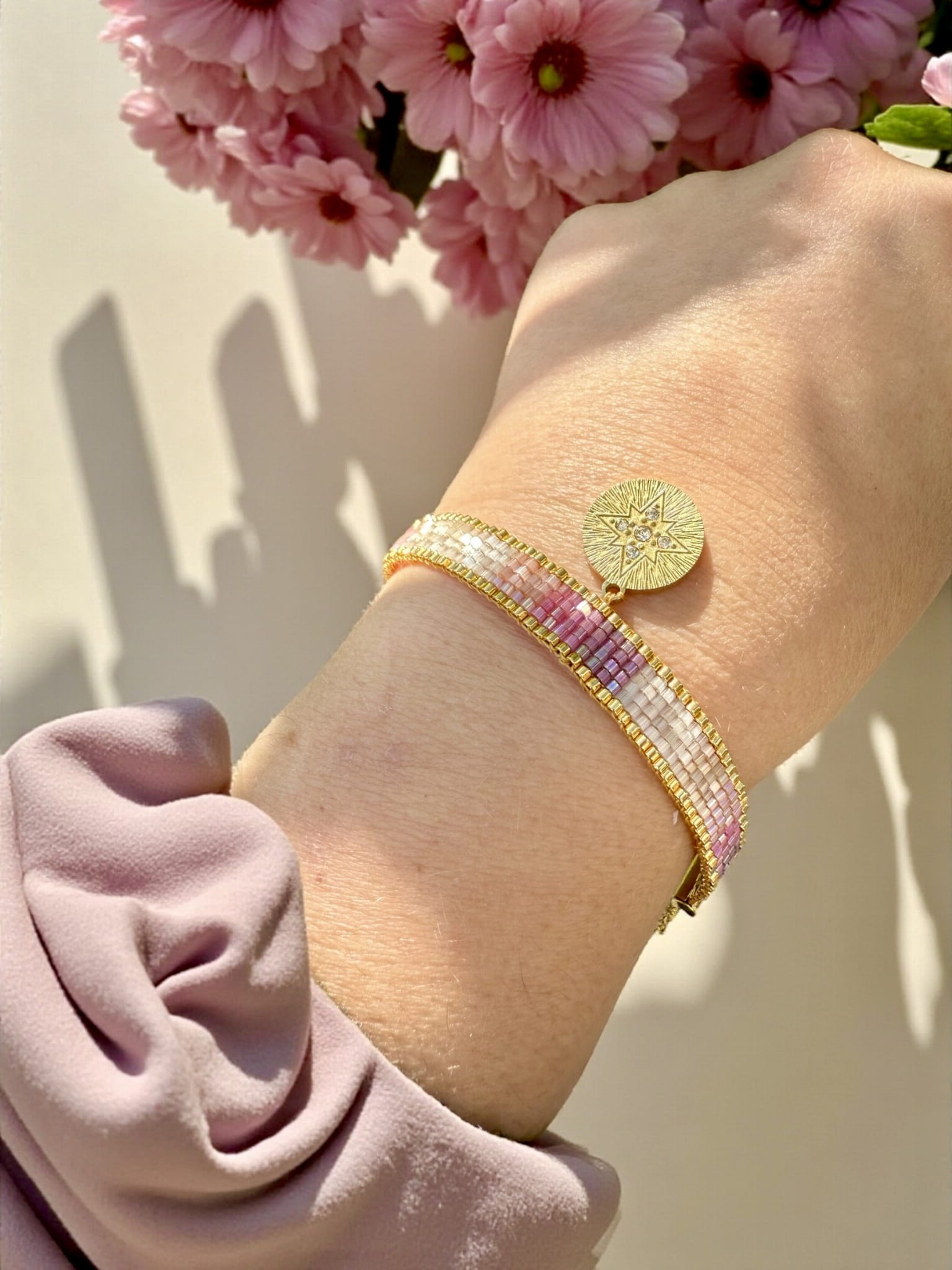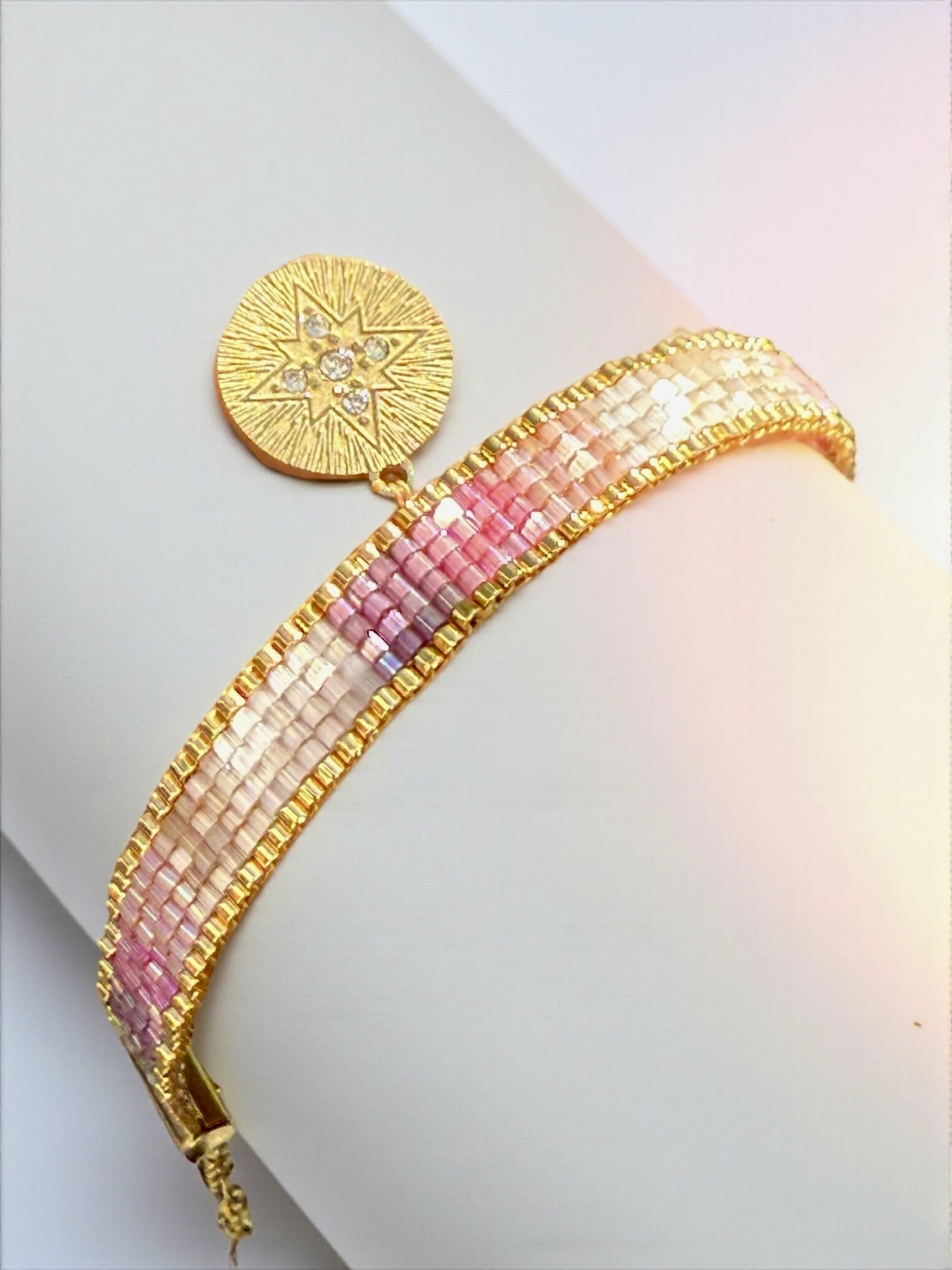 Bransoletka Tkana z Gwiazdą | ręcznie wykonana | ombre z koralików Miyuki, odcienie różu