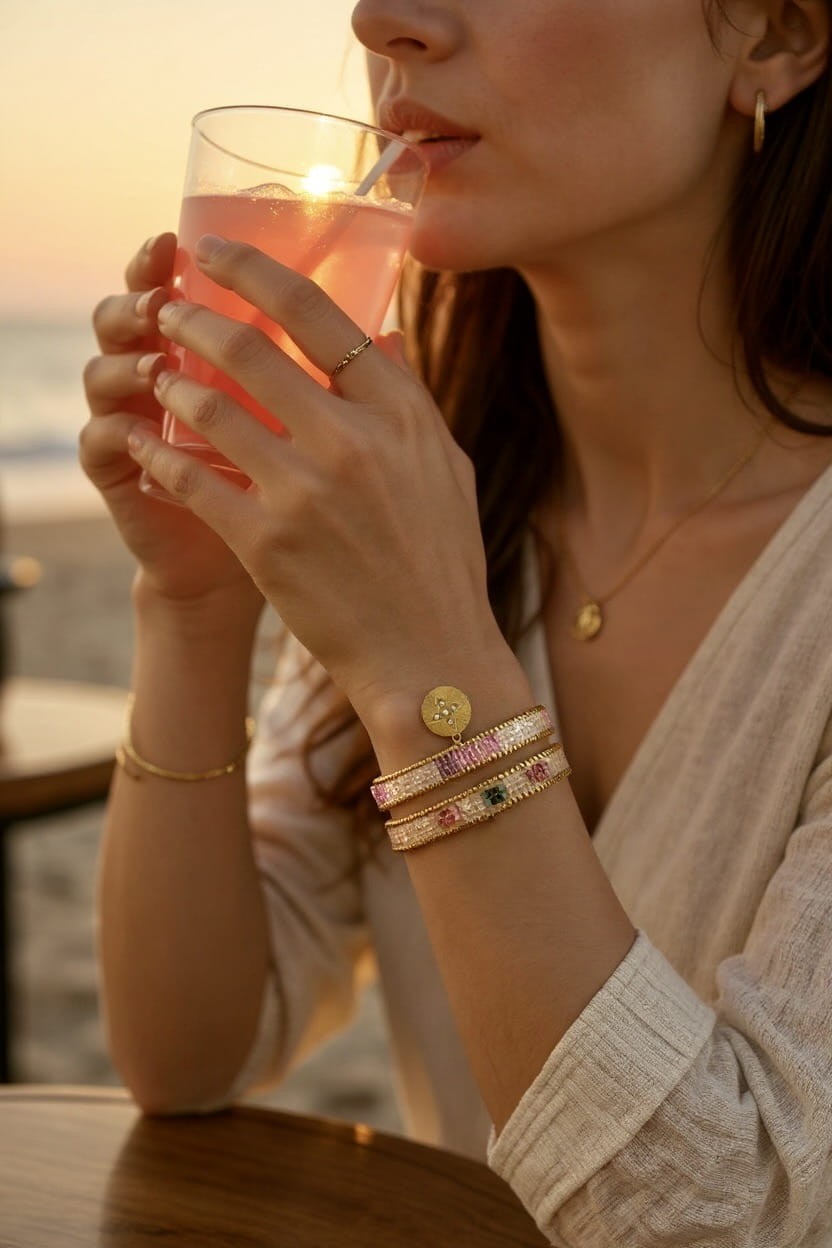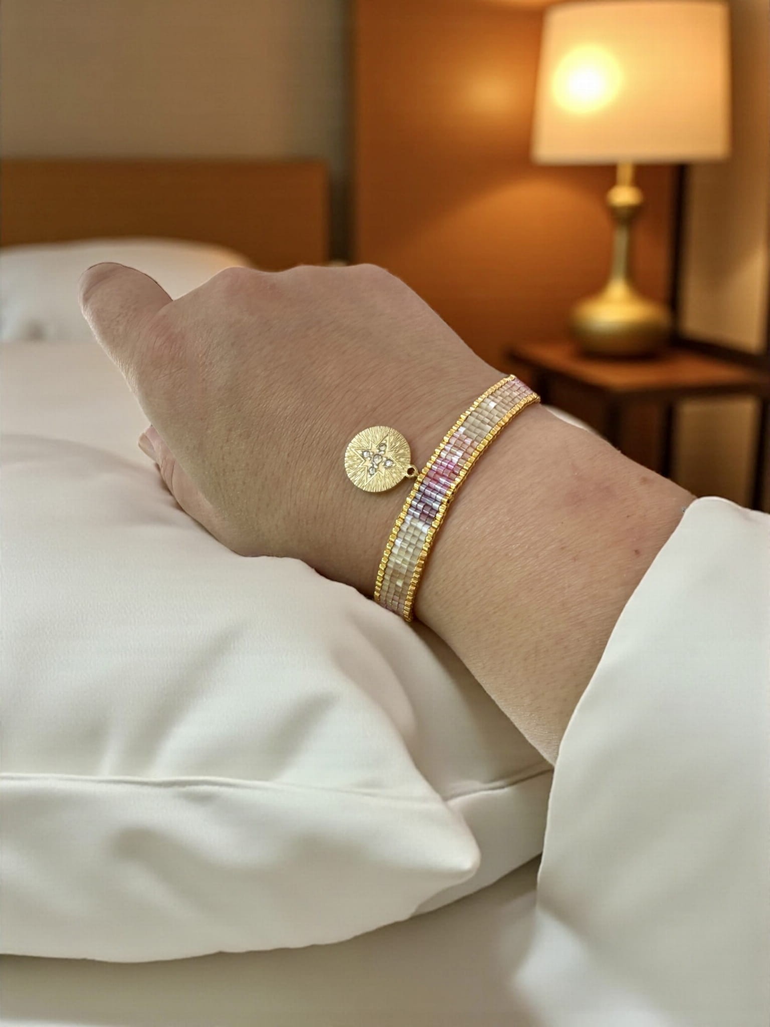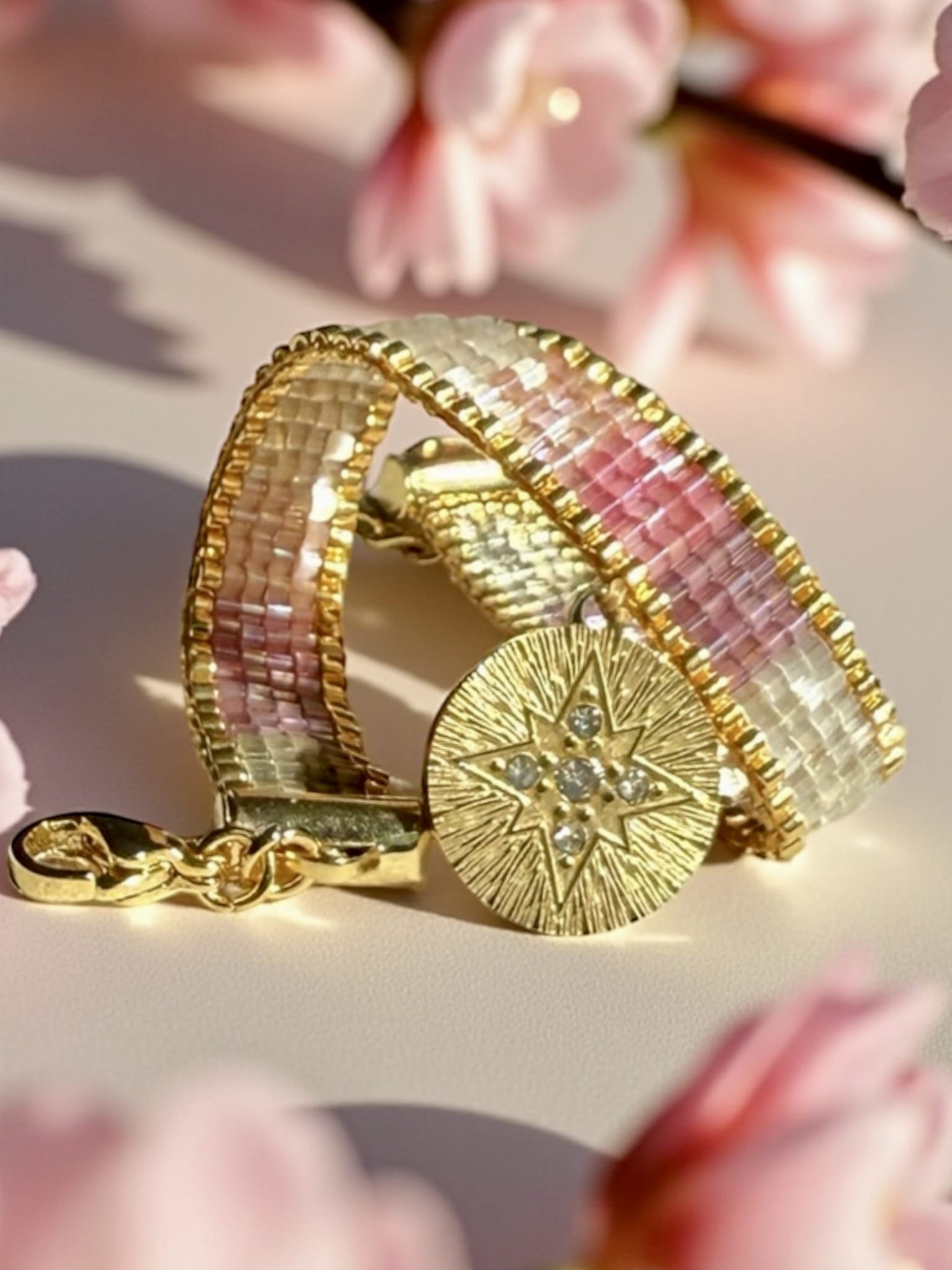 Efekt, którego nie da się opisać słowami – ta bransoletka naprawdę żyje w świetle, odbijaja promienie słońca jak mikroskopijne lustra. Dzięki temu całość mieni się tysiącem subtelnych refleksów – róż, biel i złoto przeplatają się, tworząc zjawiskową grę barw. To biżuteria, którą trzeba zobaczyć na żywo – zdjęcia nie oddają nawet połowy jej blasku.
