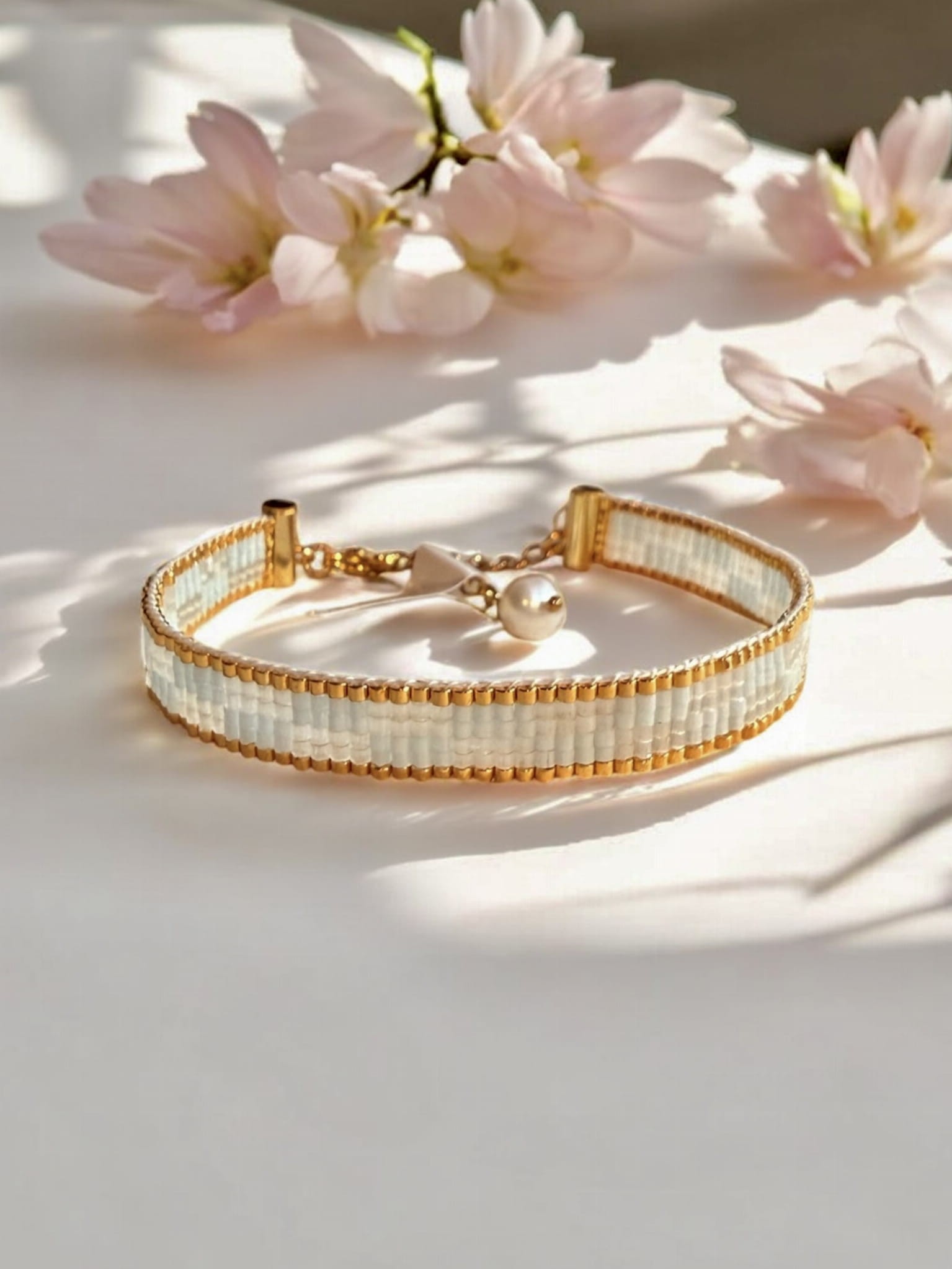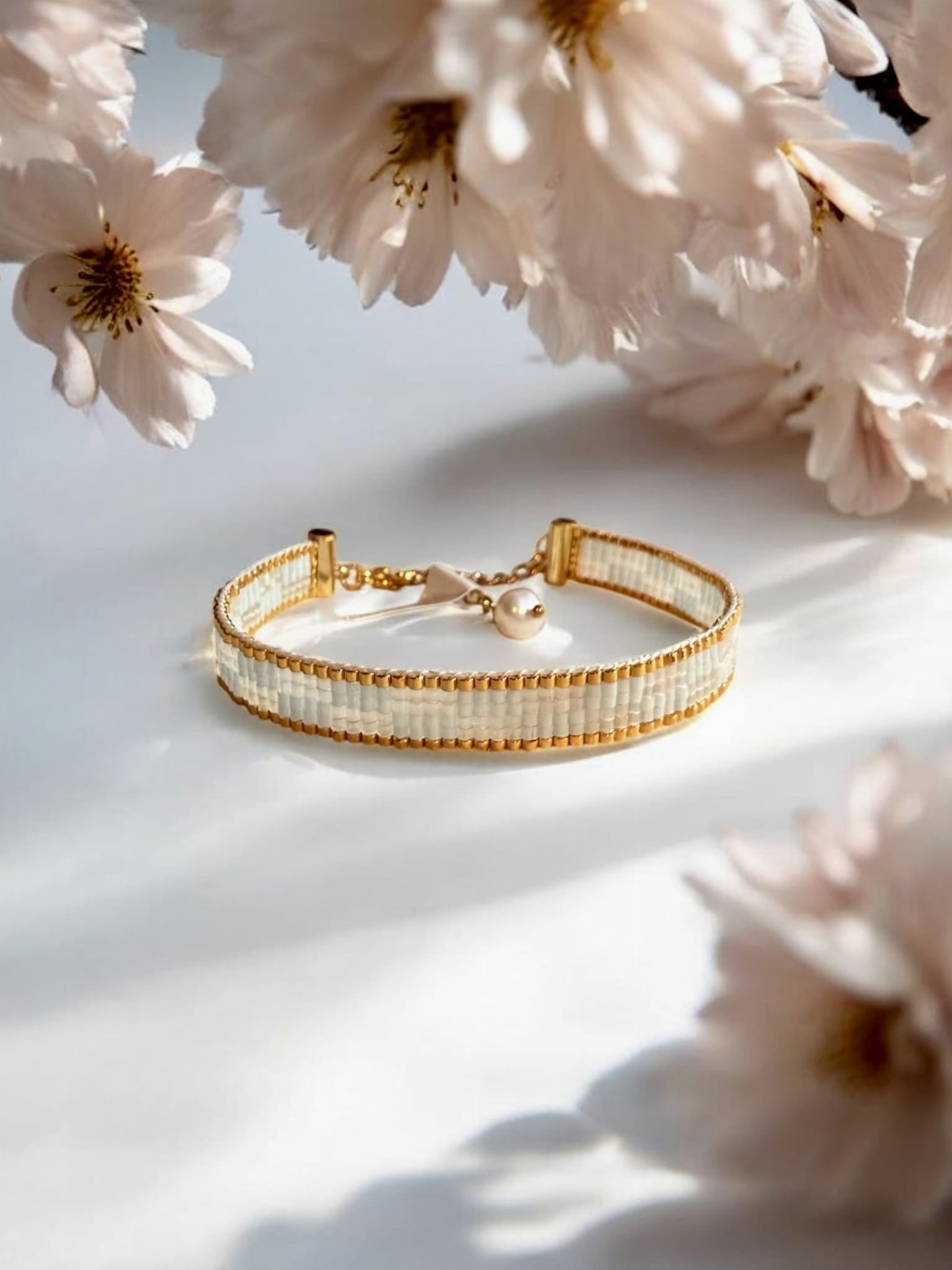 Bransoletka tkana z koralików Miyuki, biała, stal szlachetna, Biały Kruk