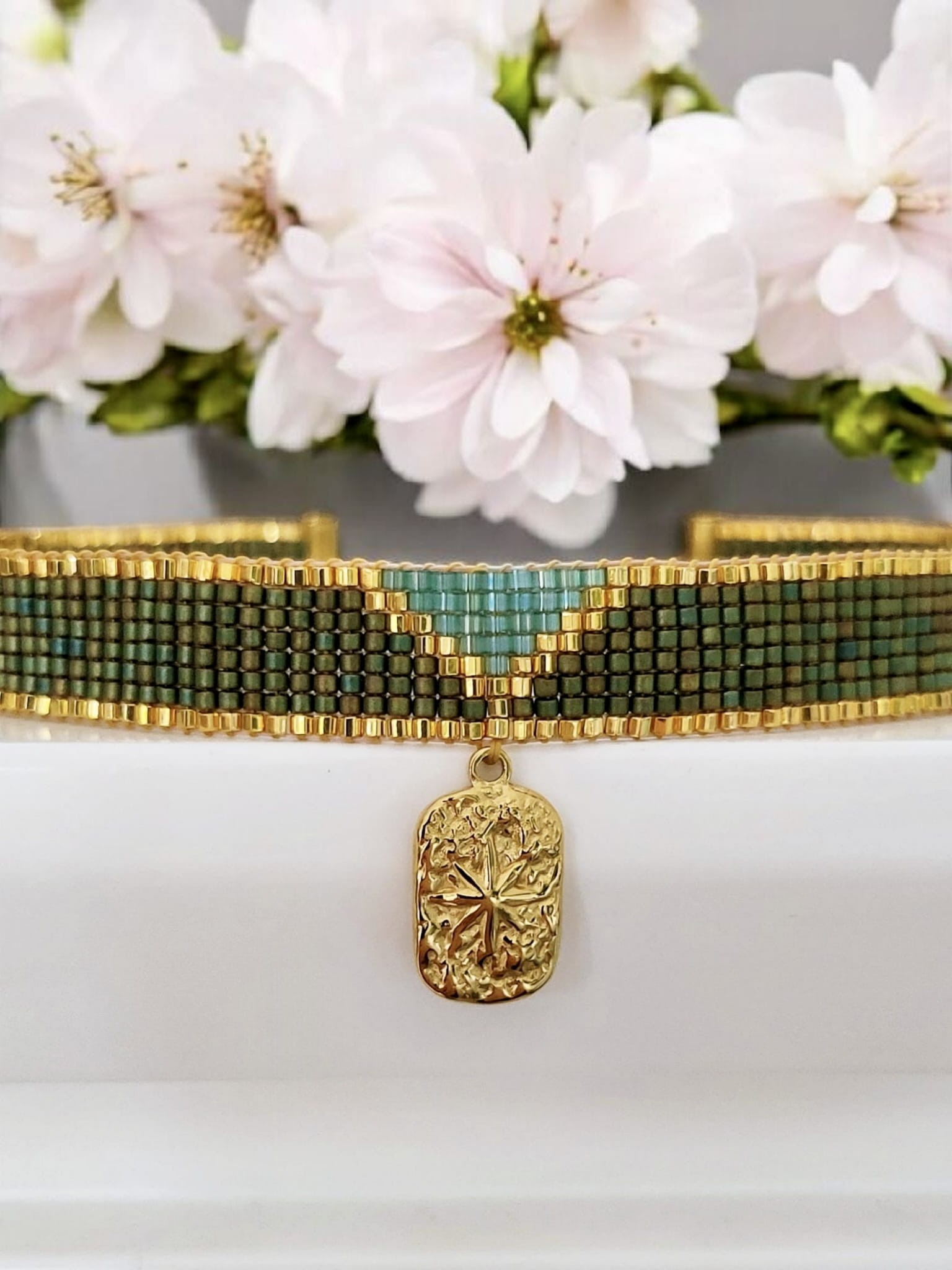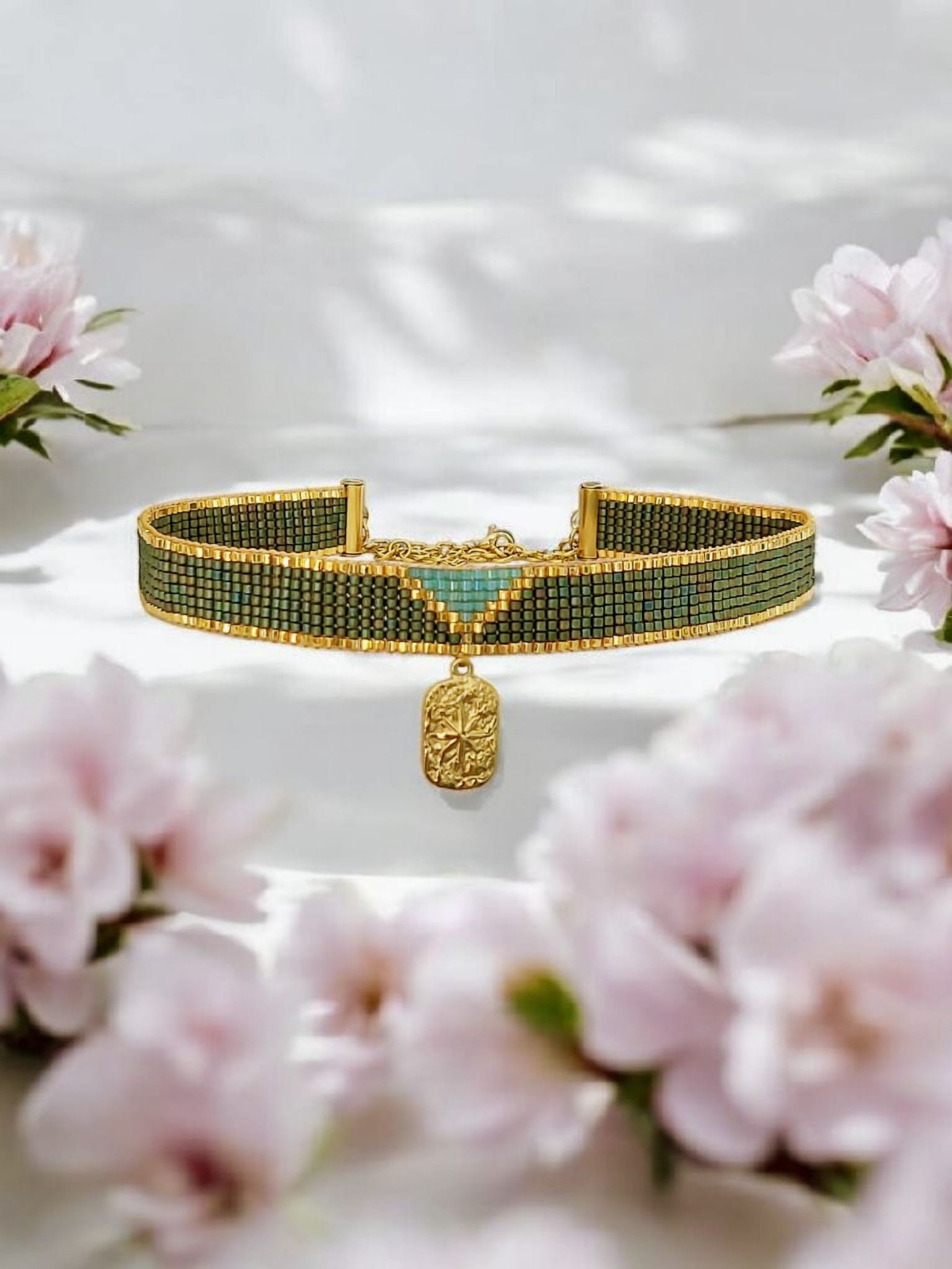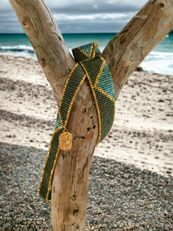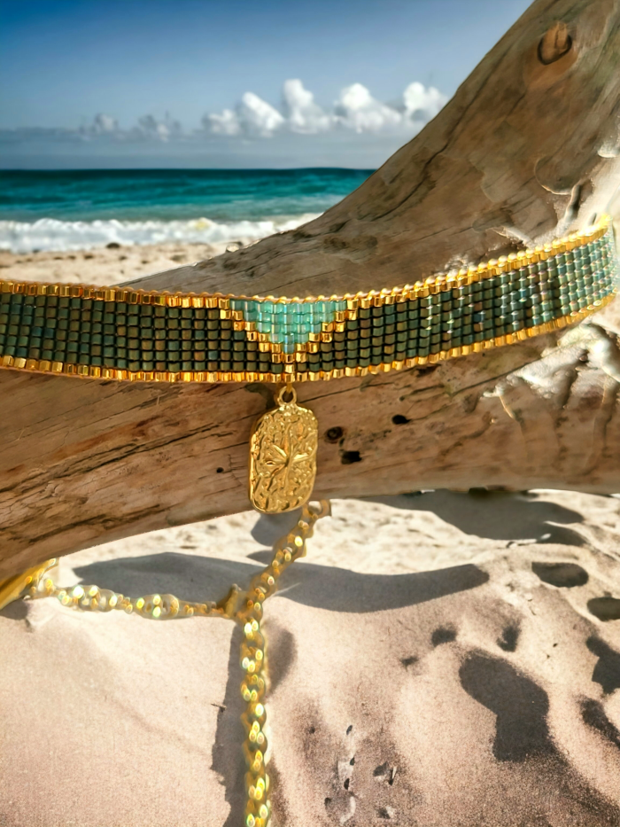 Choker naszyjnik tkany z koralików Miyuki, zielony ze złotym akcentem Runo Leśne