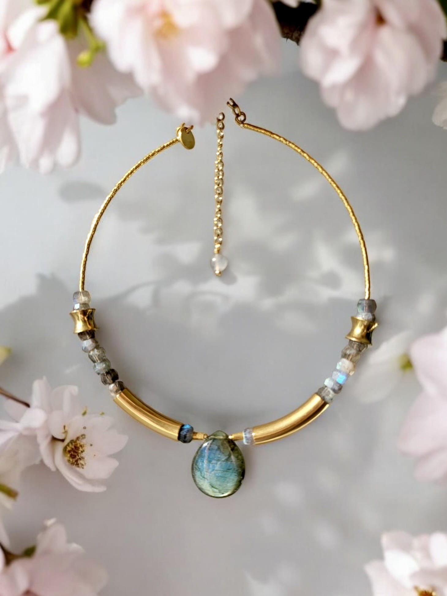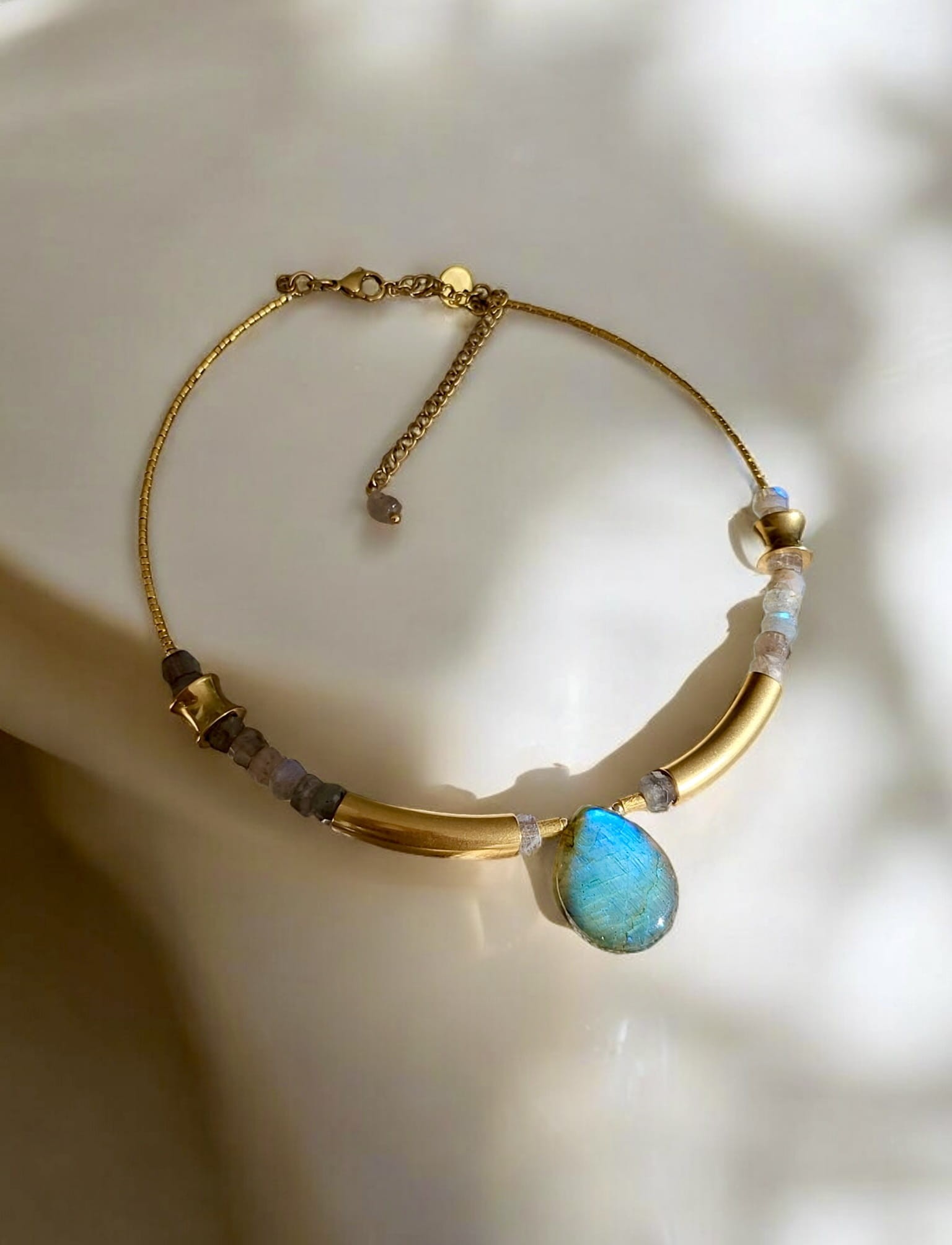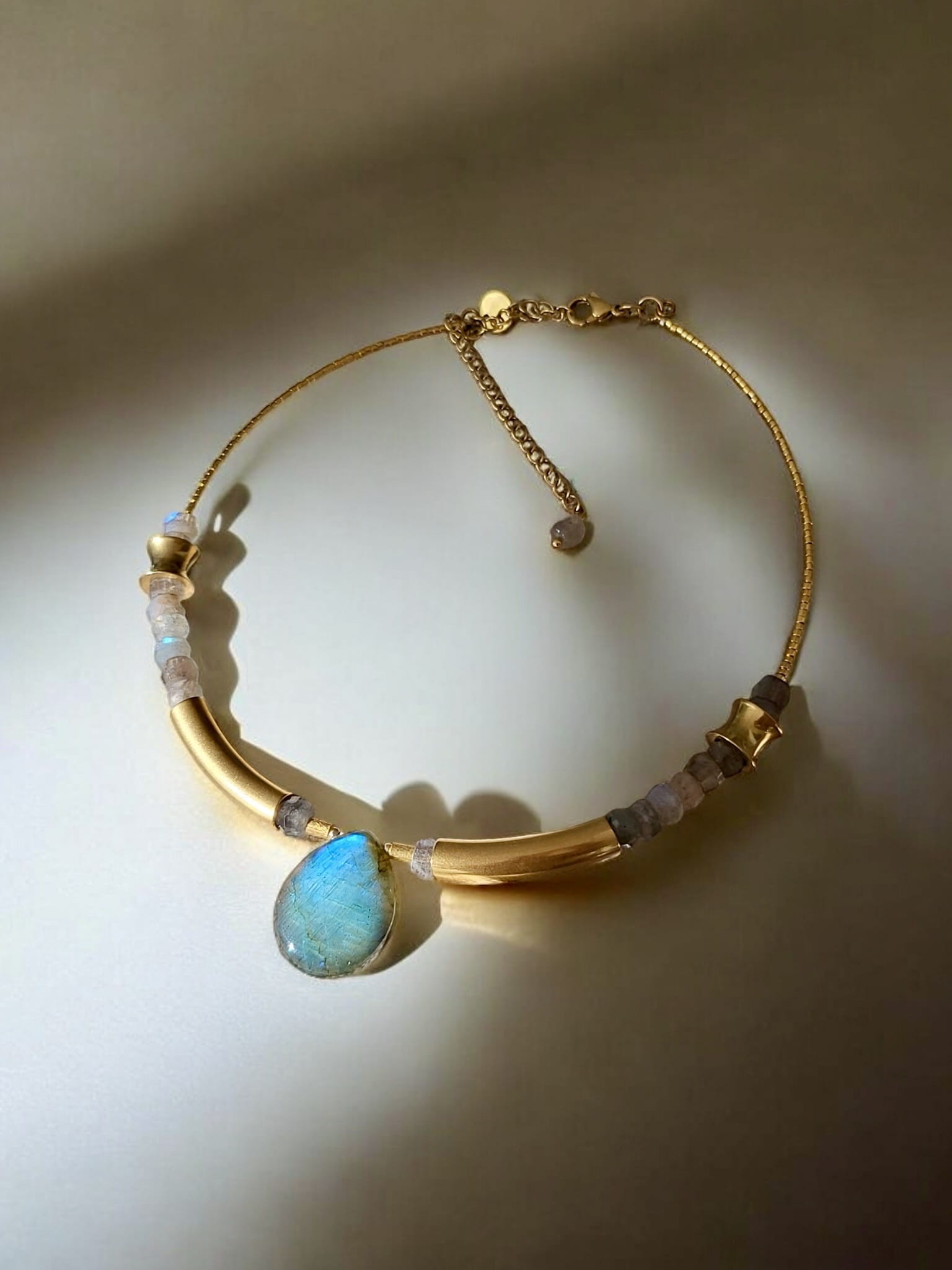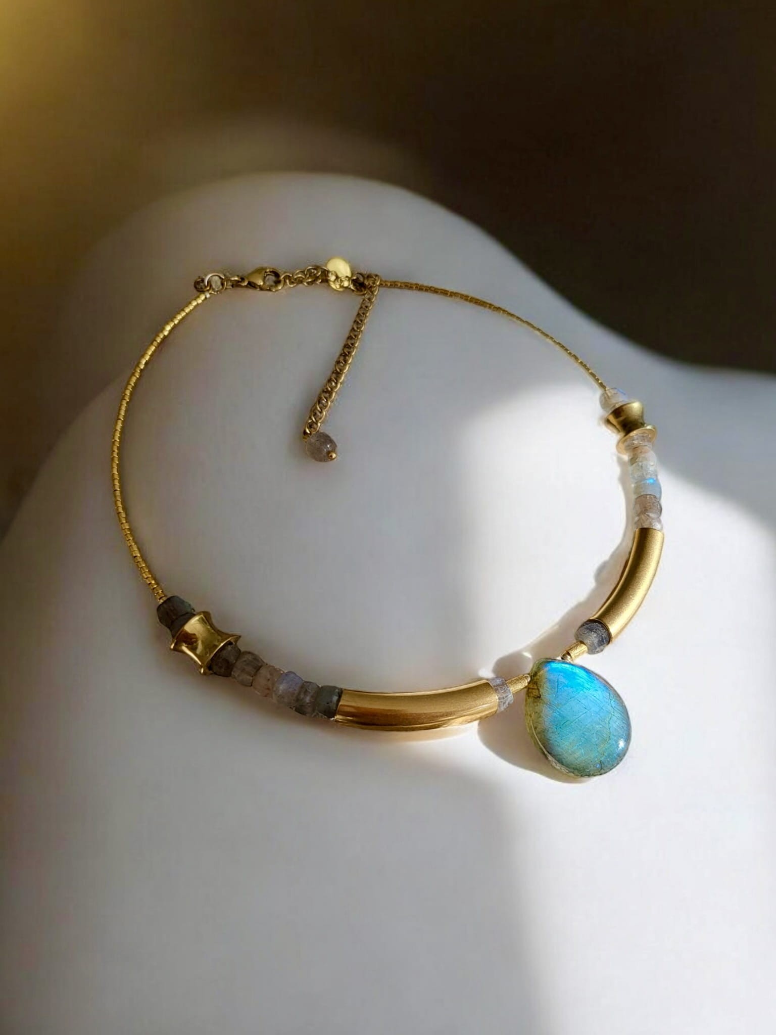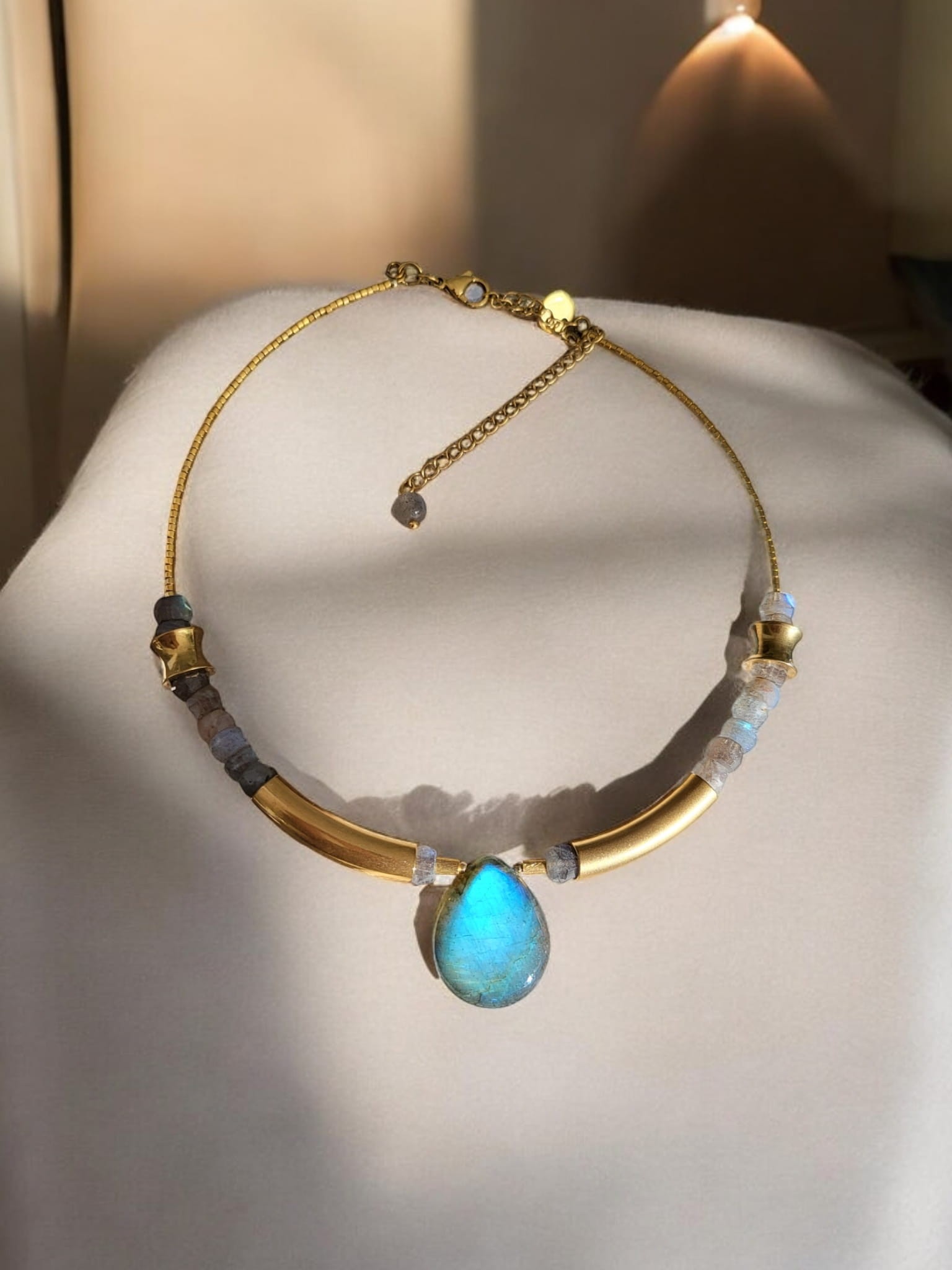 Naszyjnik "Egipska Kropla" – choker z labradorytów klasy A, z masywnymi, pozłacanymi zdobieniami i kroplą labradorytu o intensywnej poświacie. Inspiracja starożytną biżuterią egipską. Edycja limitowana, unikalny design.