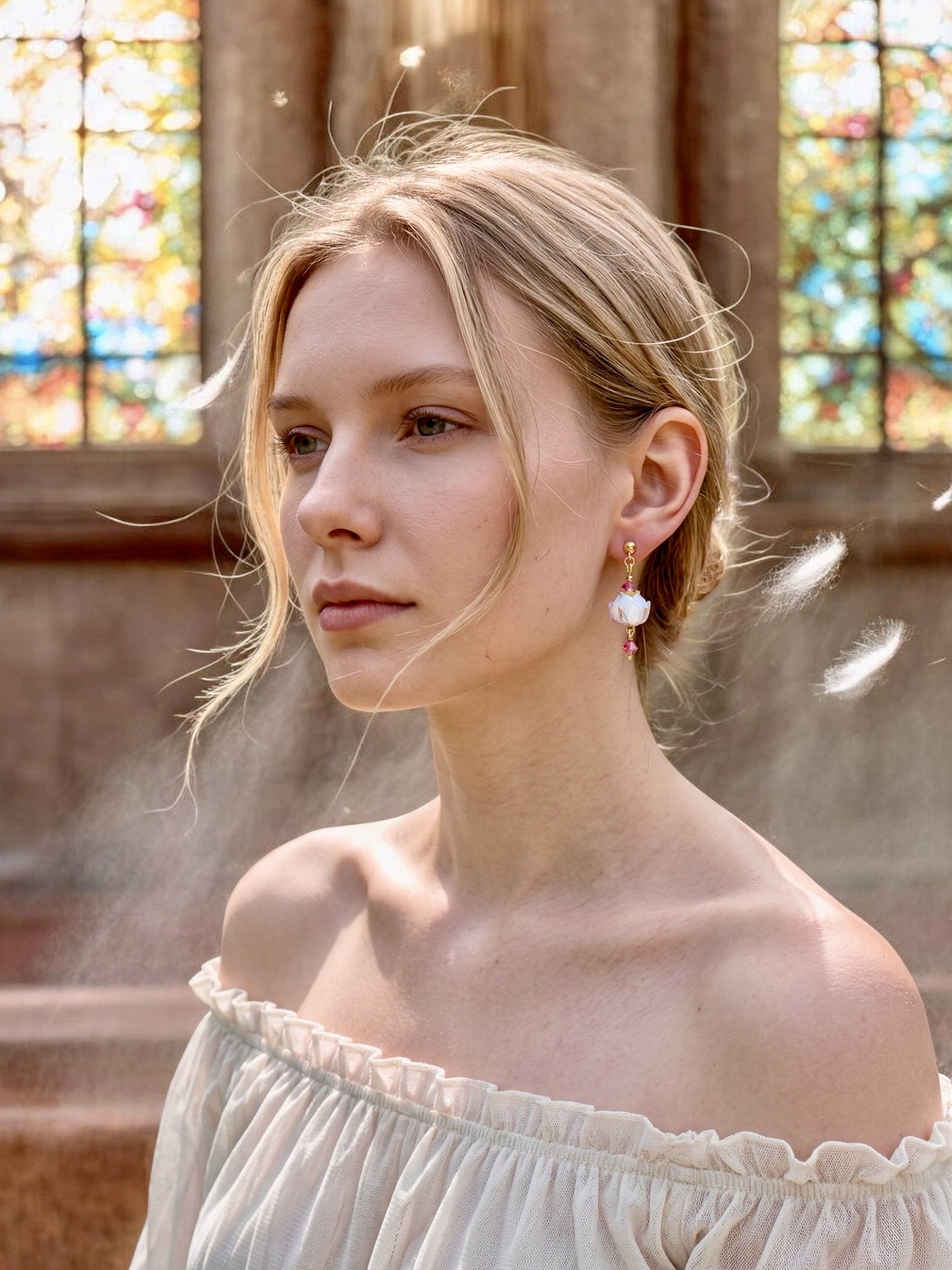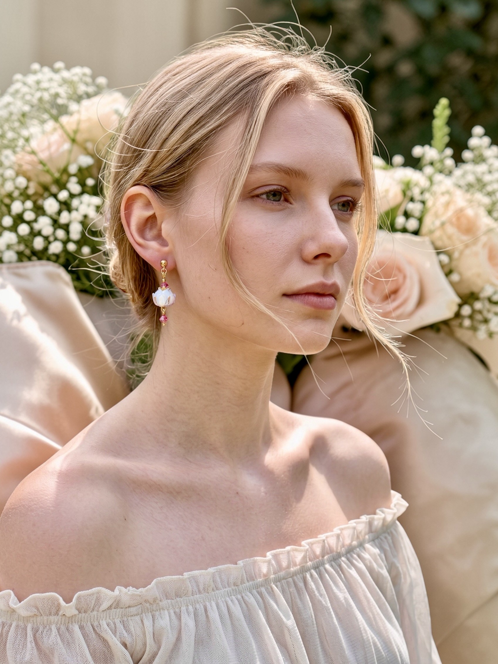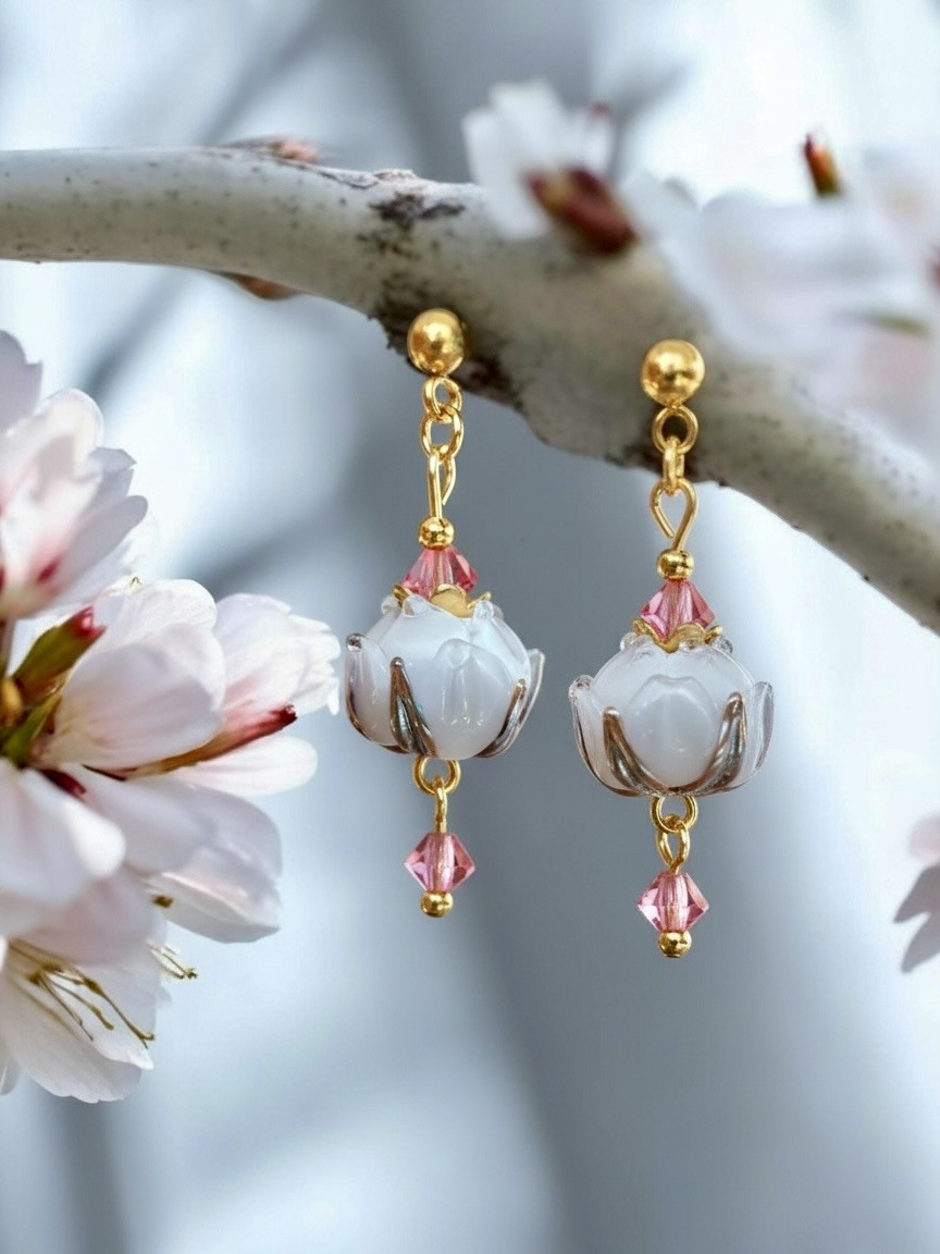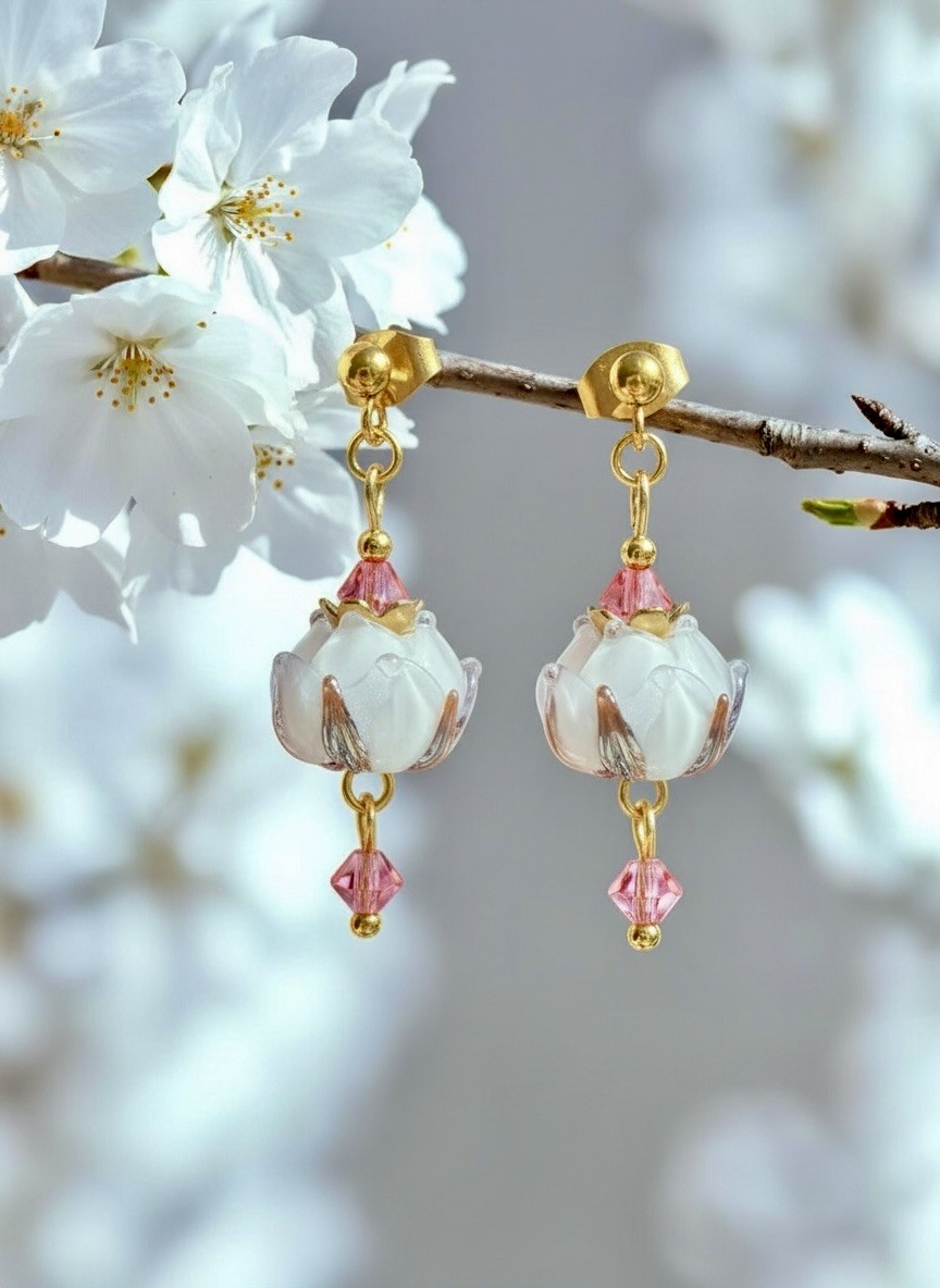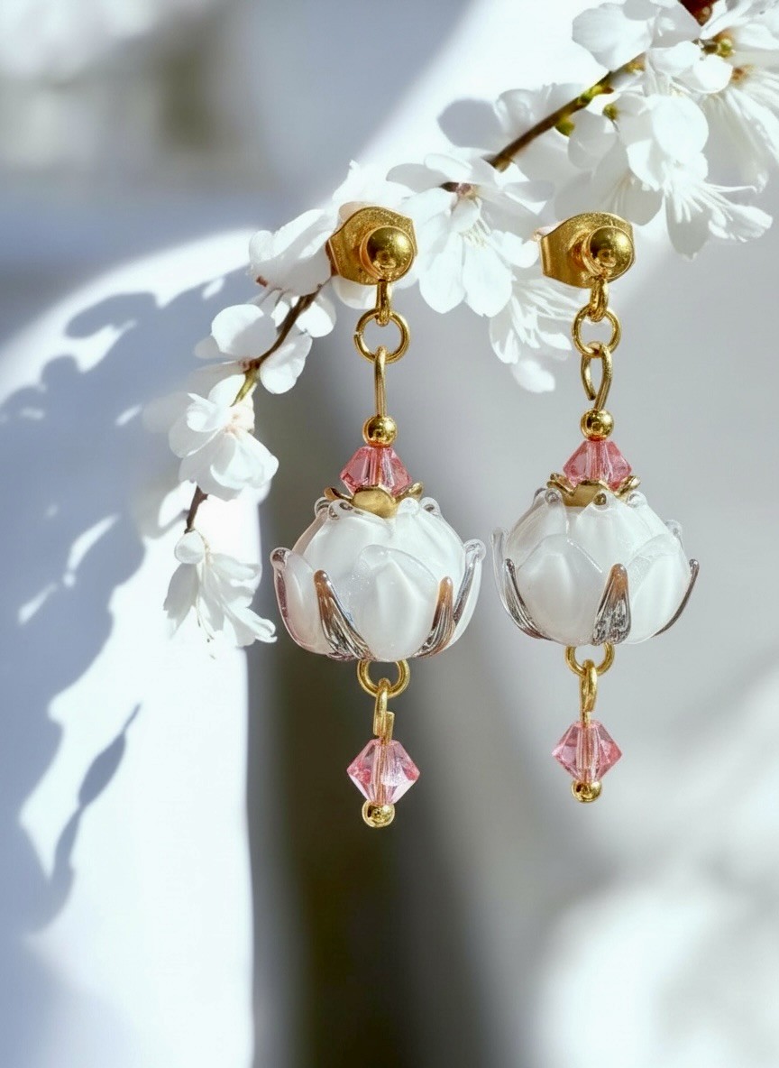 Te zjawiskowe kolczyki przypominają delikatne, rozkwitające kwiaty, w których biel subtelnie przenika się z lawendową poświatą. Ich kolor zmienia się w zależności od światła – czasem są niemal śnieżnobiałe, by za chwilę odkryć romantyczny, pastelowy ton.