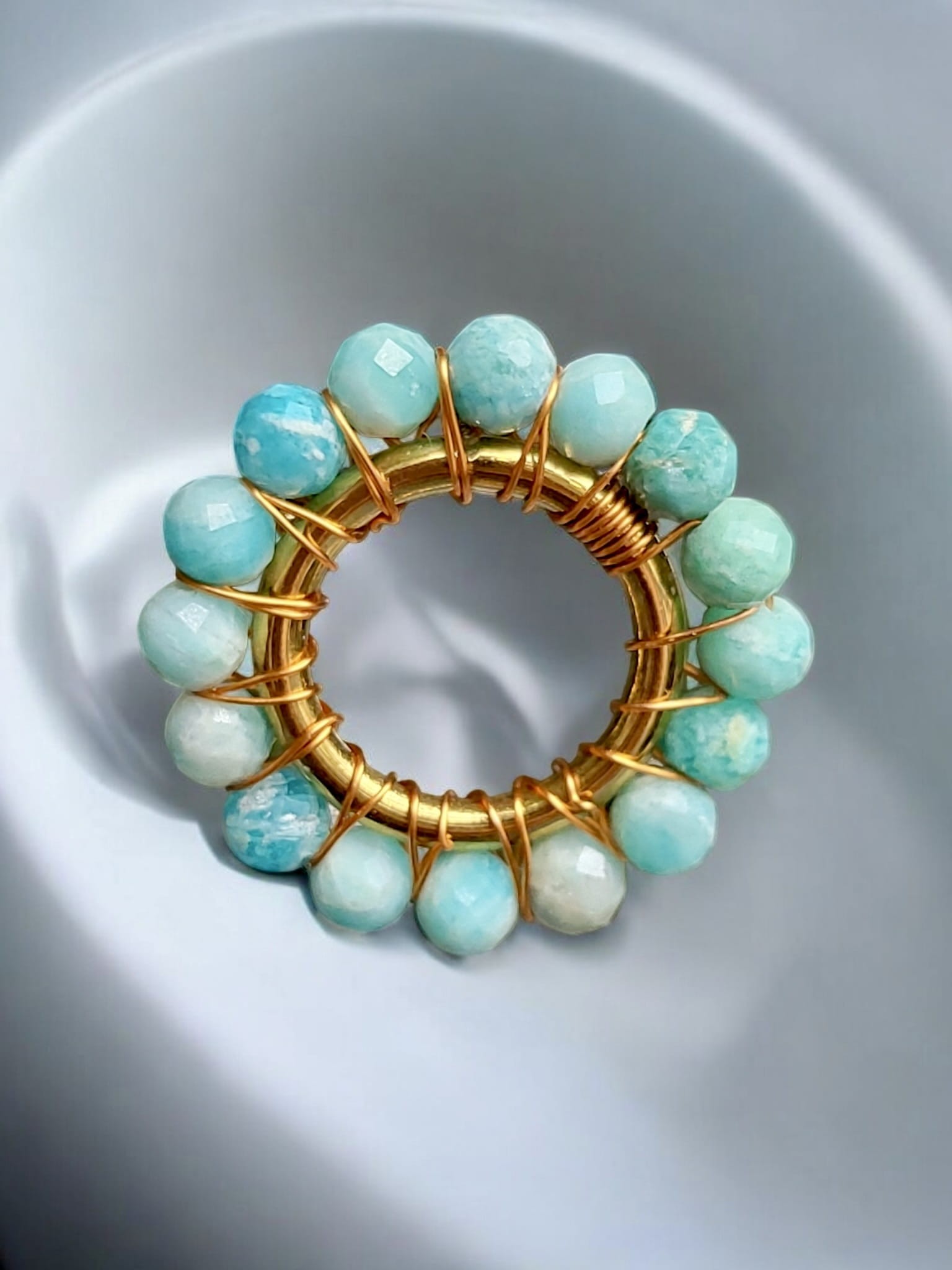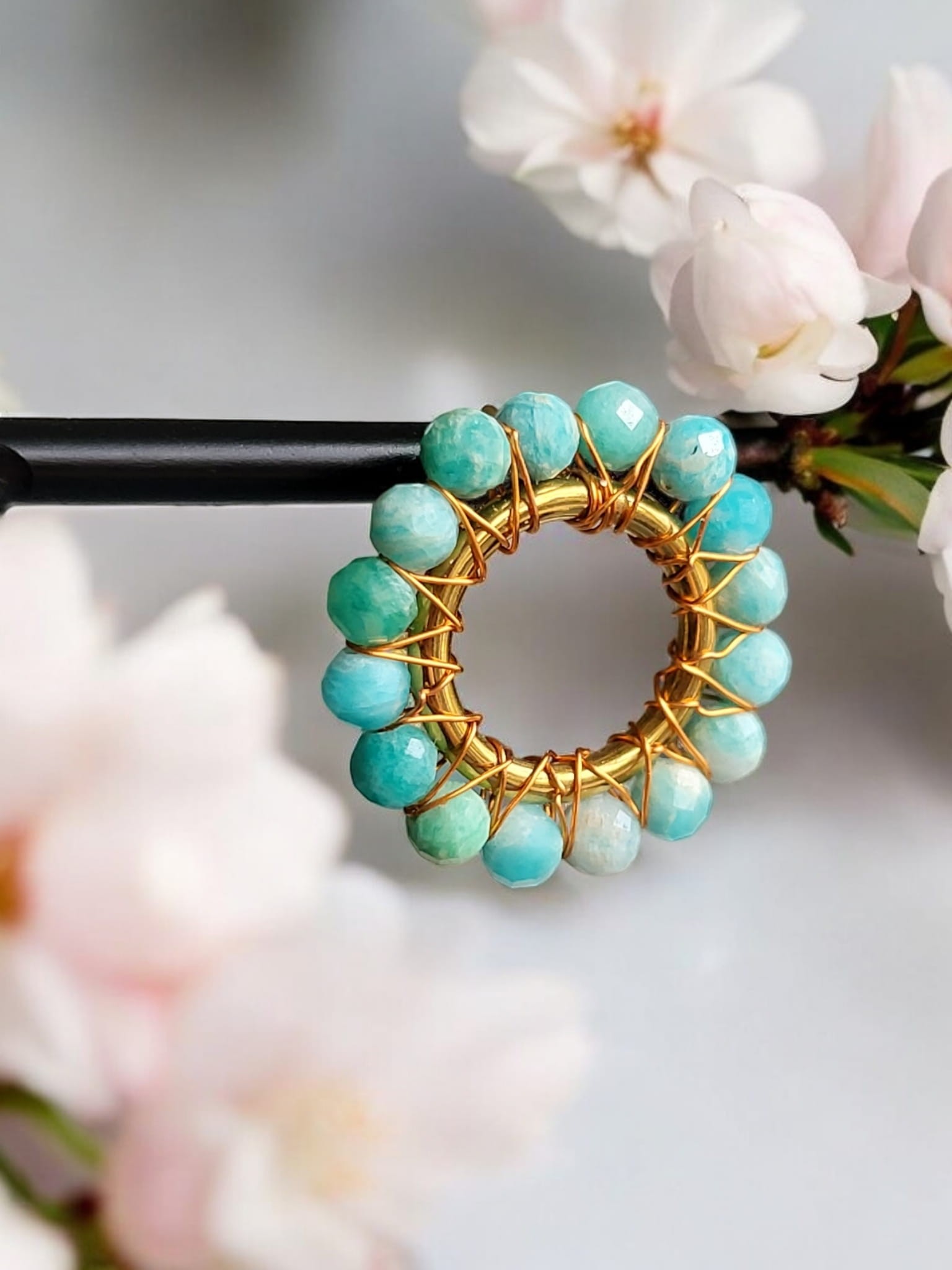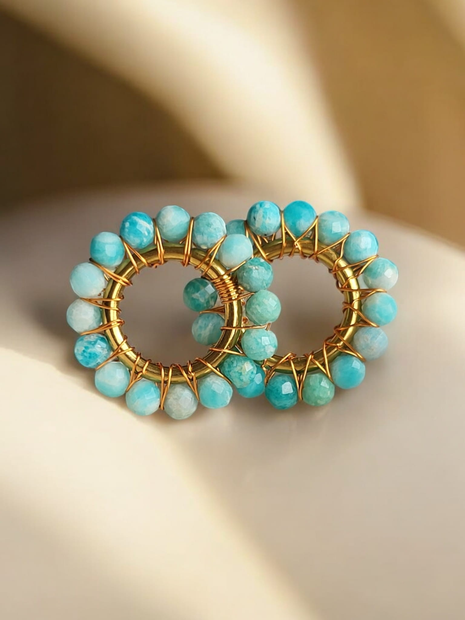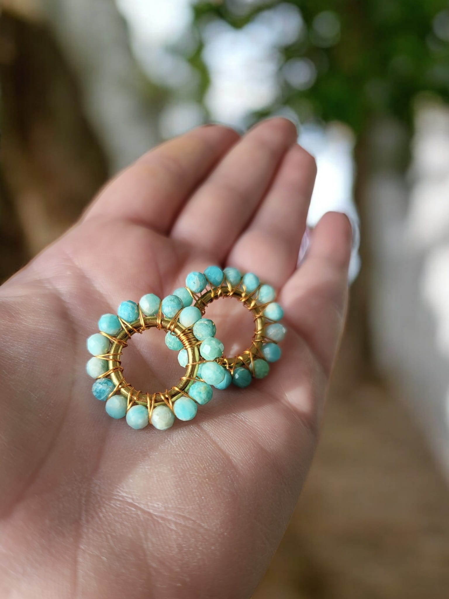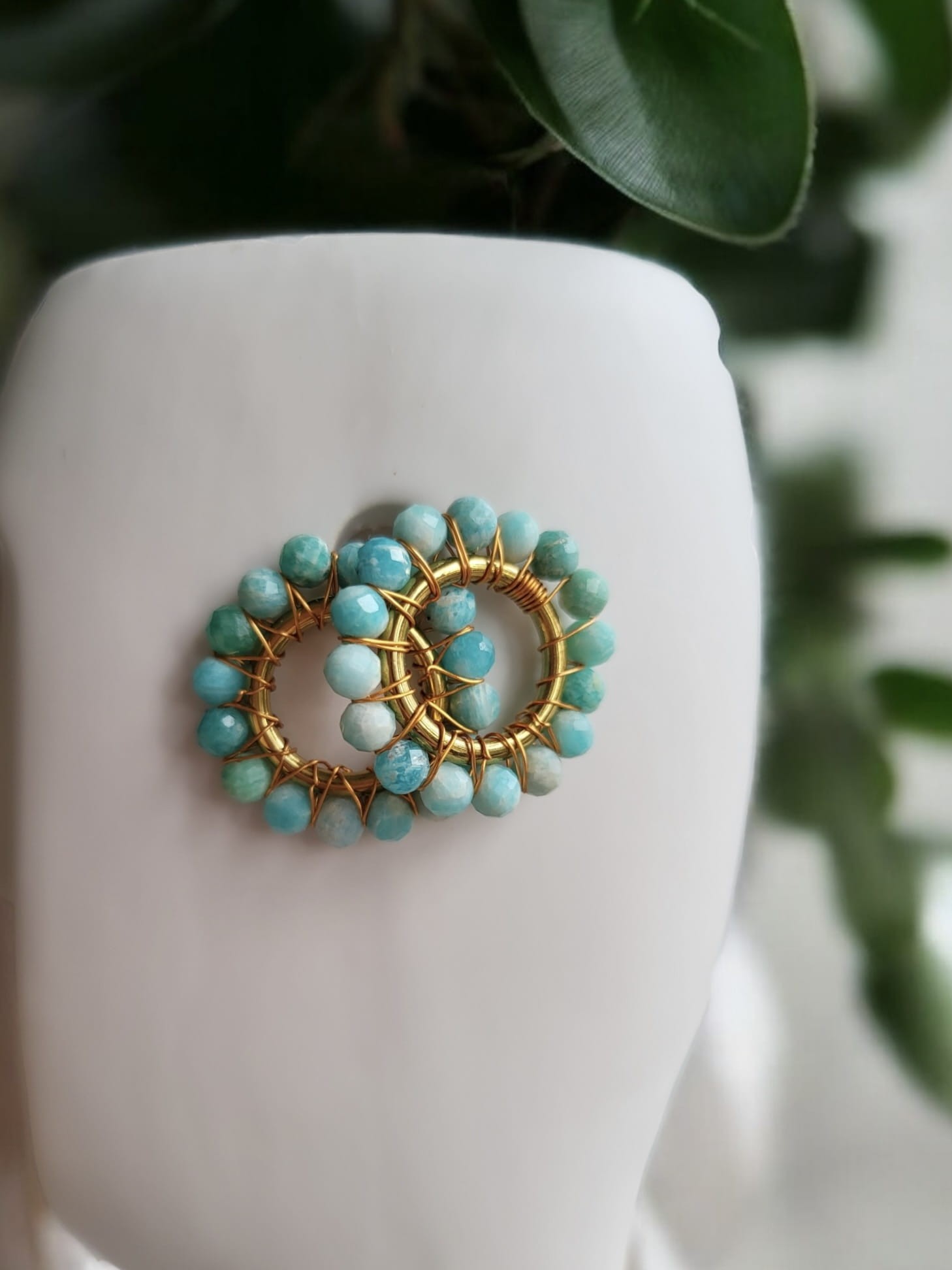 Te przepiękne kolczyki w kształcie kół, o średnicy 2,5 cm, zostały ręcznie oplecione subtelnymi, fasetowanymi amazonitami. Ten wyjątkowy kamień, o delikatnej turkusowej barwie przywodzącej na myśl spokojne morskie fale, symbolizuje harmonię, równowagę i odwagę.