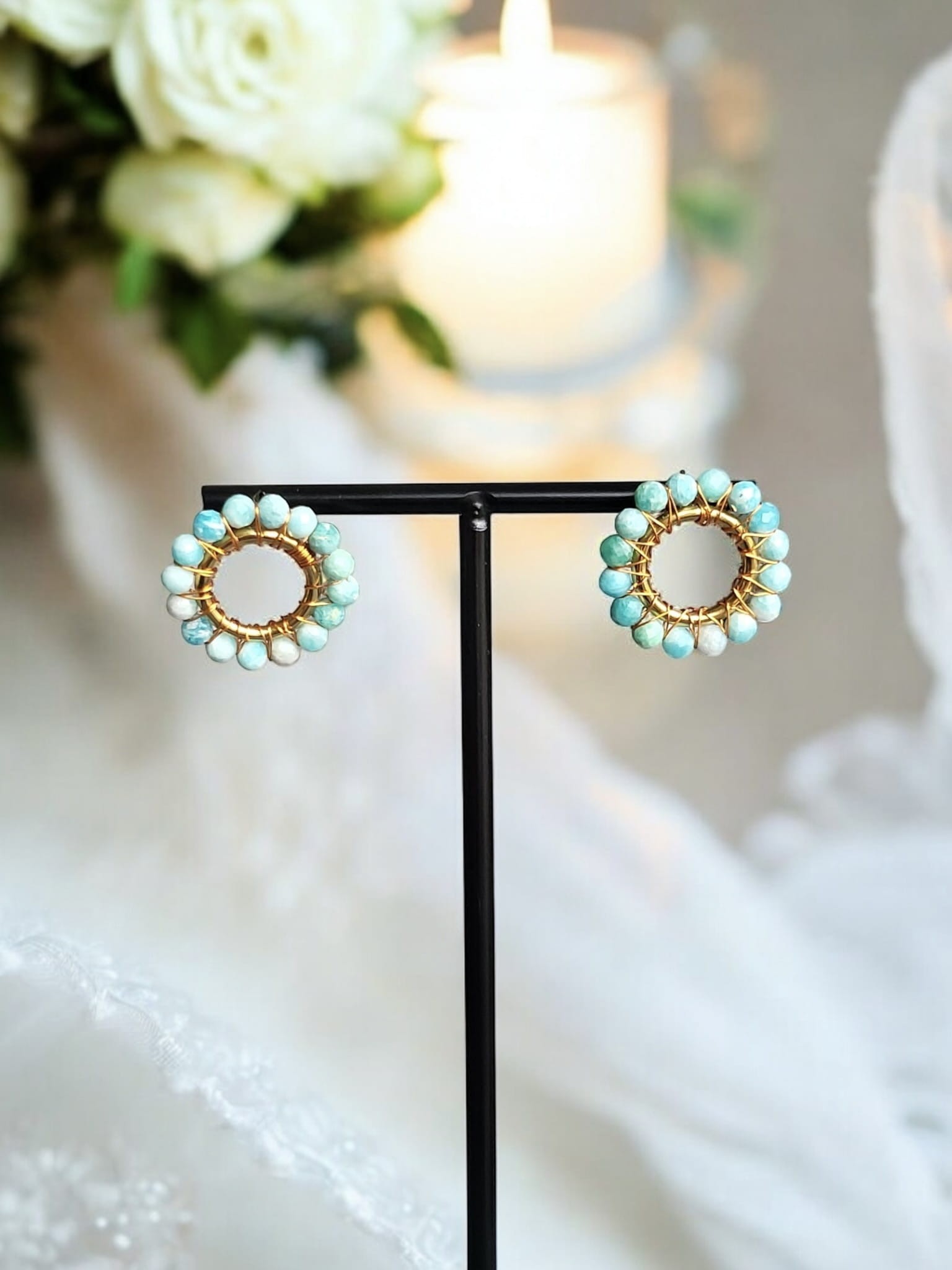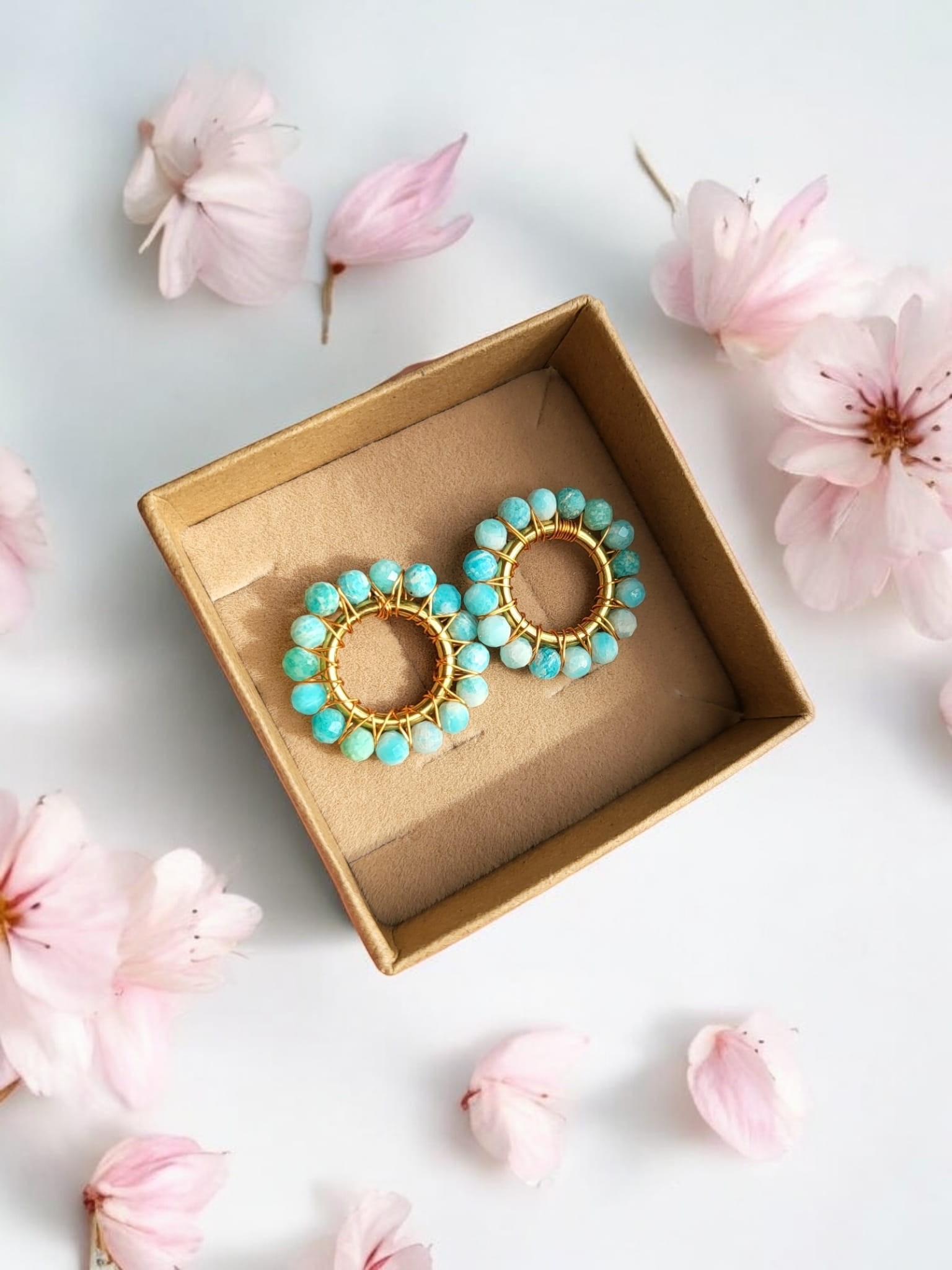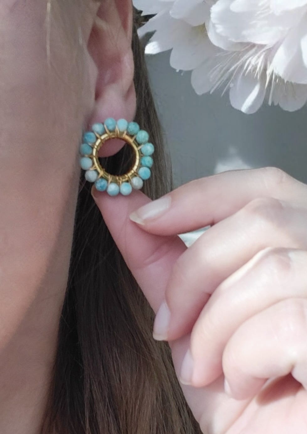 Subtelne koła o średnicy 2,5 cm, ręcznie oplecione fasetowanymi amazonitami w turkusowych odcieniach. Sztyfty z pozłacanej stali szlachetnej dodają elegancji i trwałości. Idealne na co dzień, do pracy i na wyjątkowe okazje. Edycja limitowana!