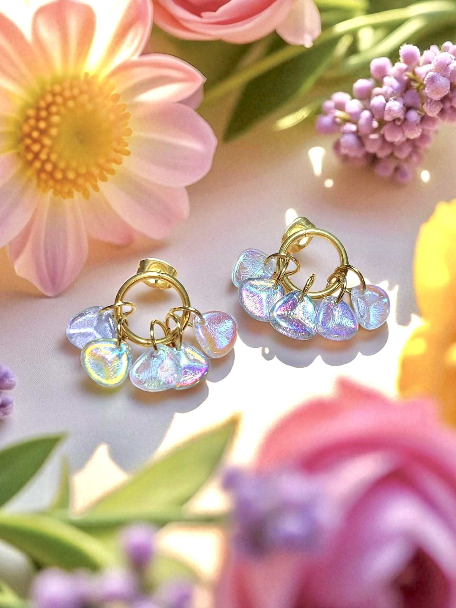 Kolczyki Aurora Pastel to ręcznie wykonana biżuteria stworzona z czeskich szklanych koralików, które mienią się niczym rosa o świcie – w odcieniach bieli, różu, opalu i fioletu. Ich pastelowa poświata odbija światło zjawiskowo, tworząc efekt świetlistych refleksów, które przyciągają spojrzenia i budzą zachwyt.