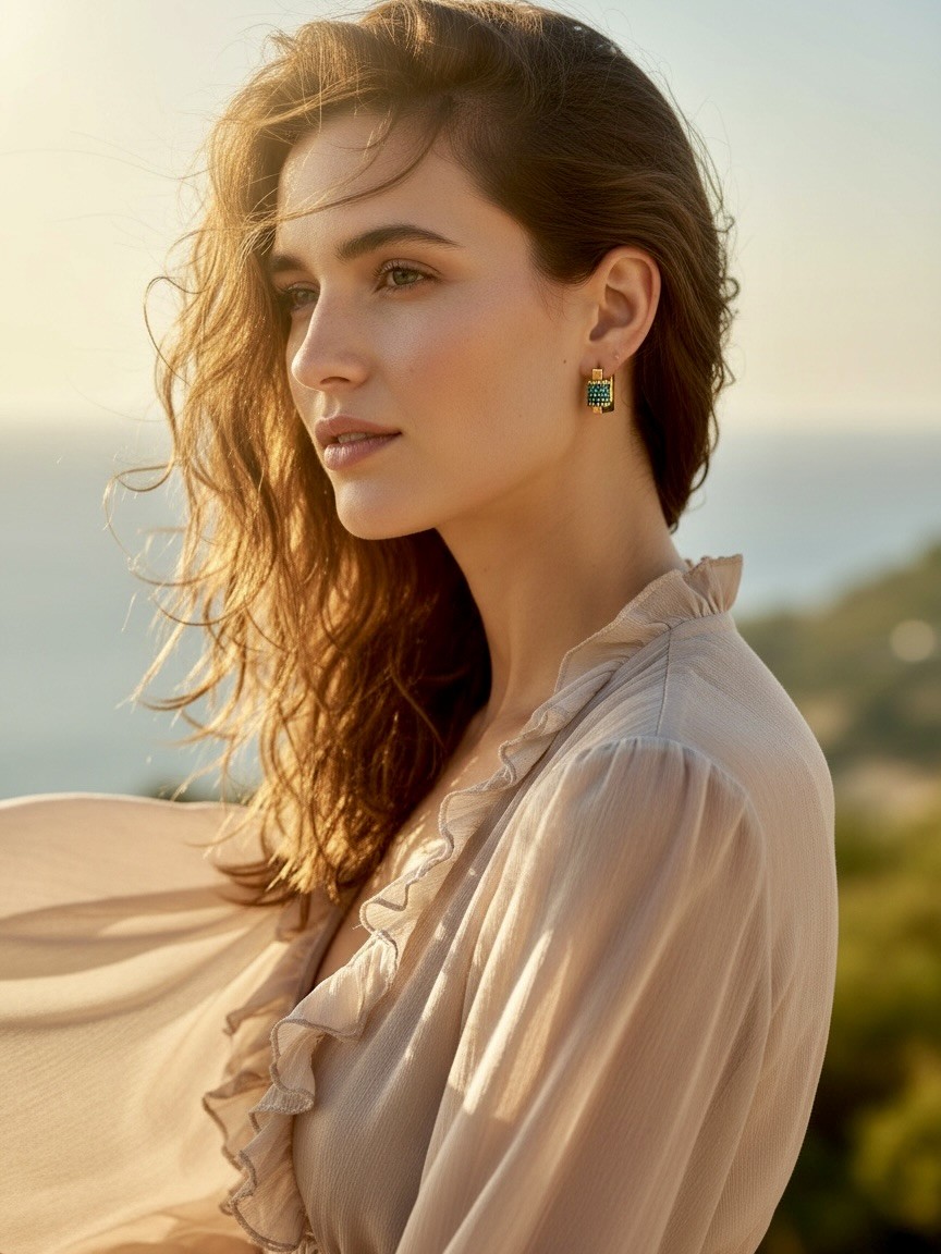 Te kolczyki to esencja nowoczesnej elegancji – geometryczna forma spotyka się tu z niezwykłą głębią koloru. Subtelne przejścia od turkusu do zieleni tworzą efekt ombre, który przyciąga spojrzenia i pięknie pracuje ze światłem.