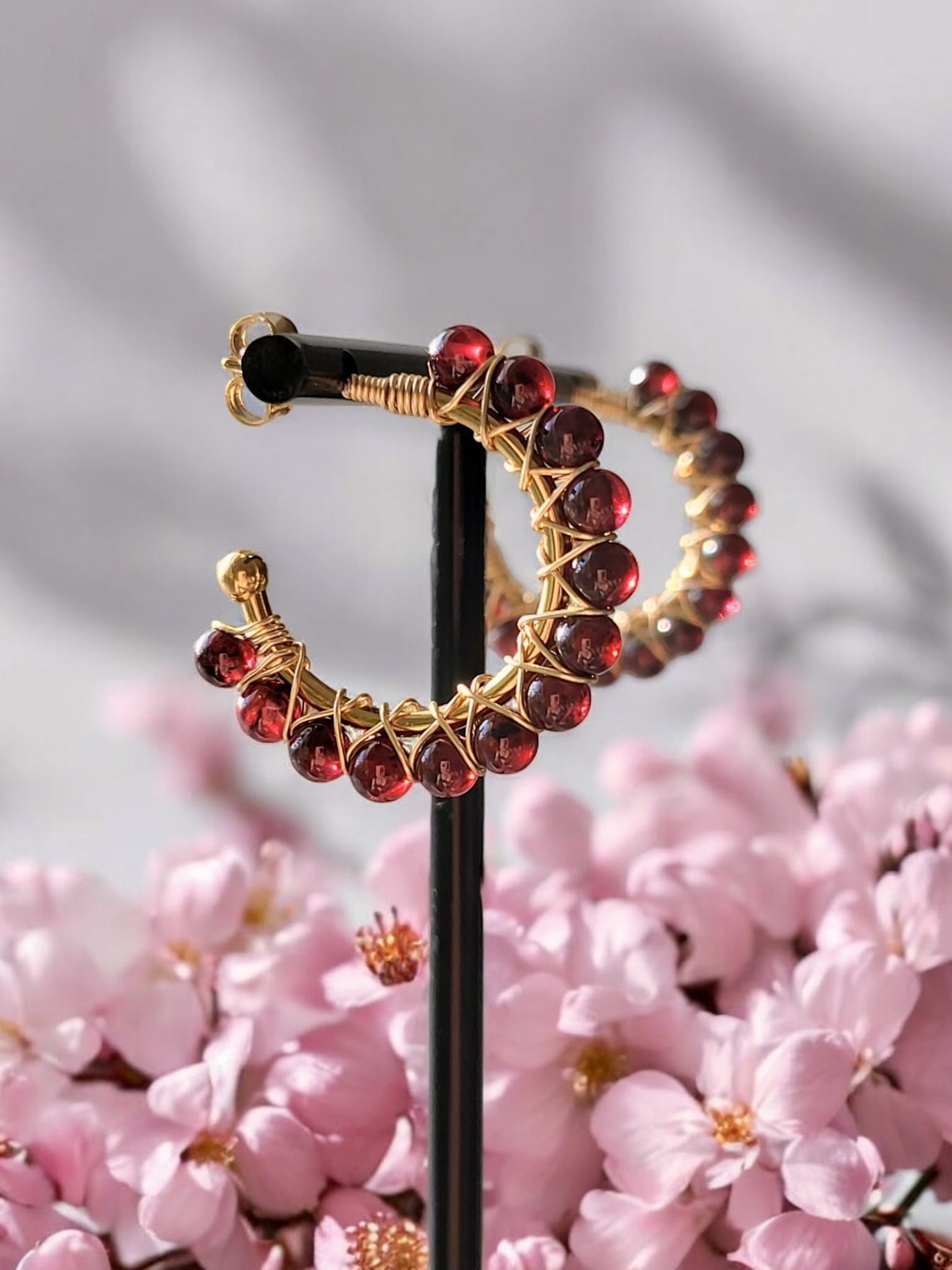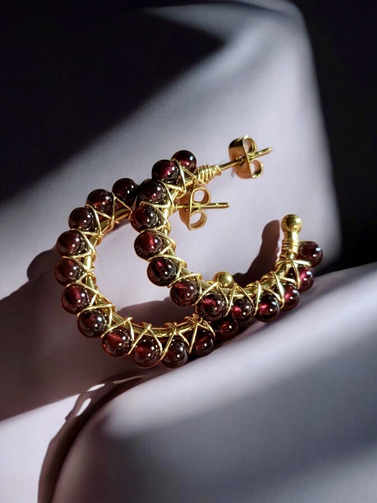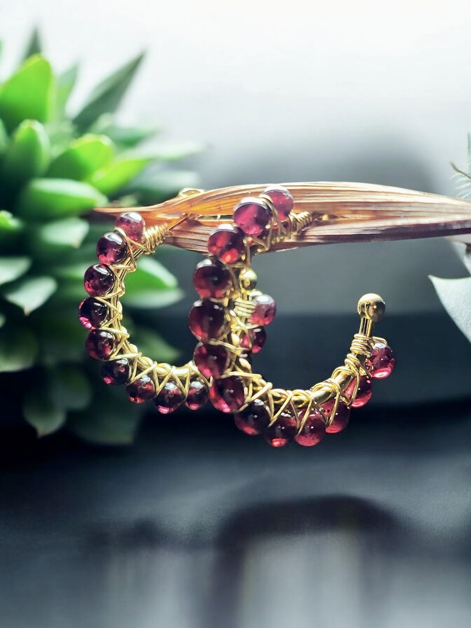 Poznaj kunszt i piękno w czystej postaci z kolczykami "Bordowy Blask", które zachwycają połączeniem naturalnych granatów klasy AA i delikatnego złotego połysku stali szlachetnej. W kształcie subtelnie niedomkniętego koła, te kolczyki o średnicy około 2,5 cm są prawdziwą esencją wyrafinowania.