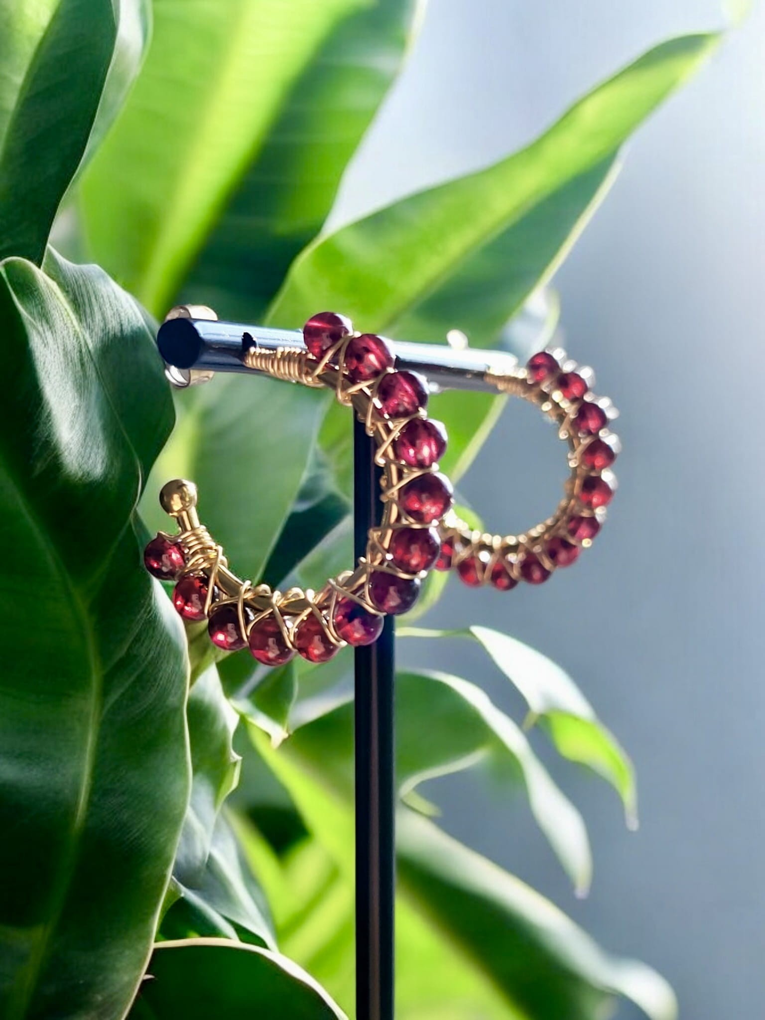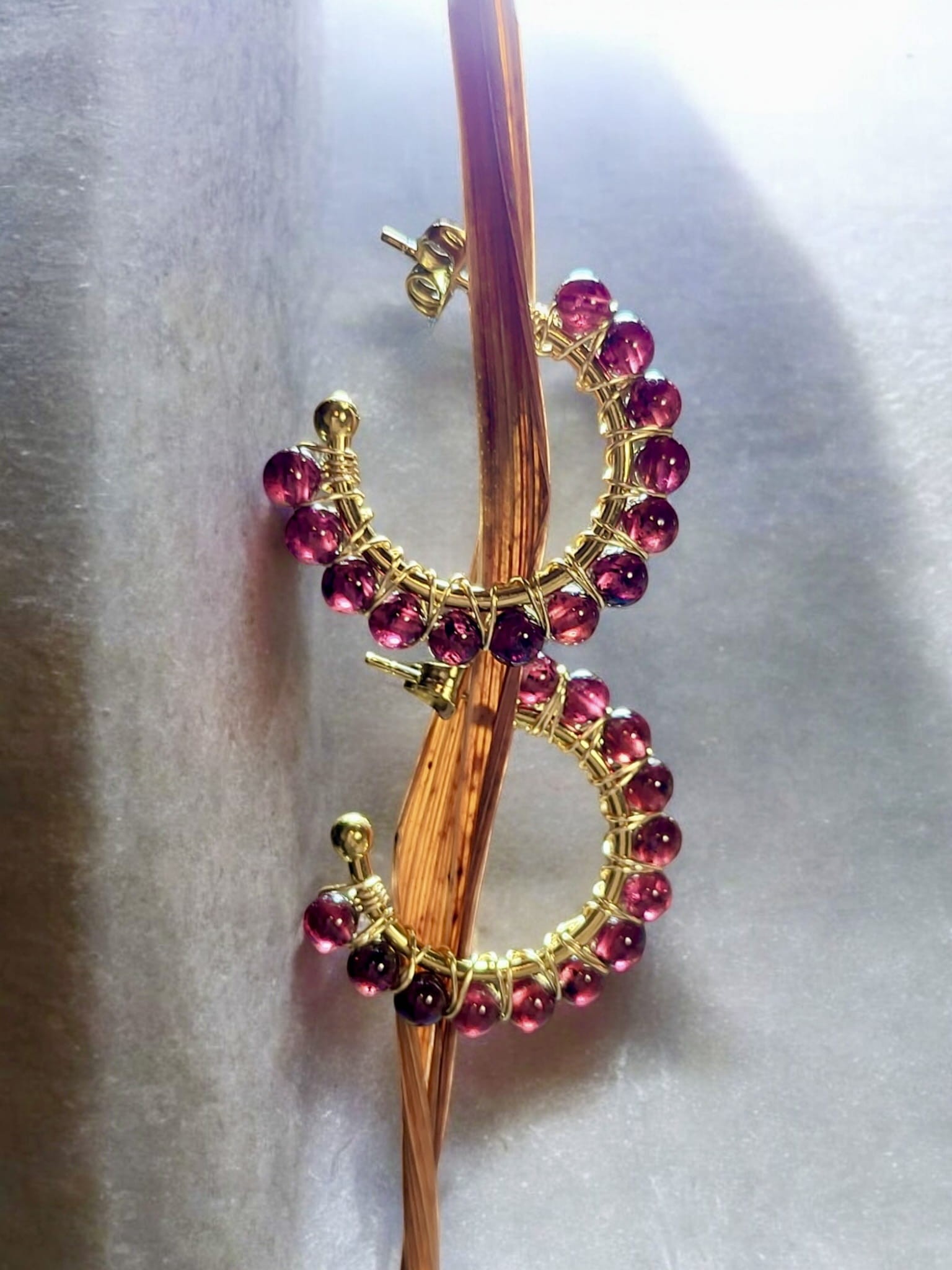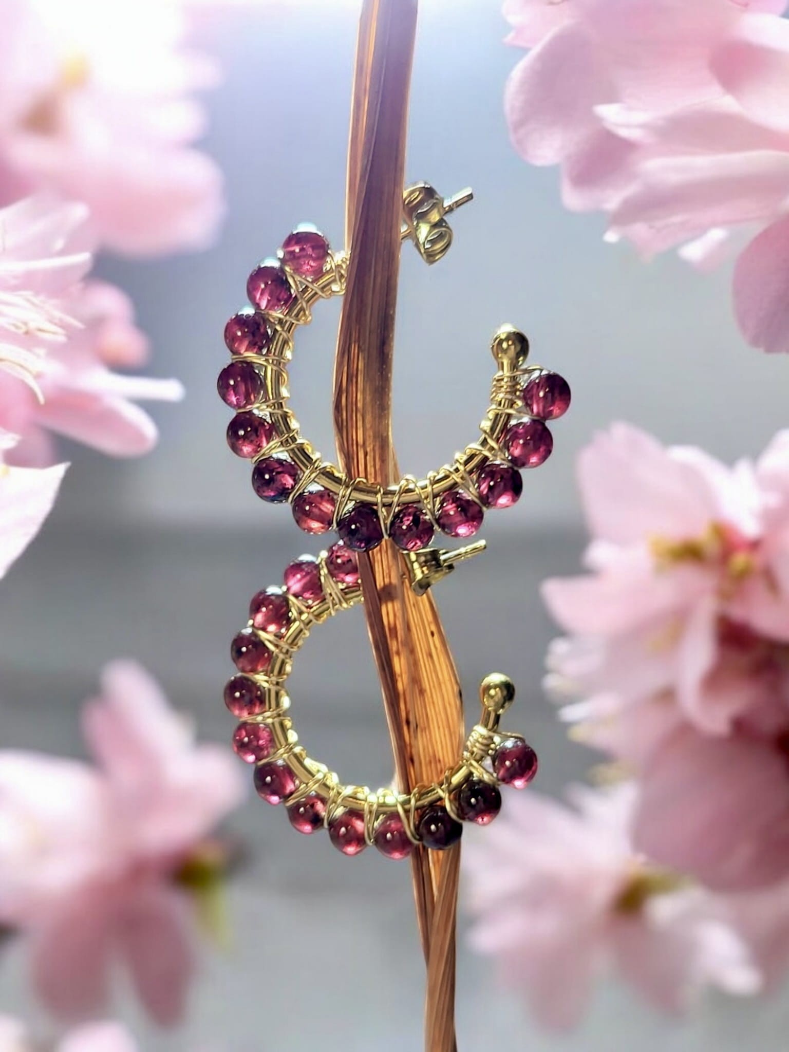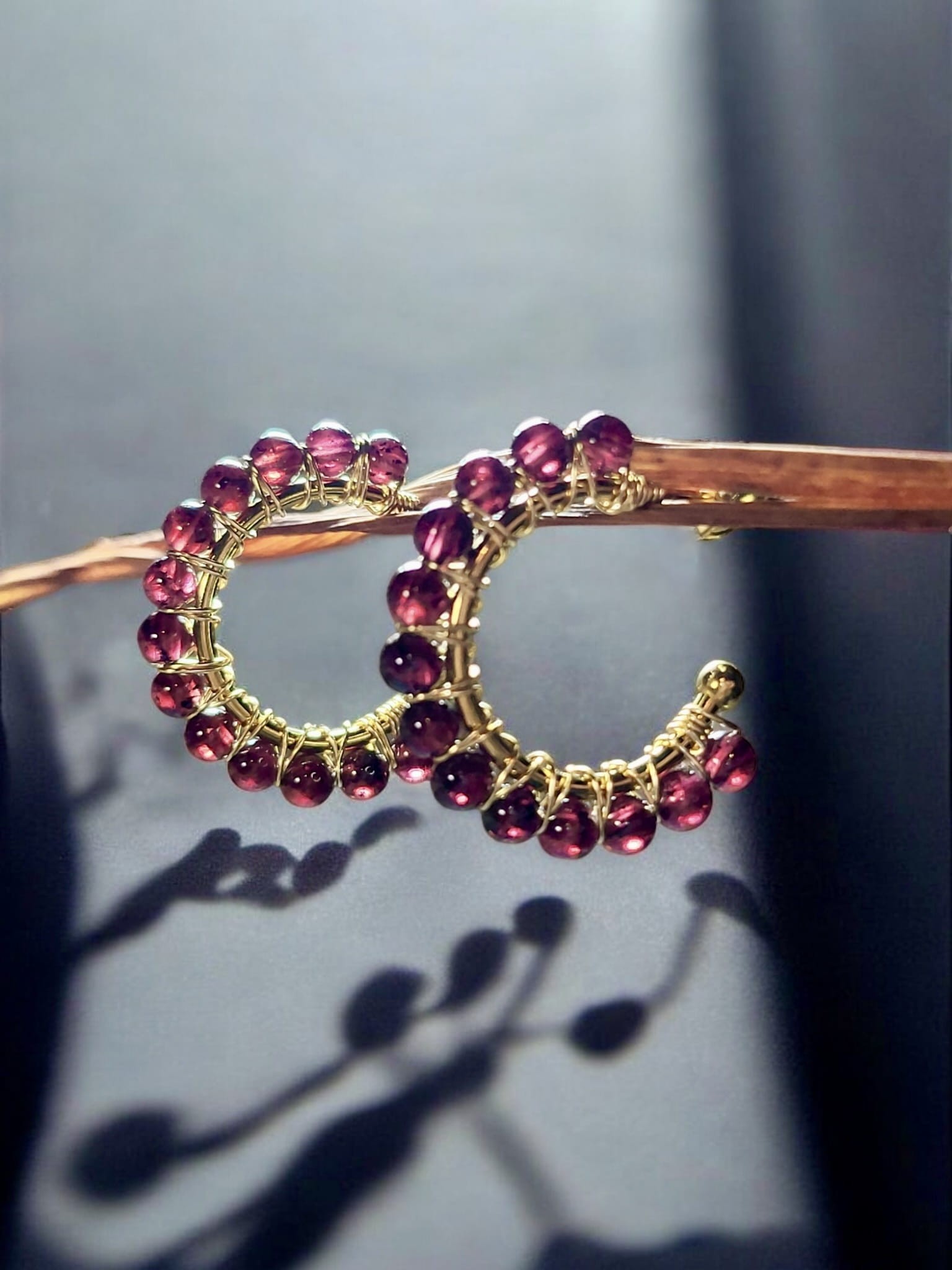 Poznaj kunszt i piękno w czystej postaci z kolczykami "Bordowy Blask", które zachwycają połączeniem naturalnych granatów klasy AA i delikatnego złotego połysku stali szlachetnej. W kształcie subtelnie niedomkniętego koła, te kolczyki o średnicy około 2,5 cm są prawdziwą esencją wyrafinowania.