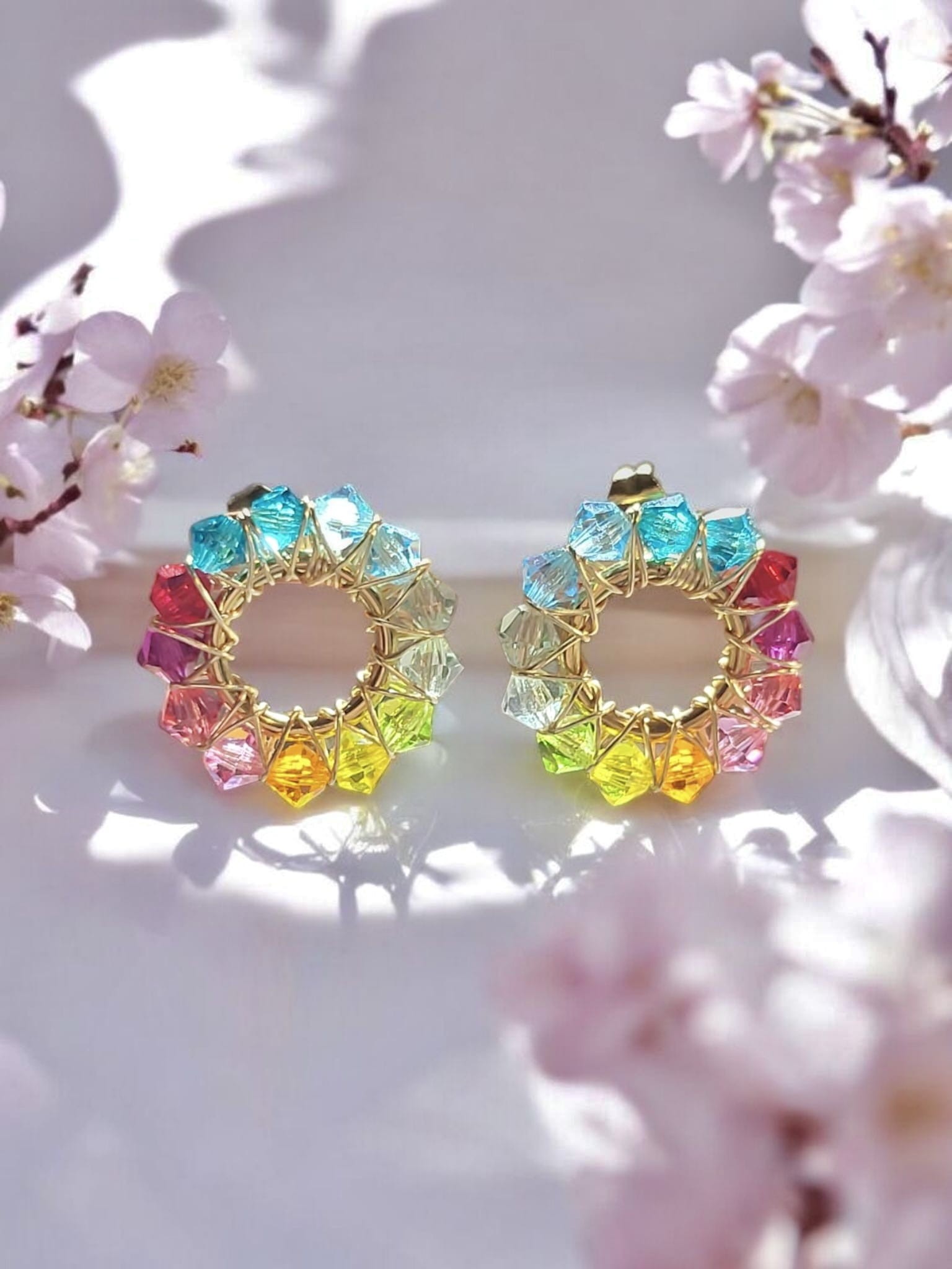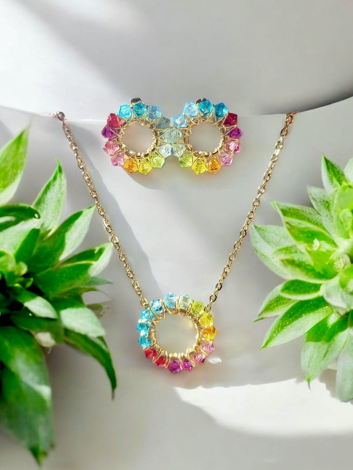 Komplet biżuterii naszyjnik, kolczyki Tęczowa Magia – ręcznie oplatane kryształki, stal szlachetna