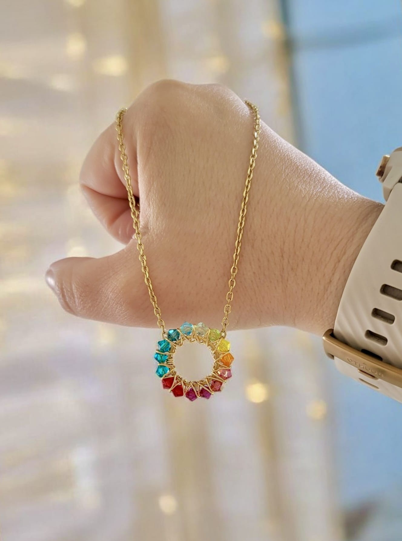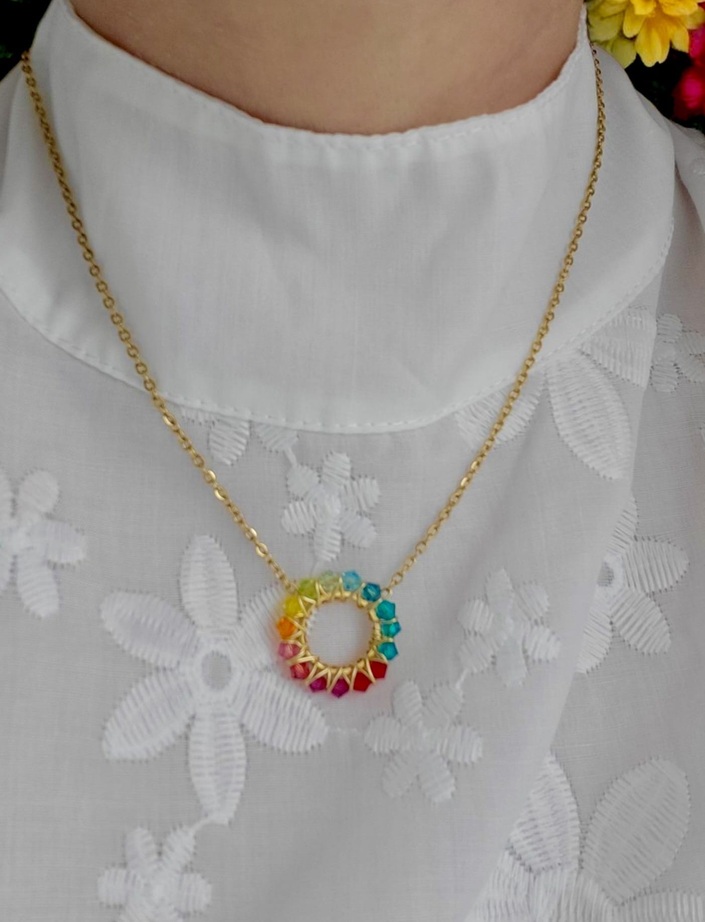 W świecie, w którym wszystko wygląda podobnie, postaw na to, co naprawdę wyjątkowe. Przed Tobą komplet „Tęczowa Magia” – naszyjnik i kolczyki, które łączą ręczne rzemiosło z pięknym blaskiem kryształków w spektakularnych kolorach ombre. To nie tylko biżuteria – to energia, światło i dobre wibracje, które możesz mieć zawsze przy sobie.