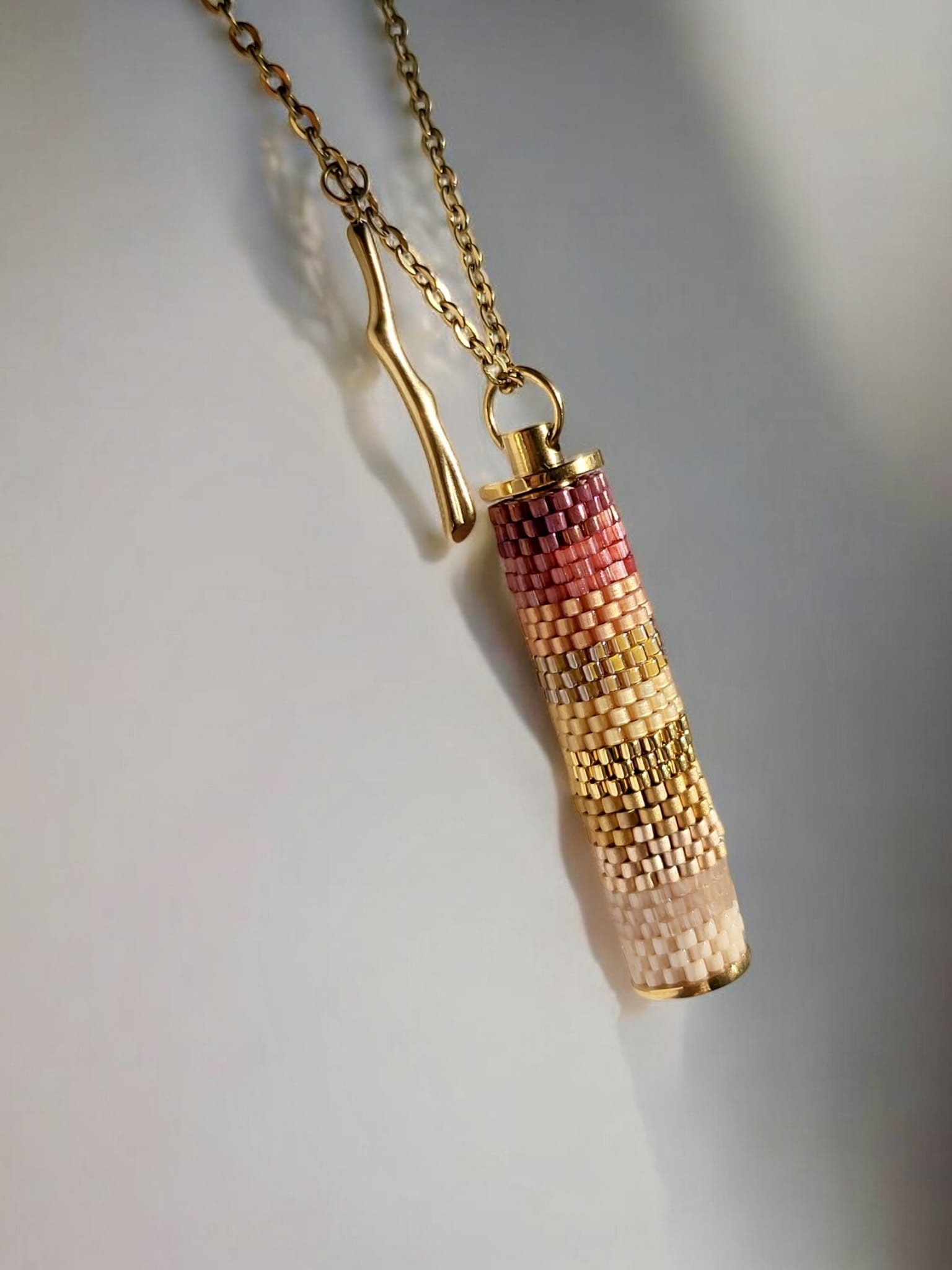 - Unikatowy design: Złoty patyczek koralowy dodatkowo zdobi naszyjnik, przyciągając uwagę niebanalnym kształtem. Ta unikatowa forma i ręczna praca sprawiają, że naszyjnik jest jak jesienna inspiracja, zamknięta w biżuterii.