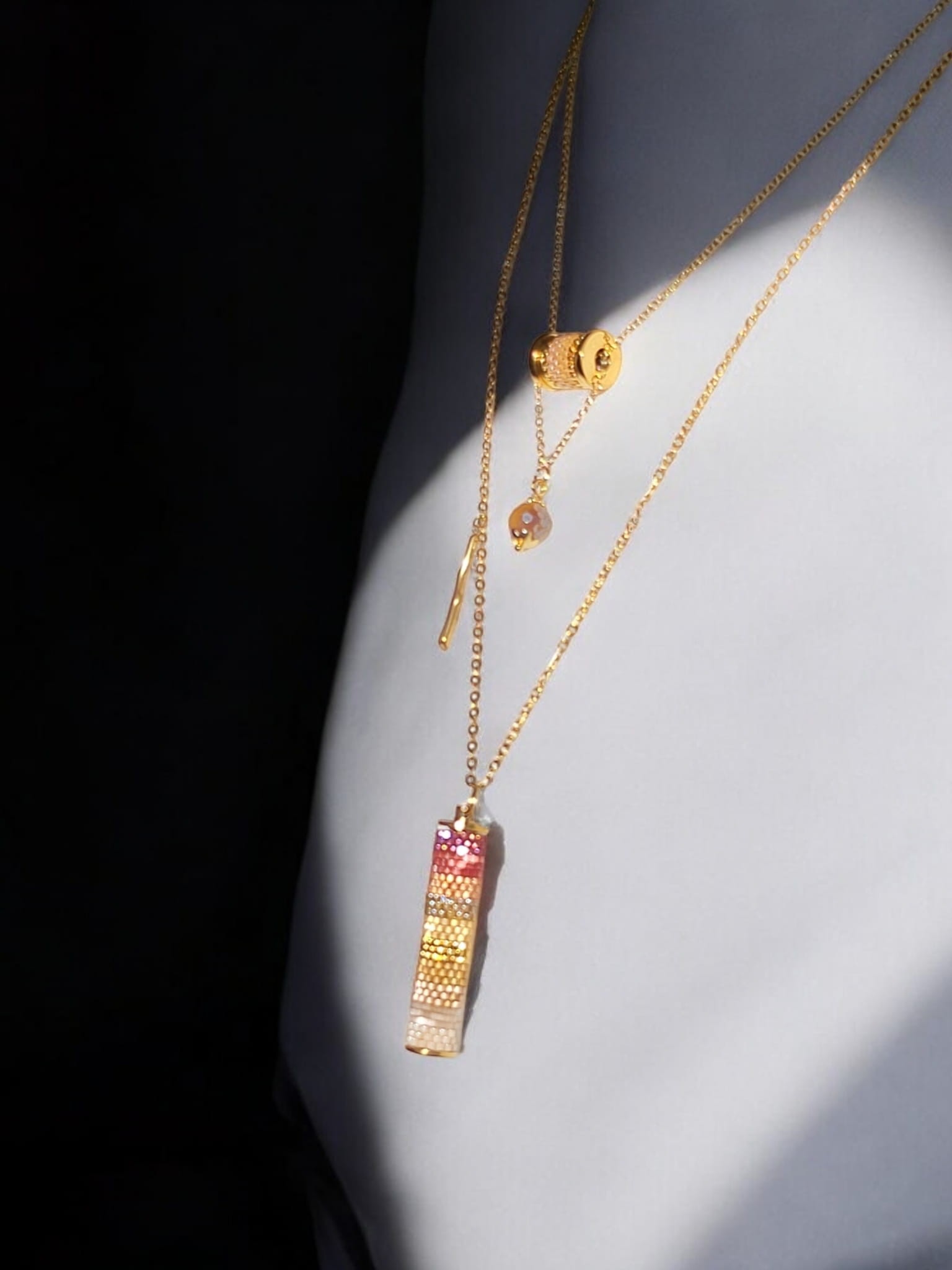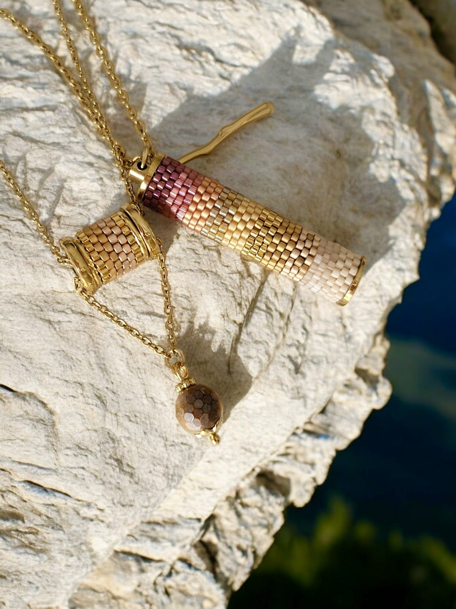 - Dwa naszyjniki, które razem tworzą pełną blasku, jesienną harmonię. Możesz nosić je razem lub osobno, tworząc unikalne zestawienia i ciesząc się niepowtarzalnym stylem każdego dnia.