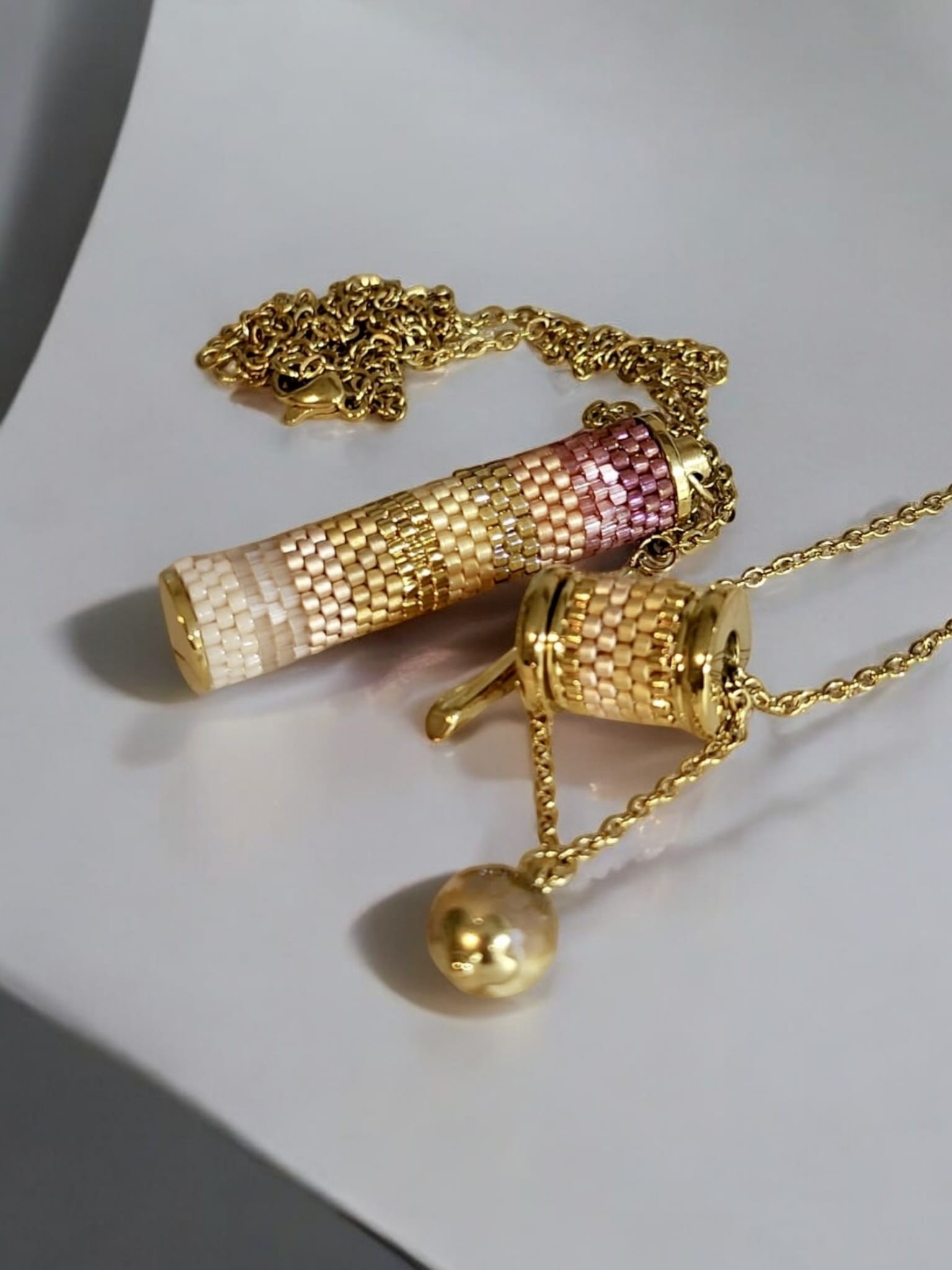 - Ręczne tkanie i precyzja: Długi naszyjnik z imponującą, 4,5-centymetrową zawieszką, cudownie mieniącą się w świetle. Każdy koralik został starannie ułożony, aby stworzyć spektakularny efekt.