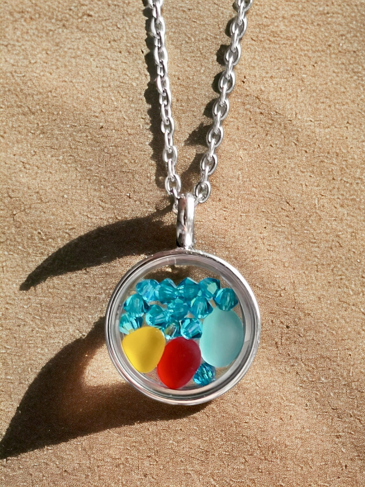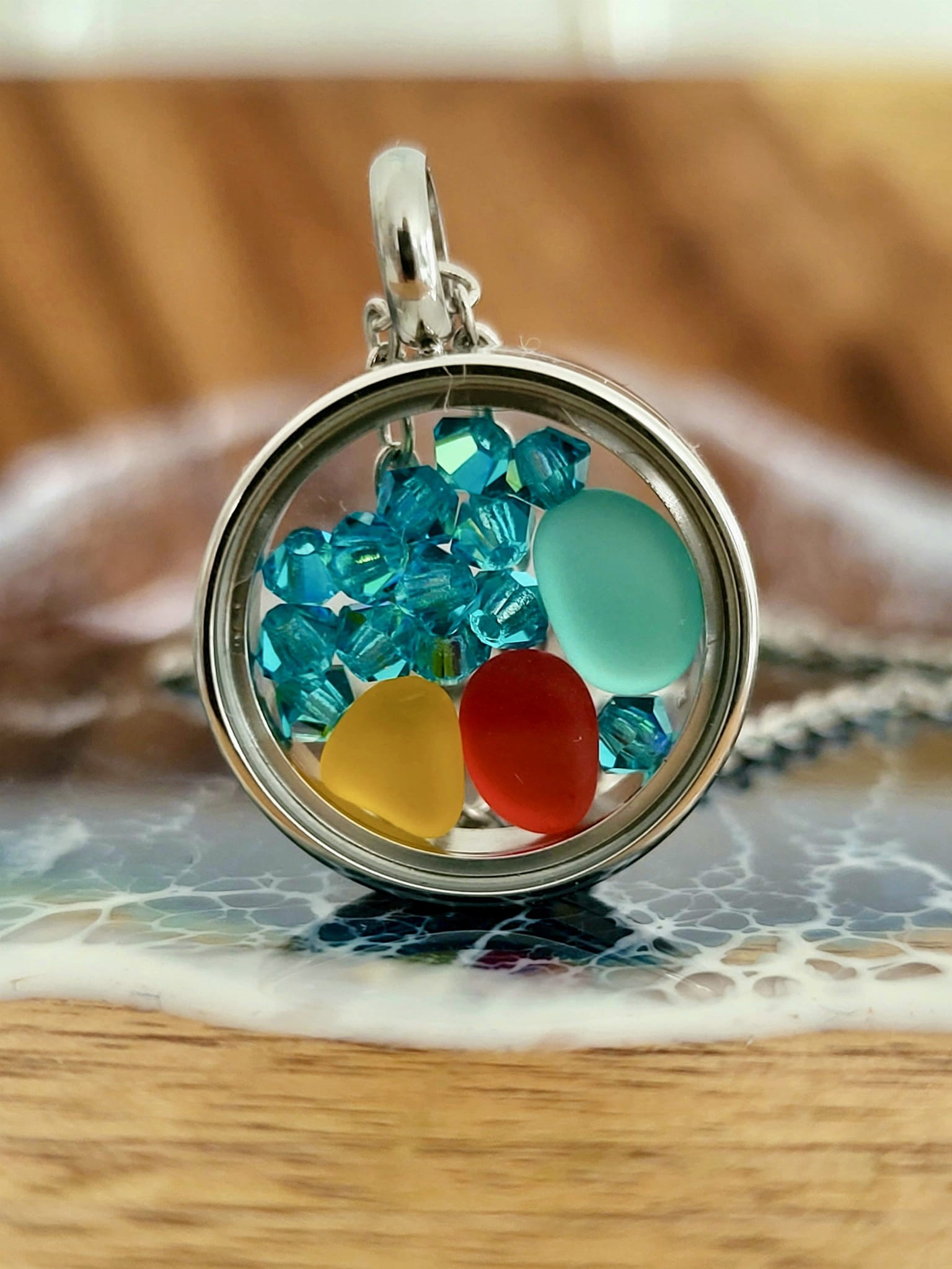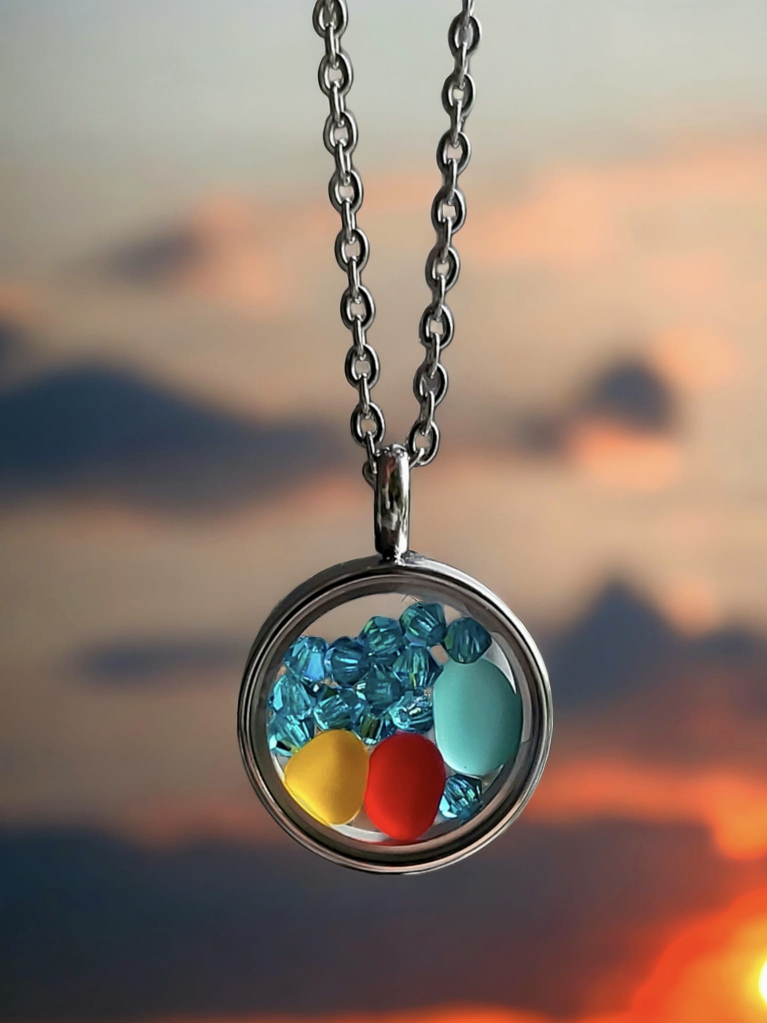 Hipnotyzujący, mały medalion ze szkłem morskim.