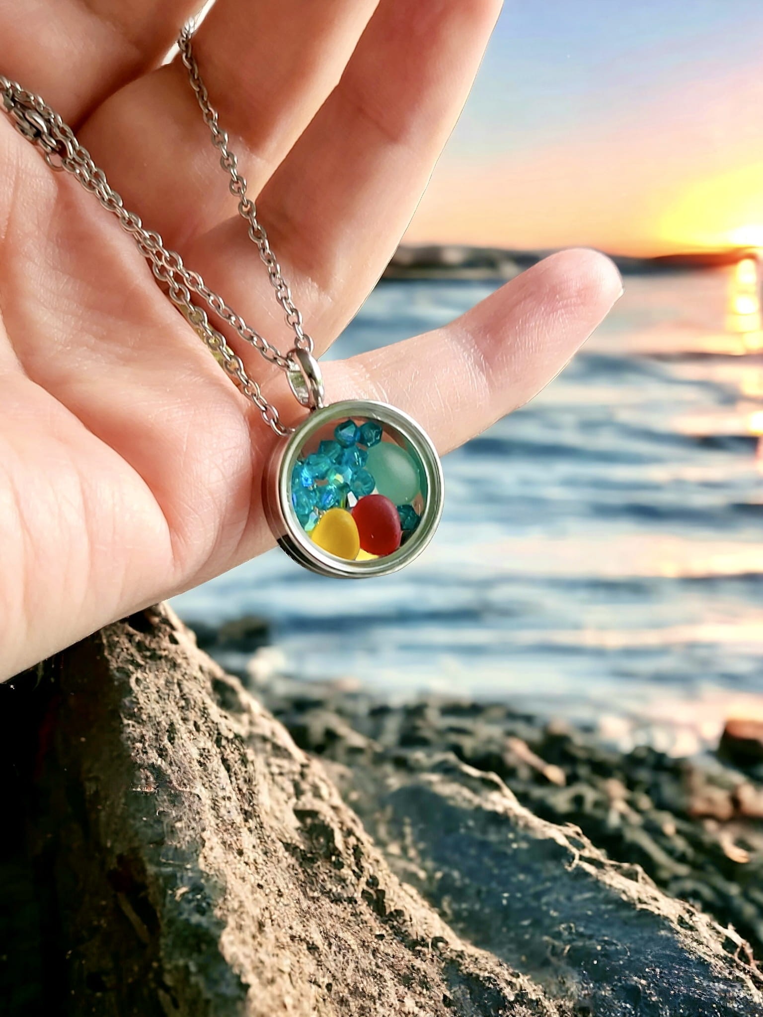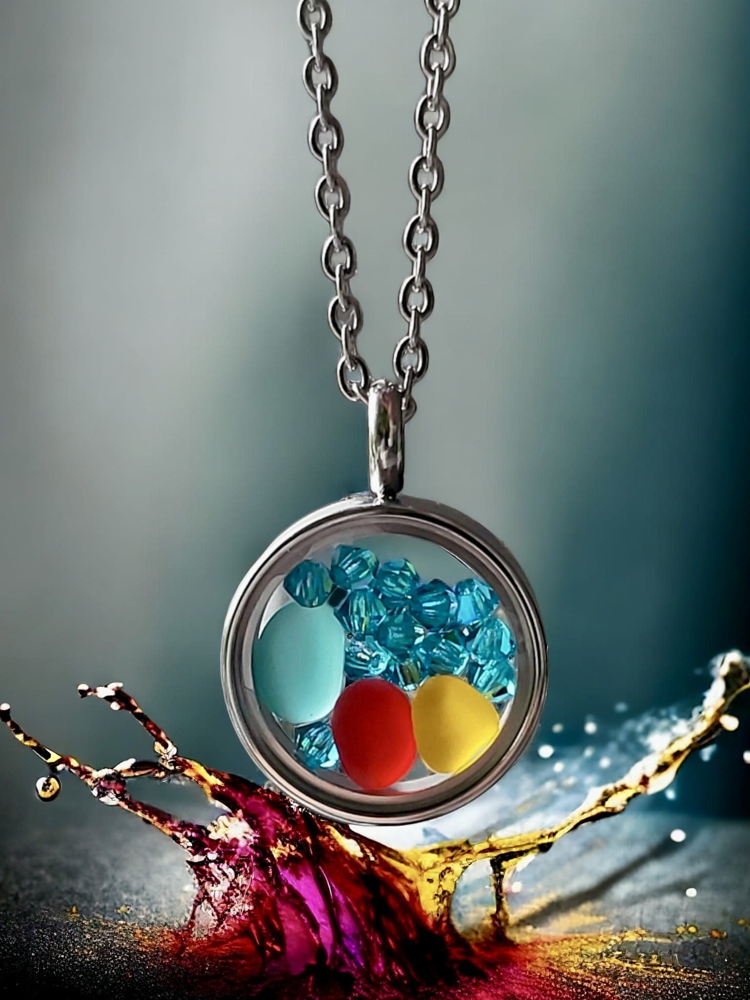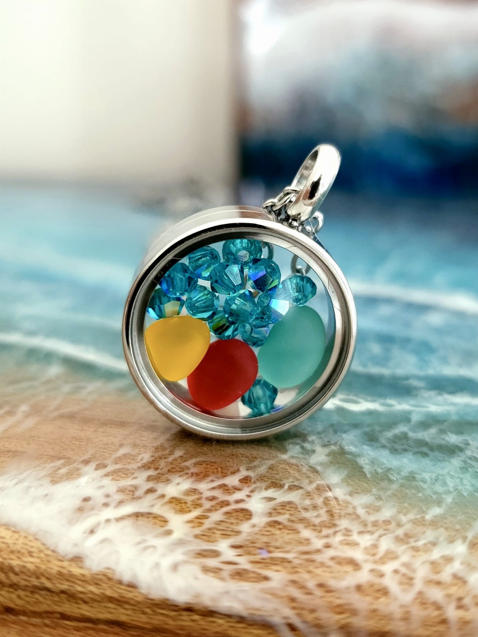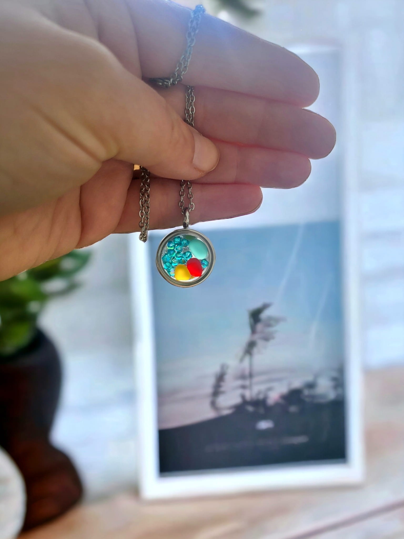 Hipnotyzujący, mały medalion ze szkłem morskim.
