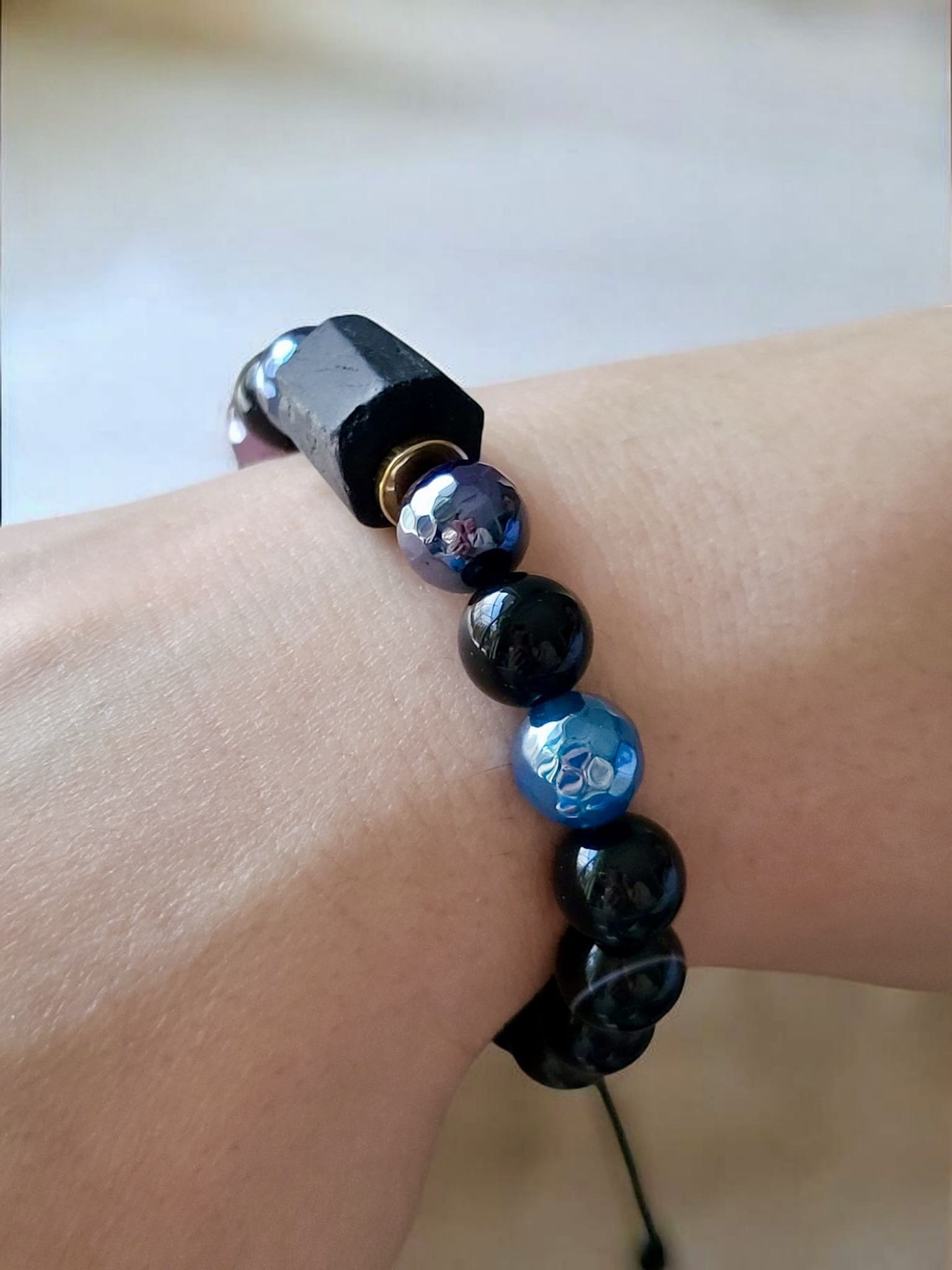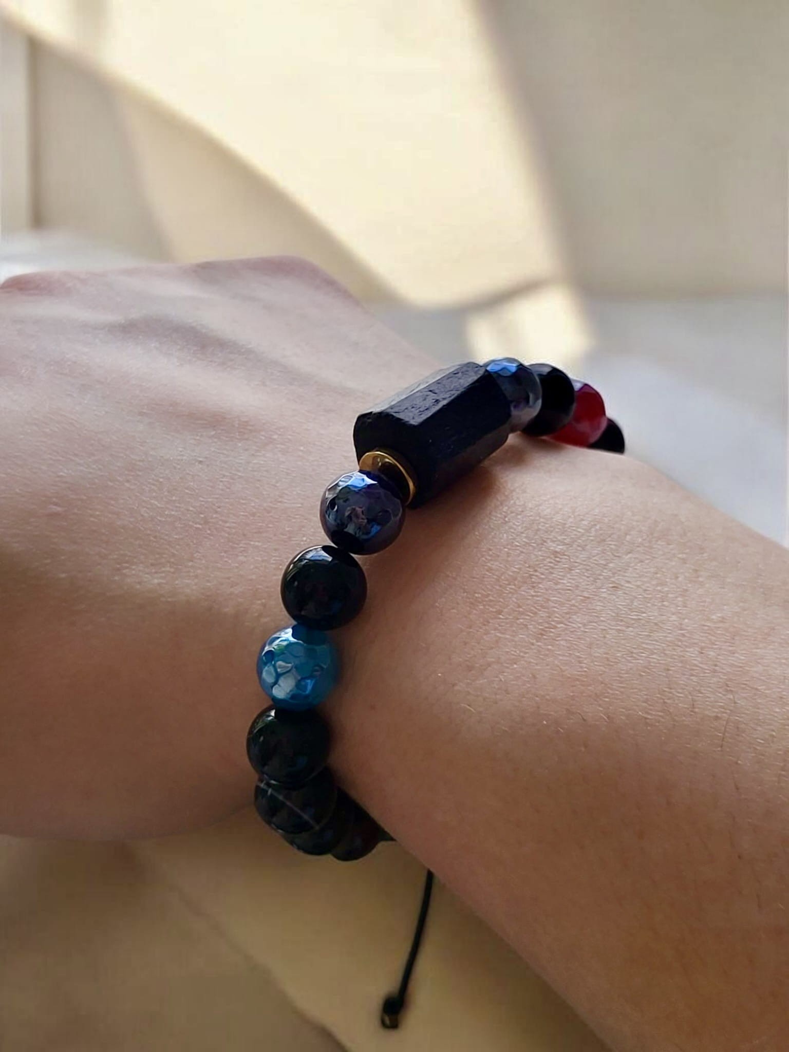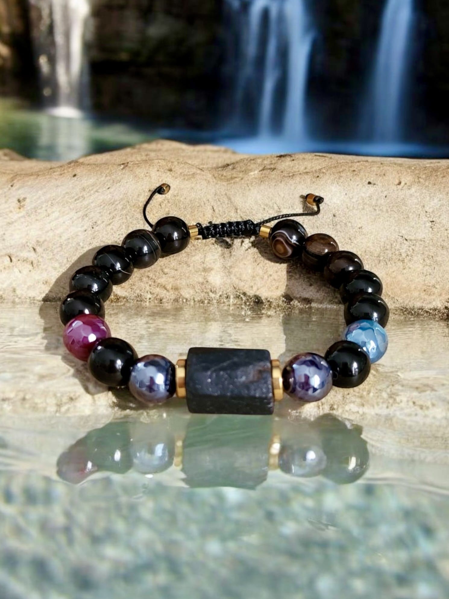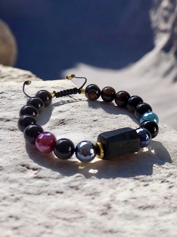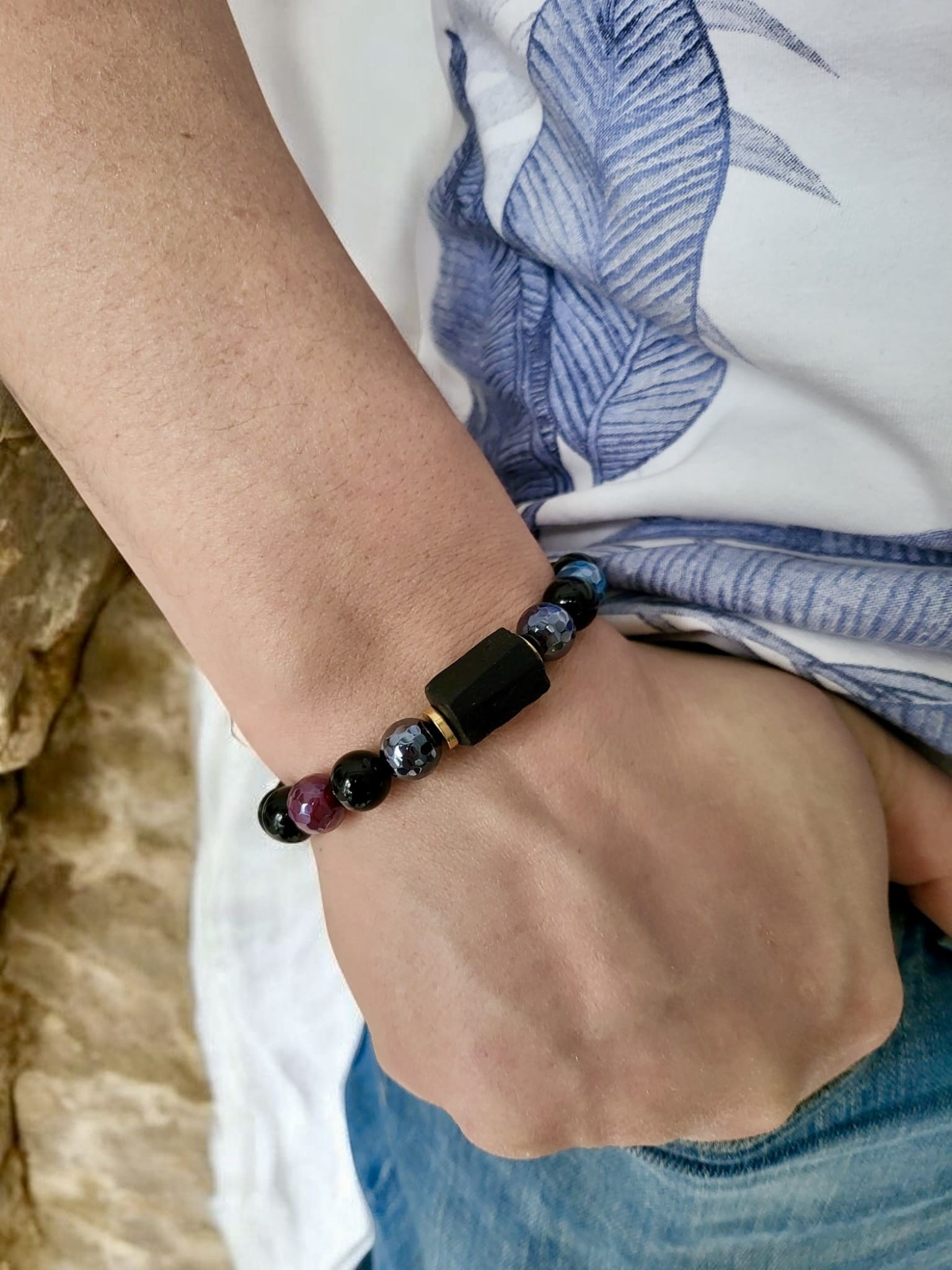 Męskość, charakter i siła zamknięte w jednym dodatku. Bransoletka „Męska Siła” to esencja surowej natury i eleganckiego wykończenia. Okazała, naturalna bryła czarnego turmalinu – kamienia ochronnego – została otoczona mistycznymi agatami w niezwykłych, metalizowanych odcieniach. Grafitowe, bordowe i turkusowe akcenty tworzą intrygujący kontrast, a złote elementy ze stali szlachetnej dodają wyrafinowania.