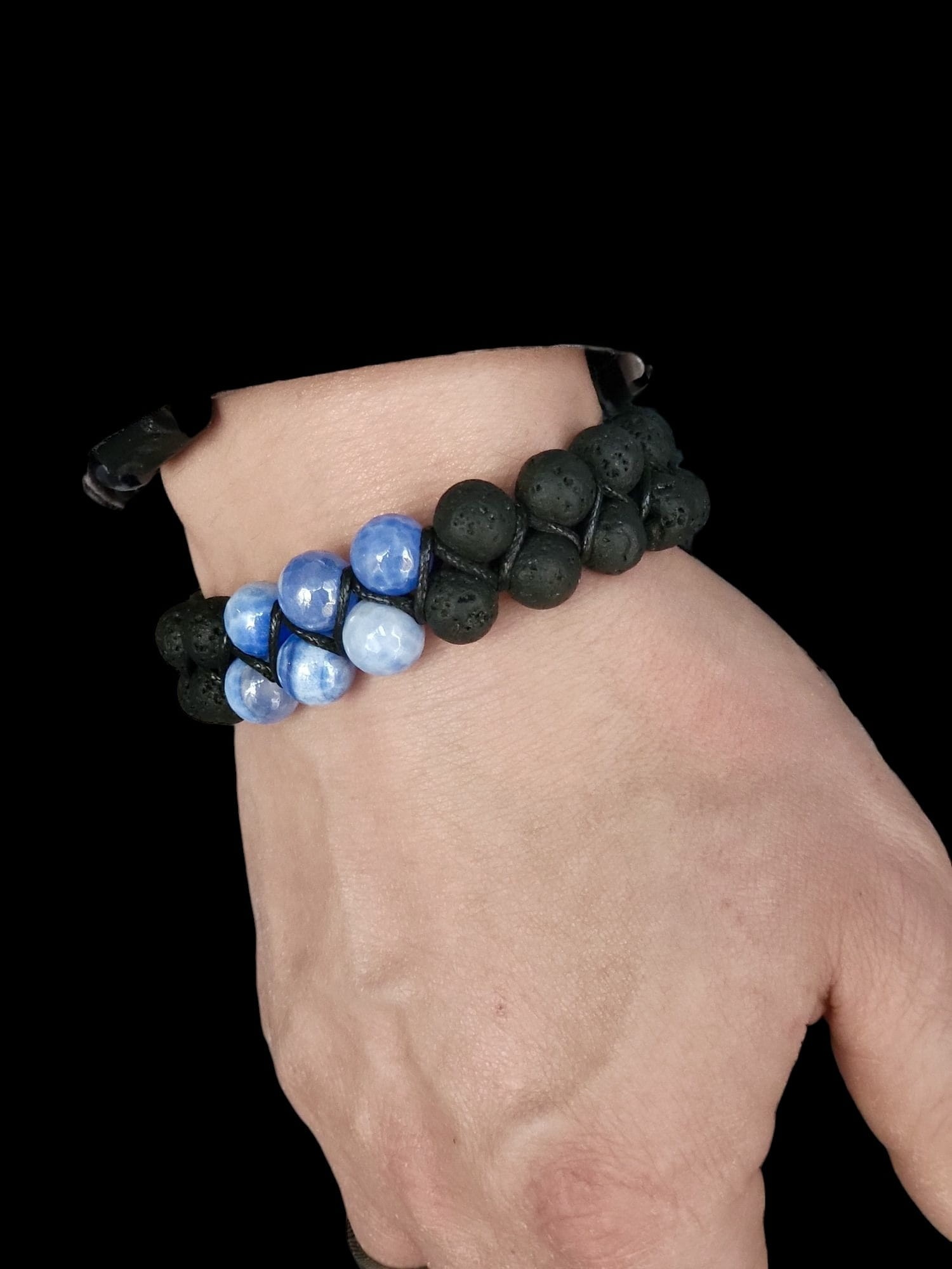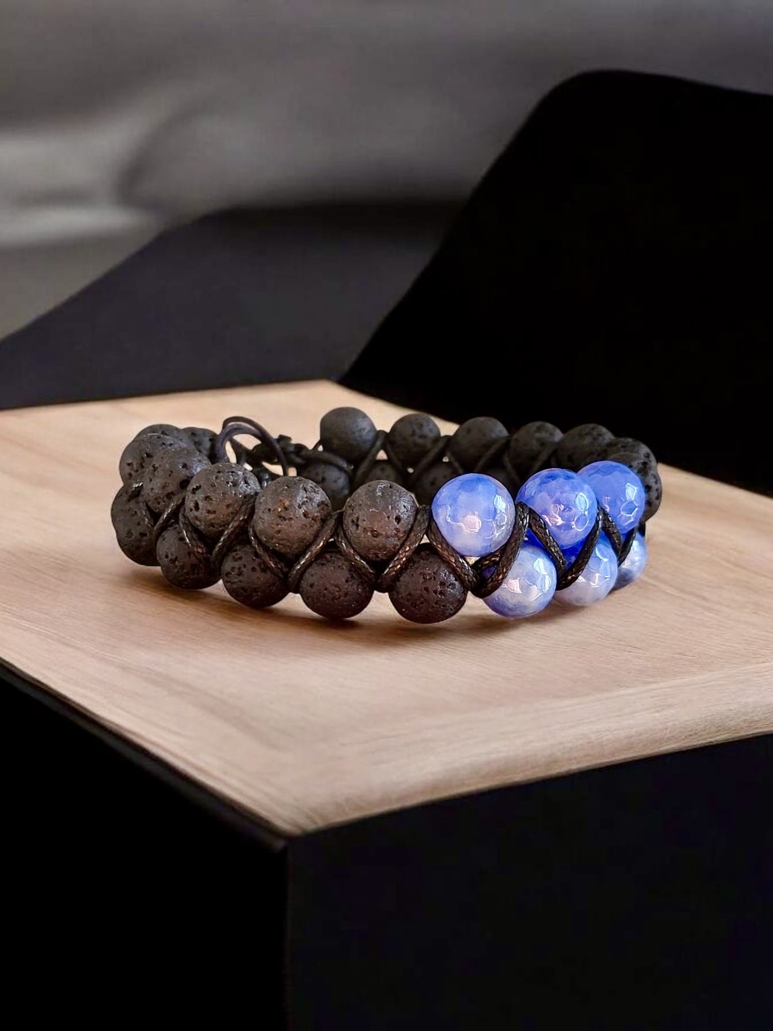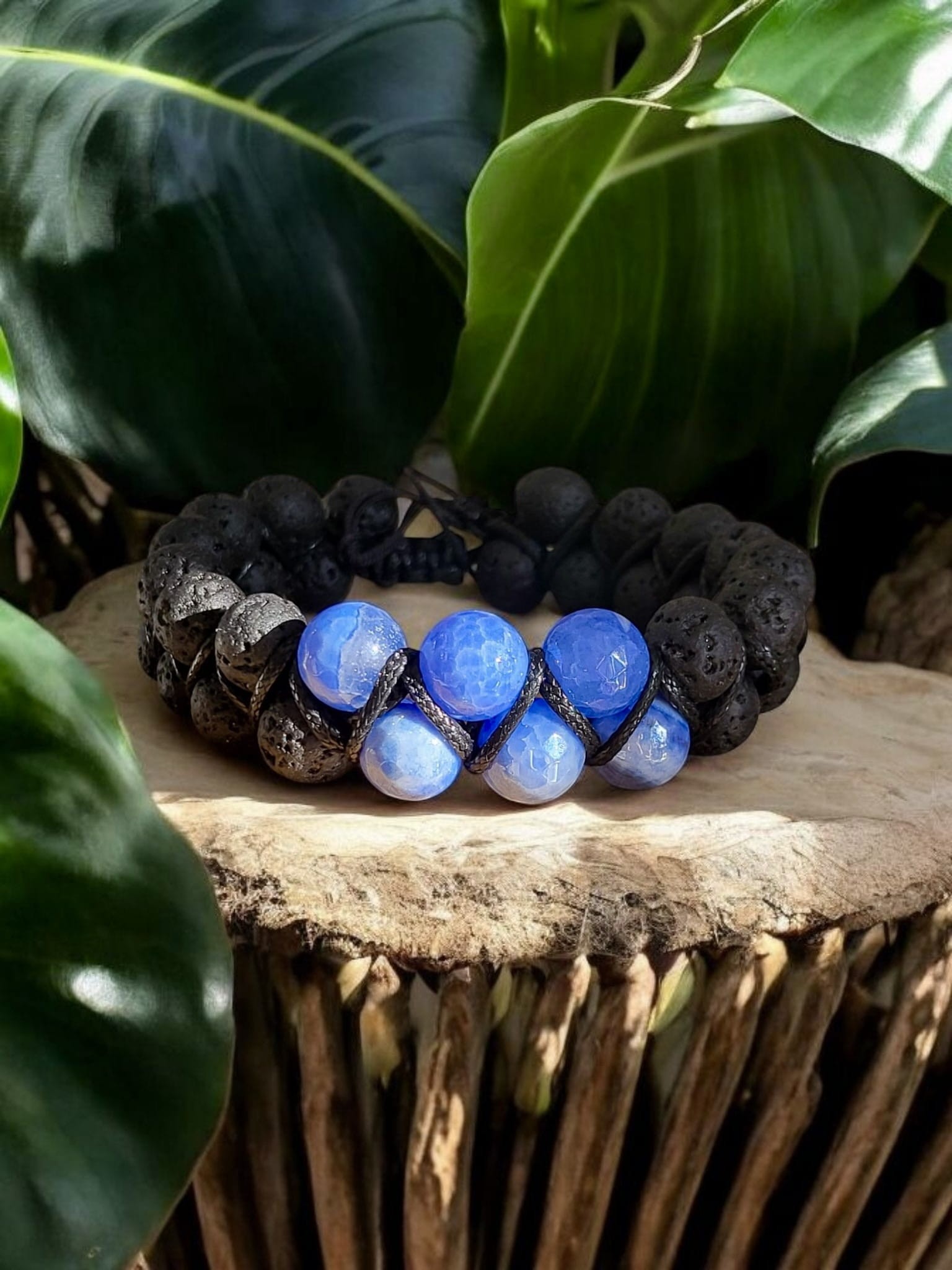 Męska bransoletka dwurzędowa lawa wulkaniczna błękitne agaty – Siła Natury