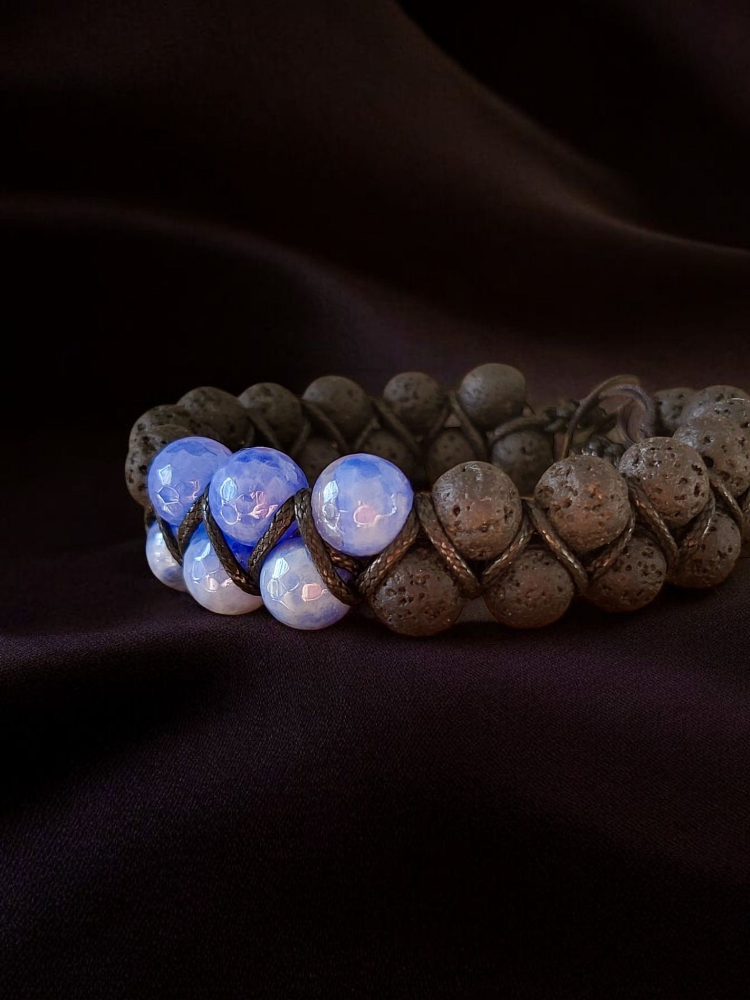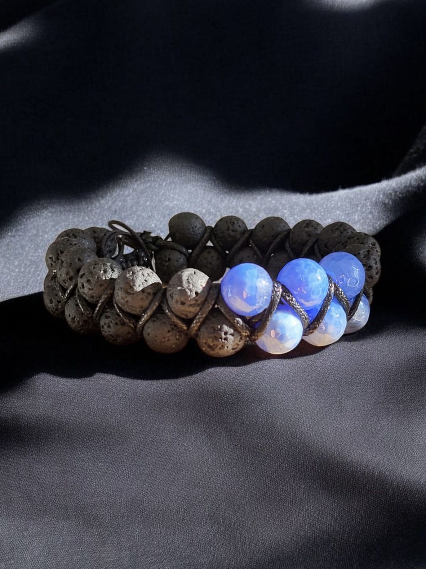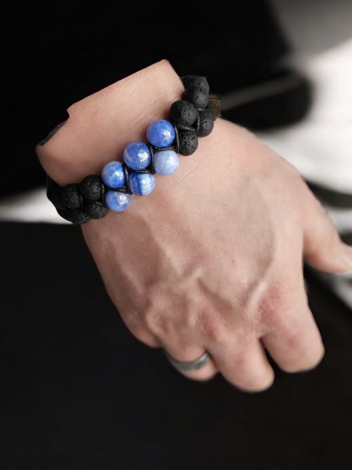 Męska bransoletka dwurzędowa lawa wulkaniczna błękitne agaty – Siła Natury