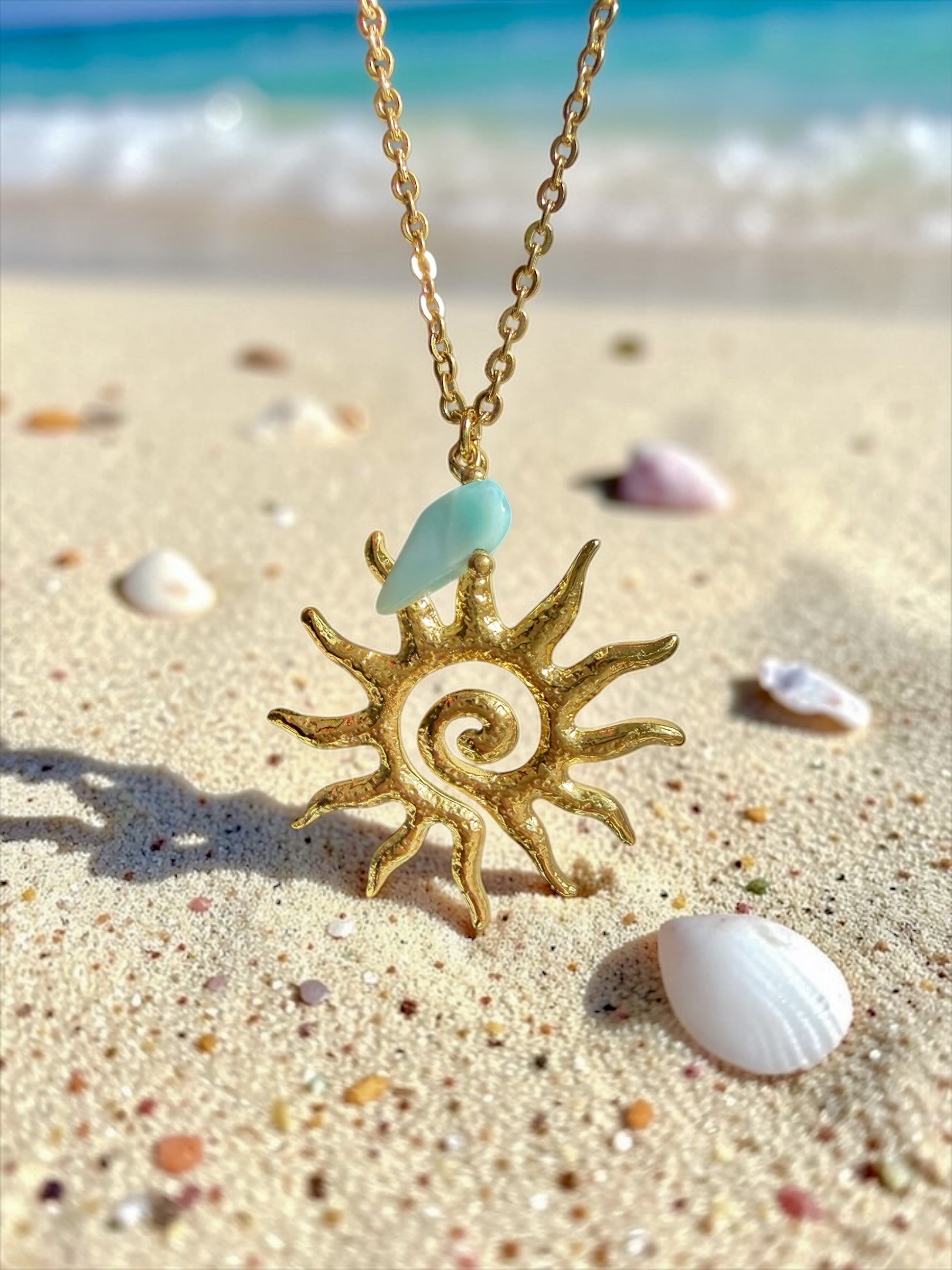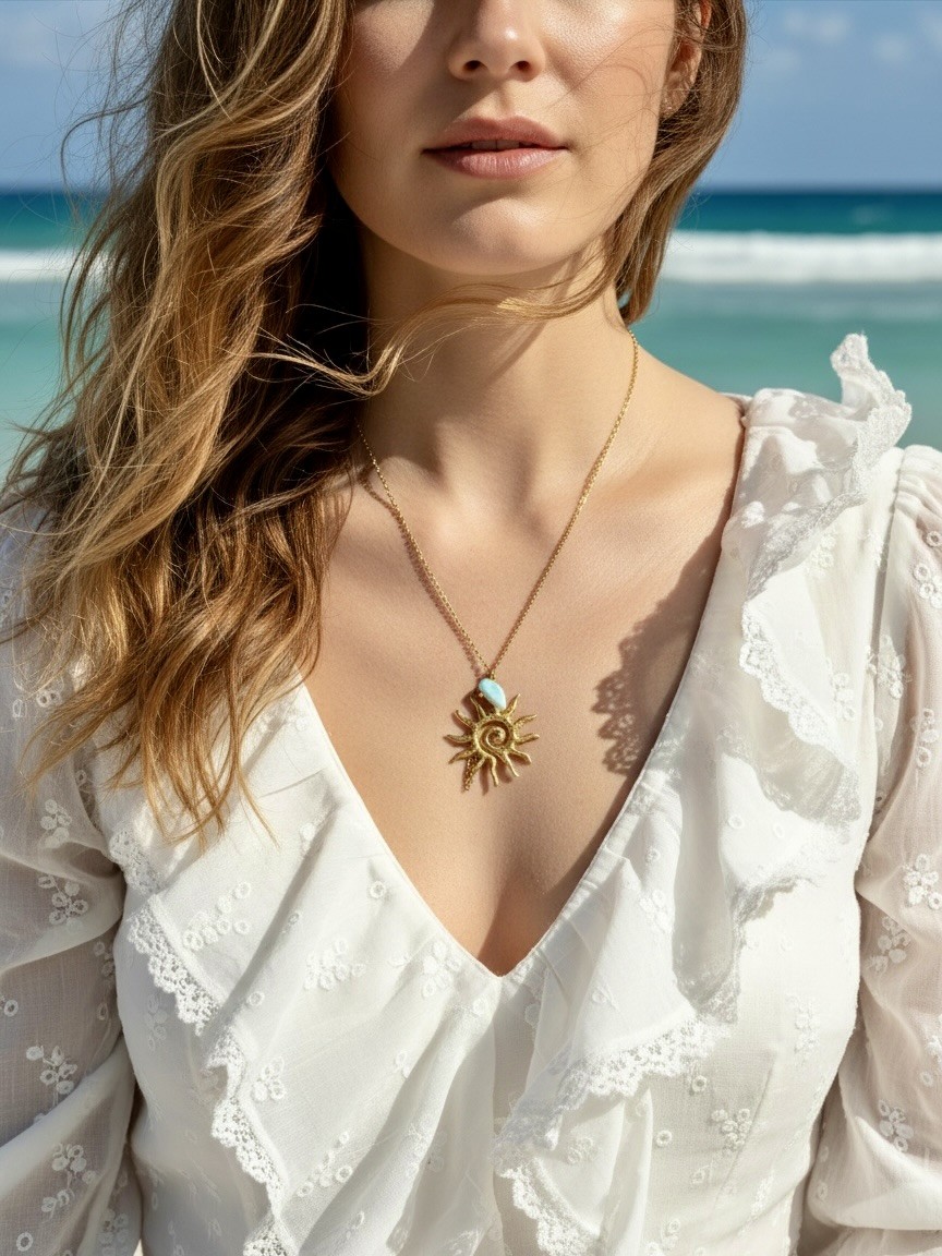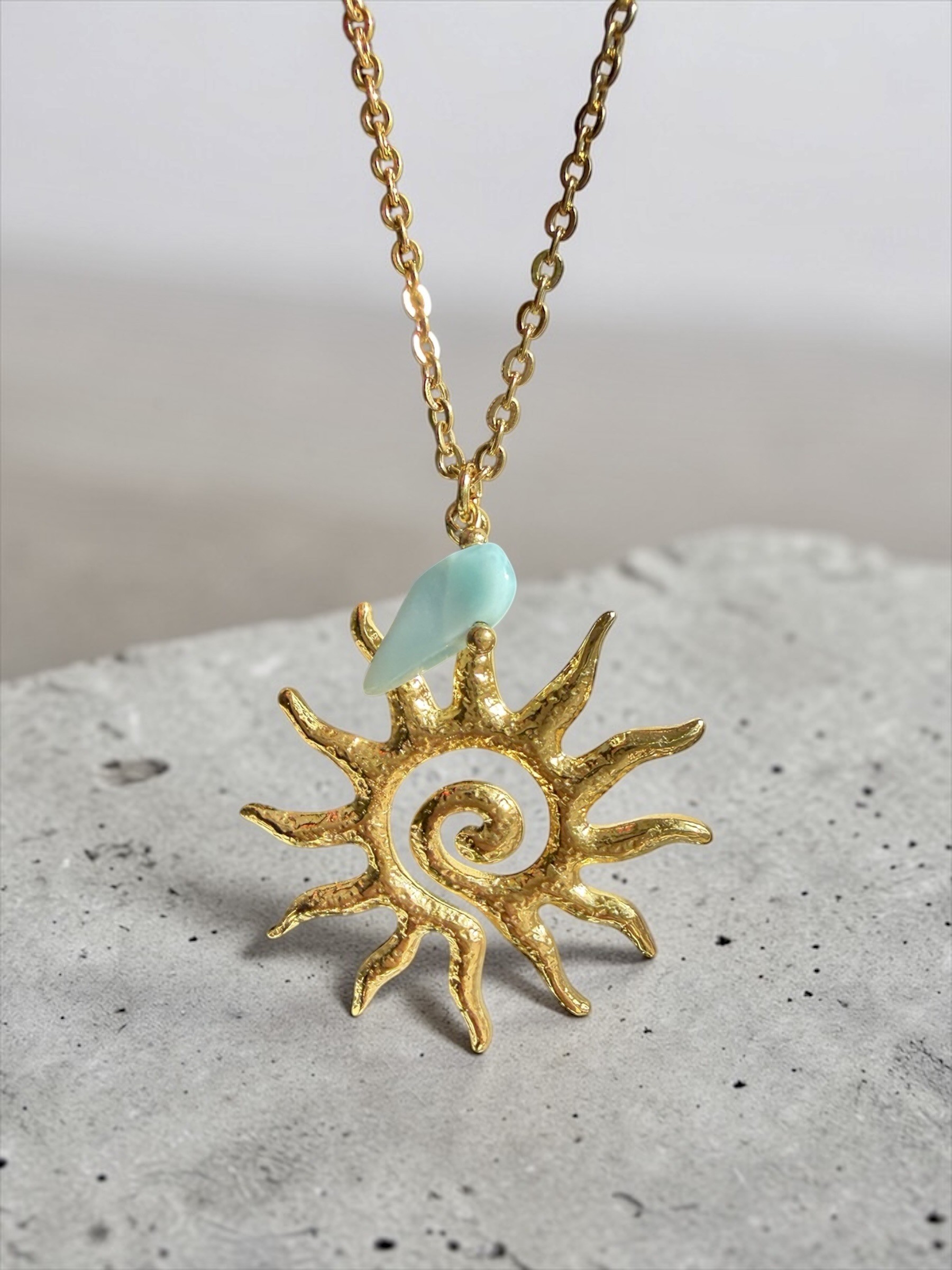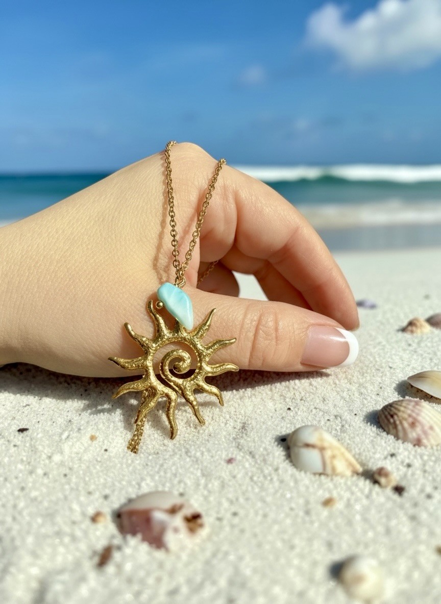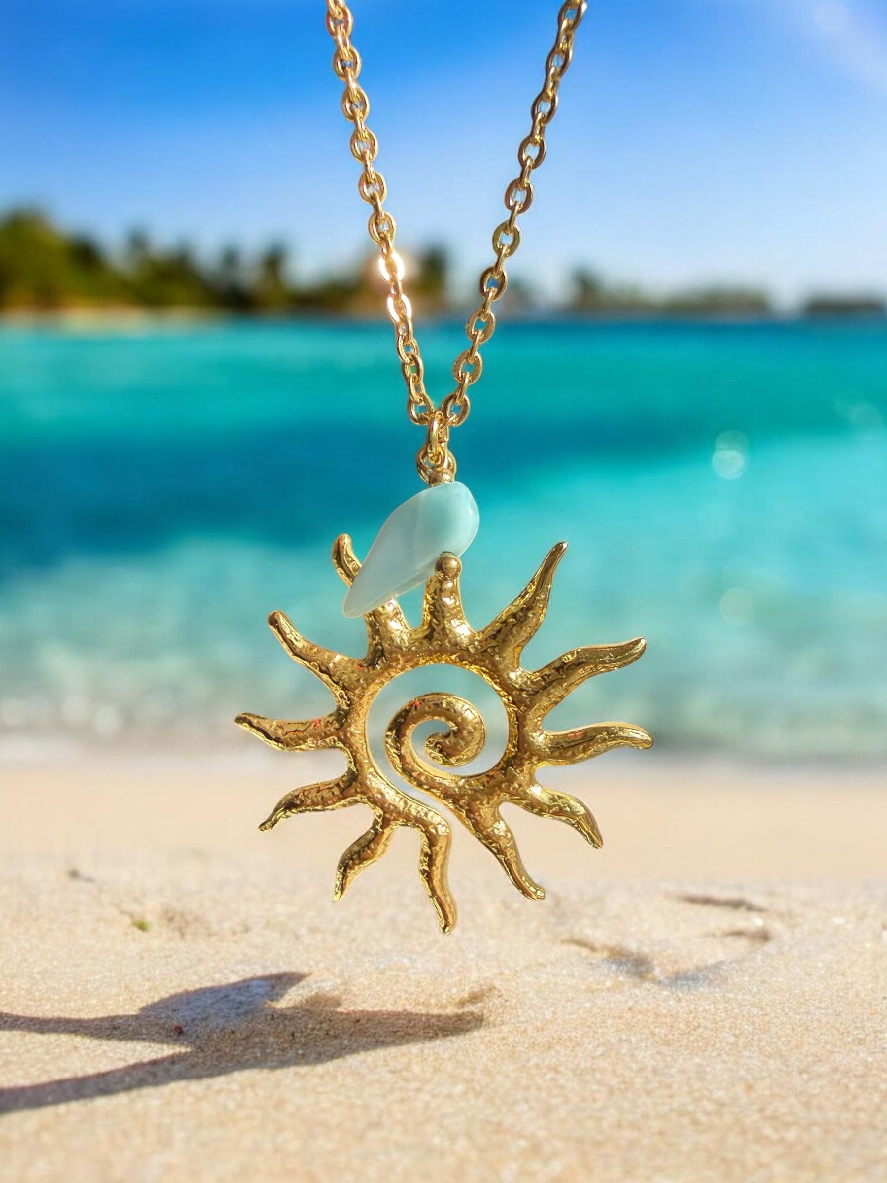 Naszyjnik Larimar „Słońce Oceanu” – Pozłacane Słońce PVD | Błękitny Larimar, Biżuteria Boho