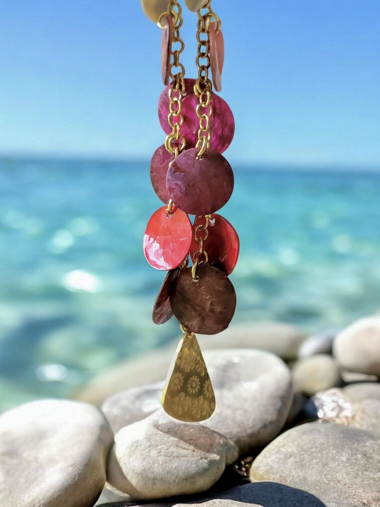 Zawieszki wykonane są z naturalnej muszli, w formie lekkich, delikatnie połyskujących monetek. Jedna strona ukazuje surową strukturę skorupy, druga — pełną magii, hipnotyzującą masę perłową. W słońcu mienią się niczym tafla wody, tworząc zjawiskową mozaikę kolorów, od perłowych bieli, przez róż, aż po intensywne czerwienie i fiolet.