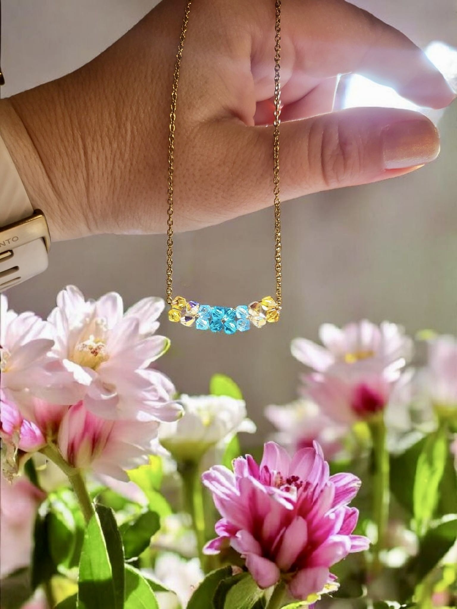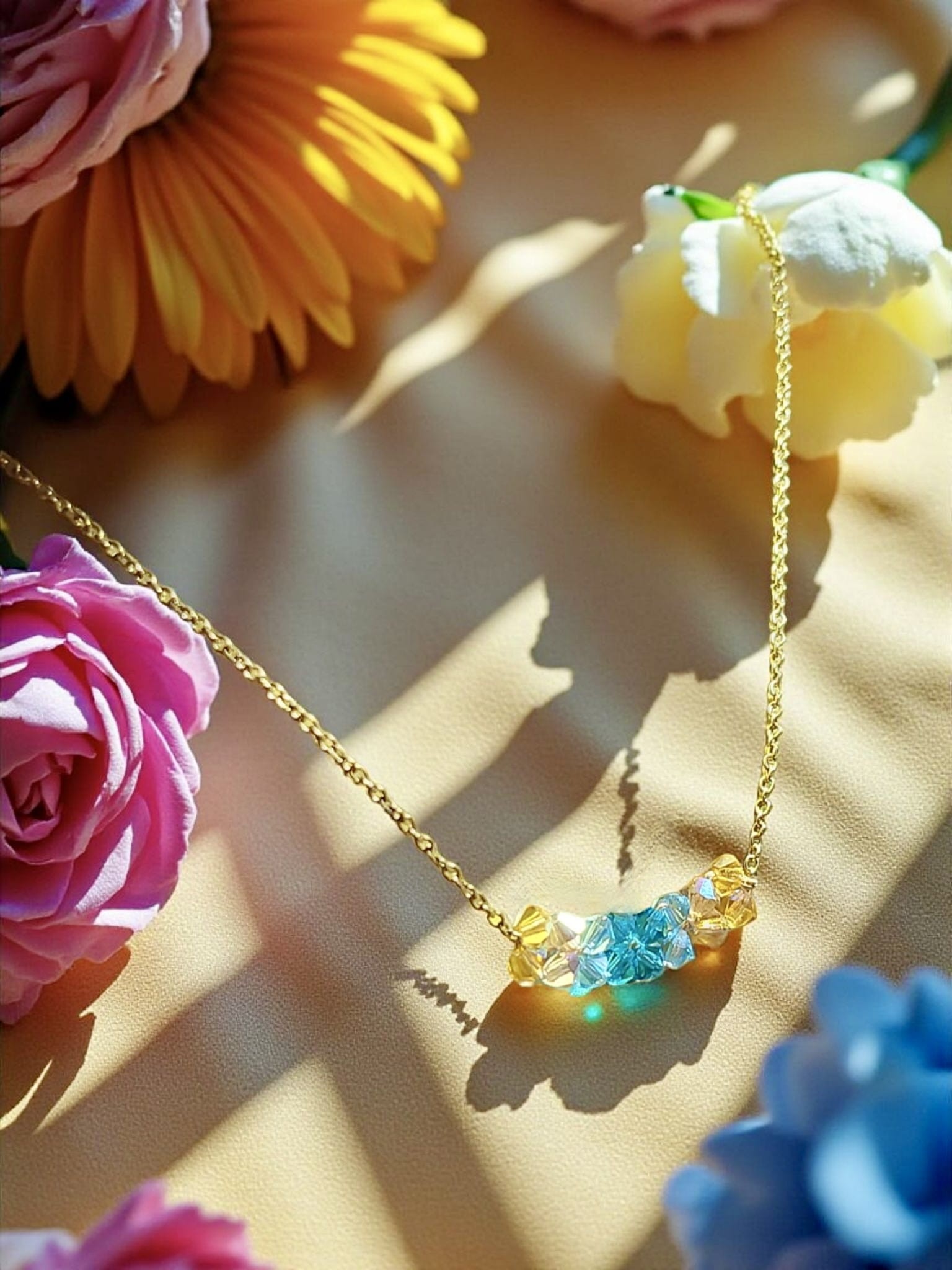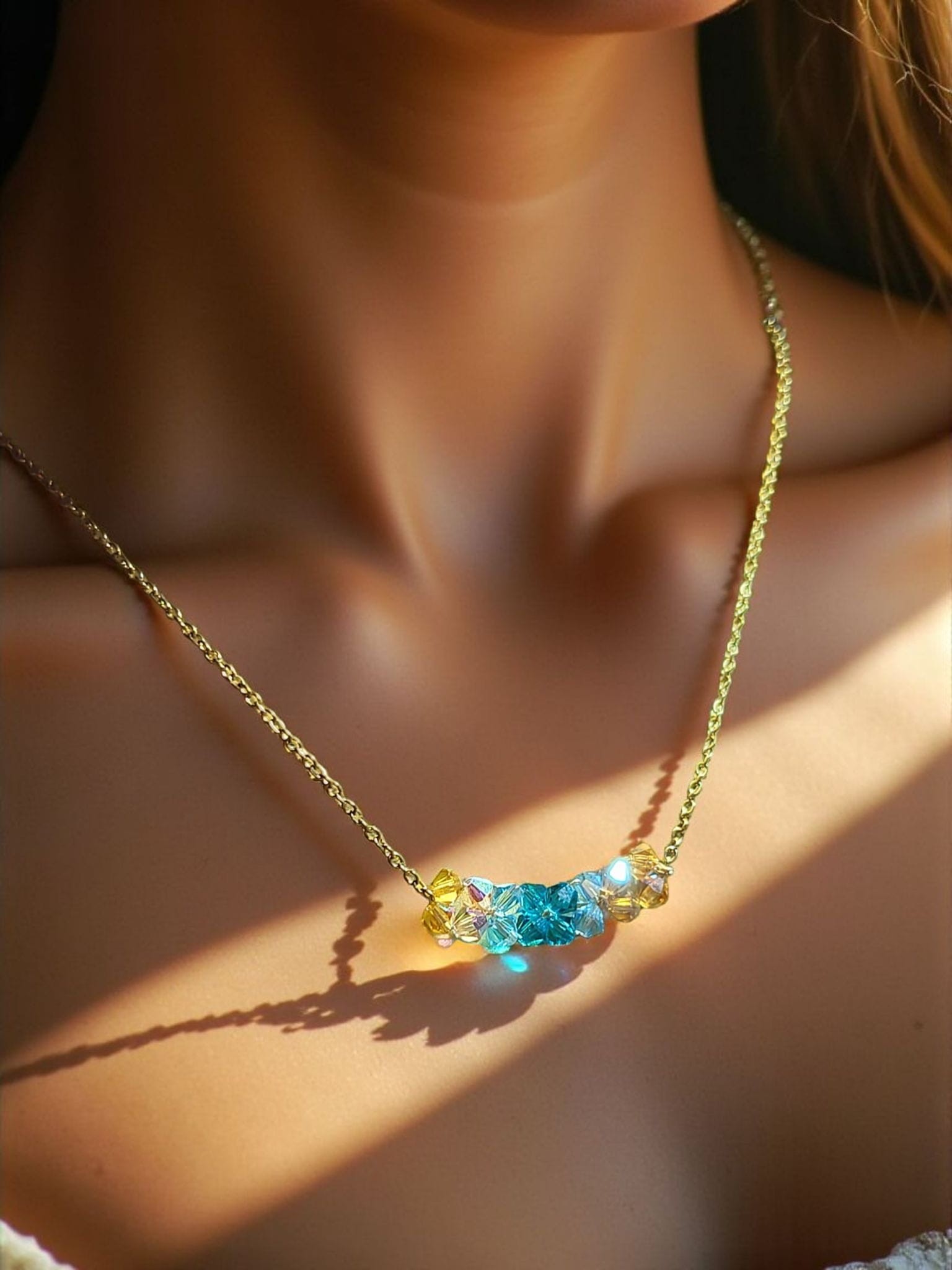 Dodaj do swojej stylizacji odrobinę blasku i koloru. Ten ręcznie wykonany naszyjnik został stworzony z najwyższej jakości kryształów Preciosa, znanych na całym świecie z perfekcyjnego szlifu i wyjątkowej gry światła. Każdy kamień został starannie dobrany, by tworzyć efekt ombre – od złocistych tonów, przez subtelne pastele, aż po intensywną turkusową głębię.