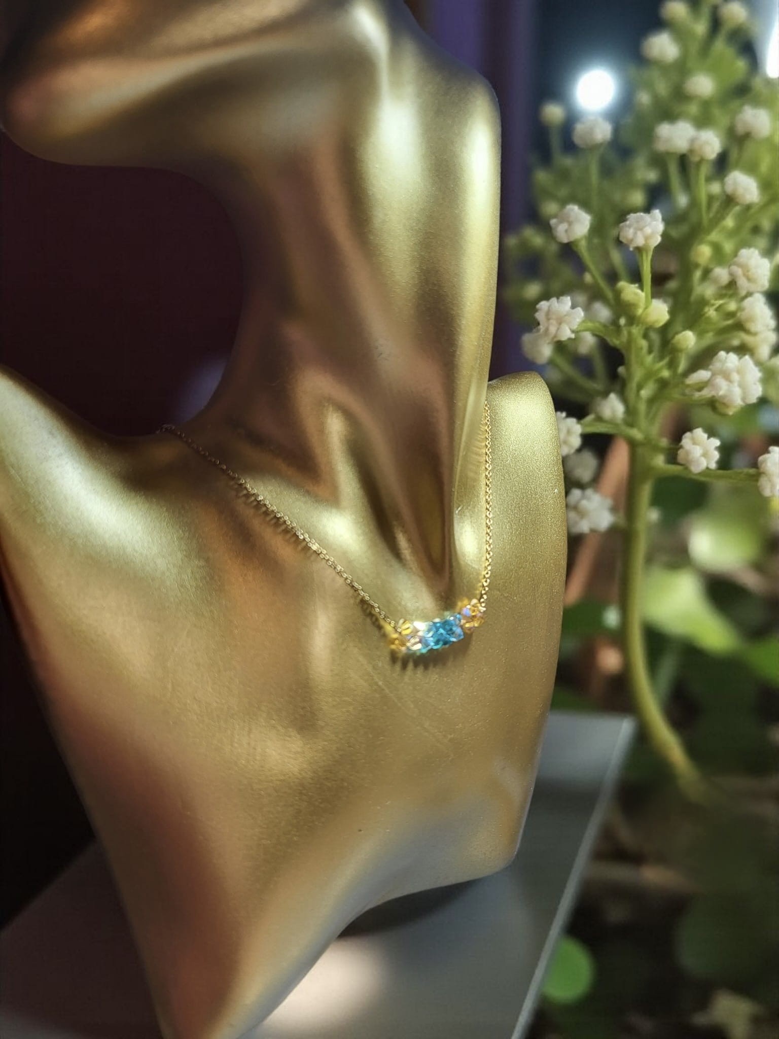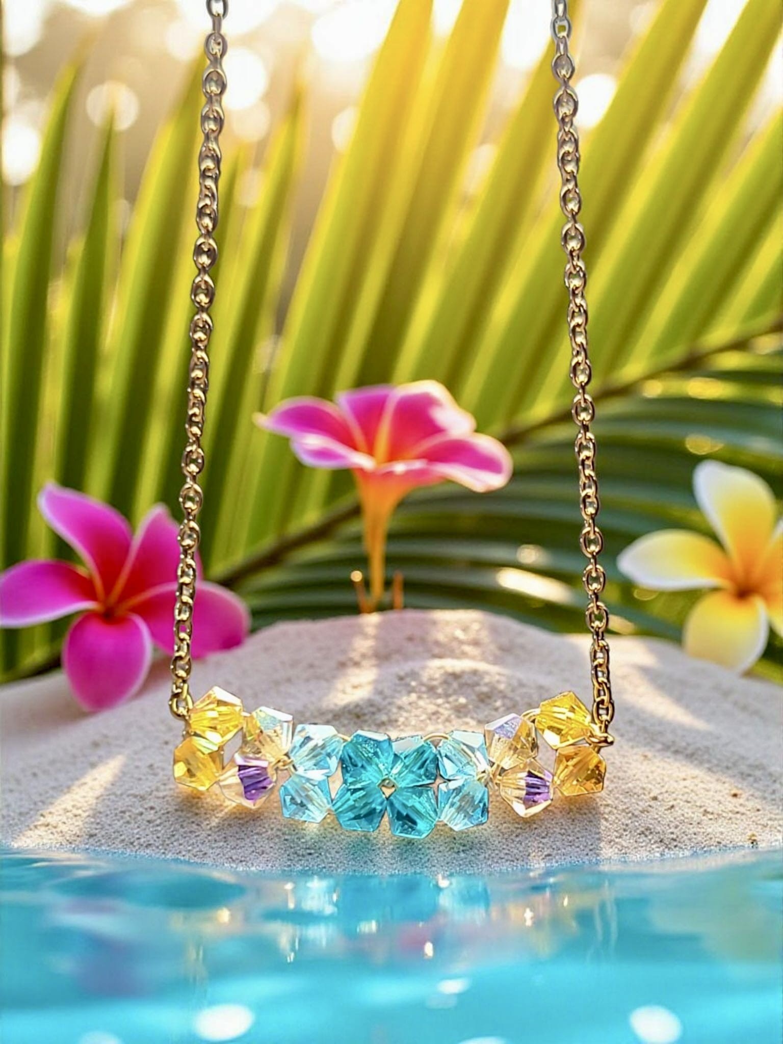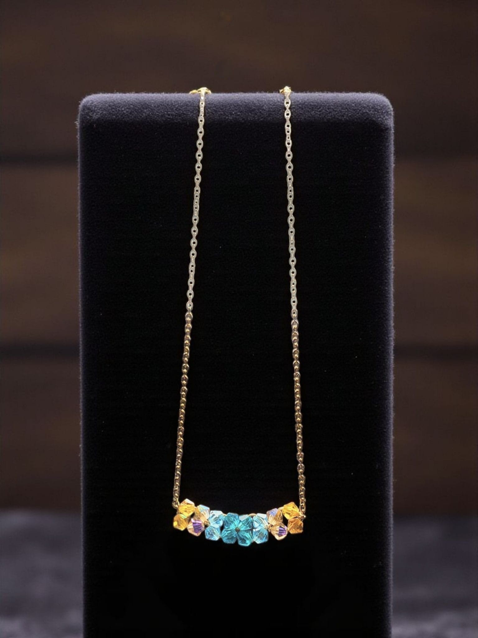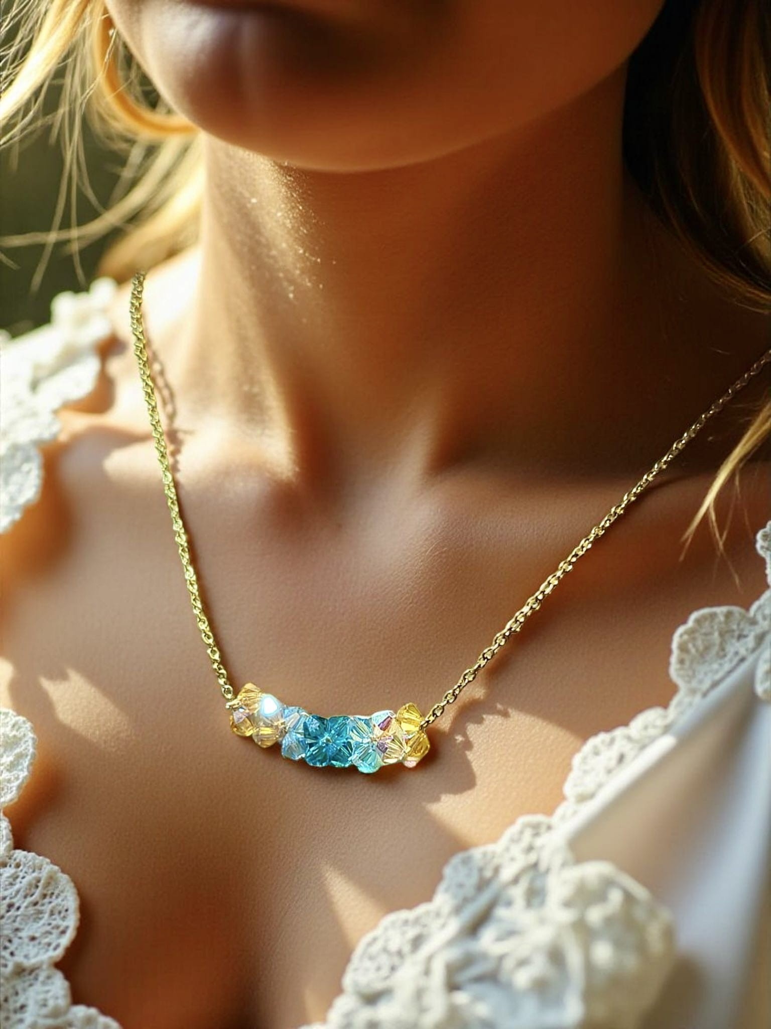 Dodaj do swojej stylizacji odrobinę blasku i koloru. Ten ręcznie wykonany naszyjnik został stworzony z najwyższej jakości kryształów Preciosa, znanych na całym świecie z perfekcyjnego szlifu i wyjątkowej gry światła. Każdy kamień został starannie dobrany, by tworzyć efekt ombre – od złocistych tonów, przez subtelne pastele, aż po intensywną turkusową głębię.