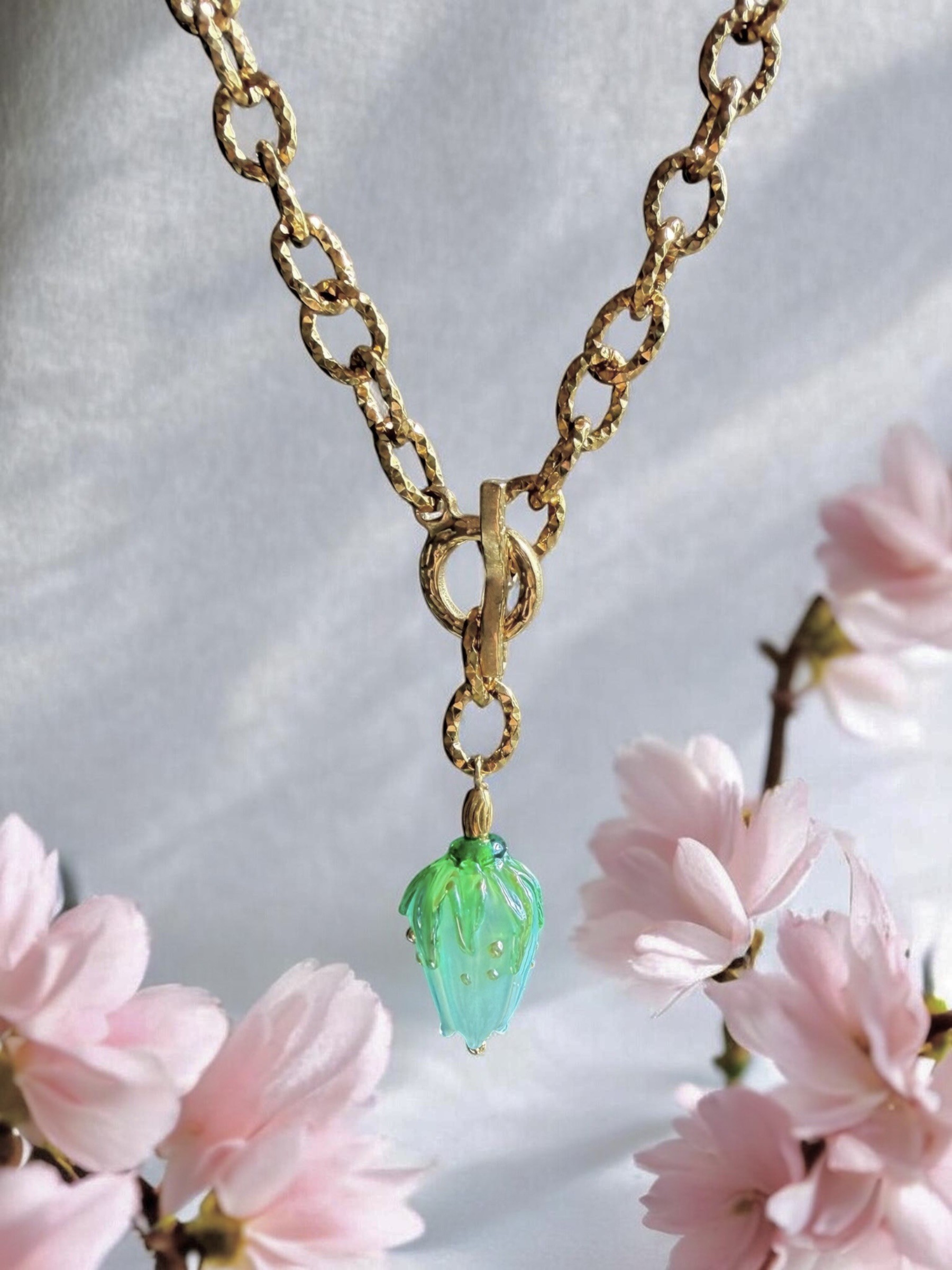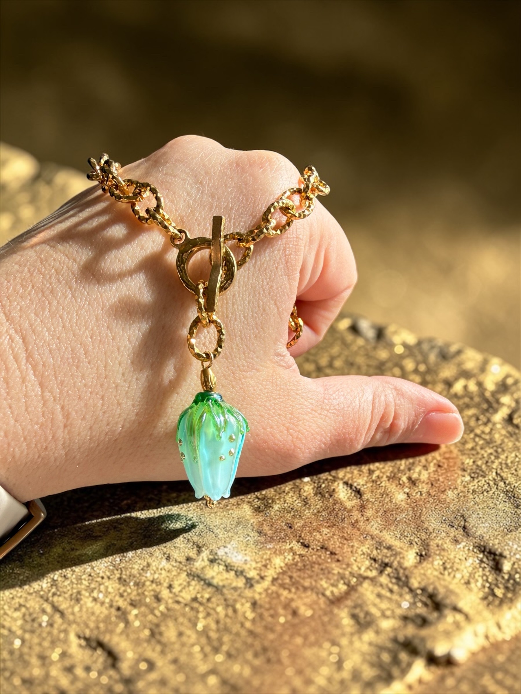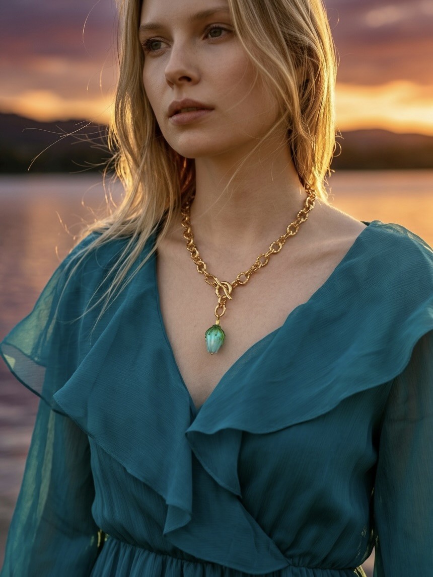 Ten naszyjnik to małe dzieło sztuki zamknięte w formie biżuterii. Zachwyca od pierwszego spojrzenia – światło tańczy na jego powierzchni, wydobywając hipnotyzujące przejścia między niebieskim a delikatnym turkusem. Każdy ruch sprawia, że kolor ożywa, jakby pąk kwiatu naprawdę oddychał.
