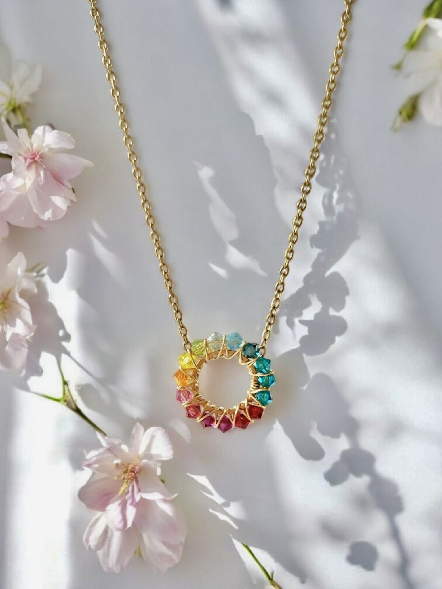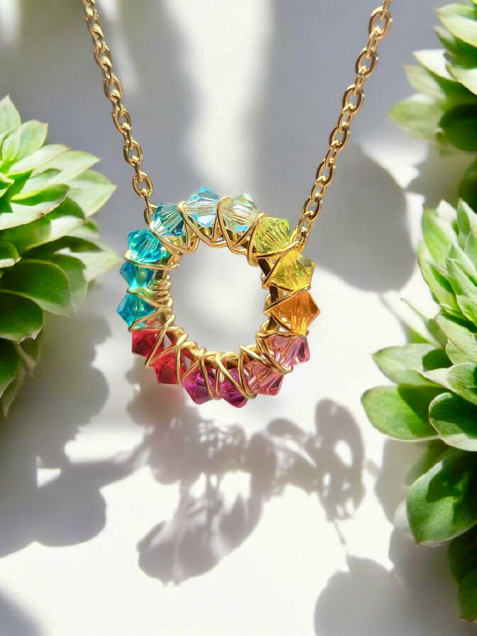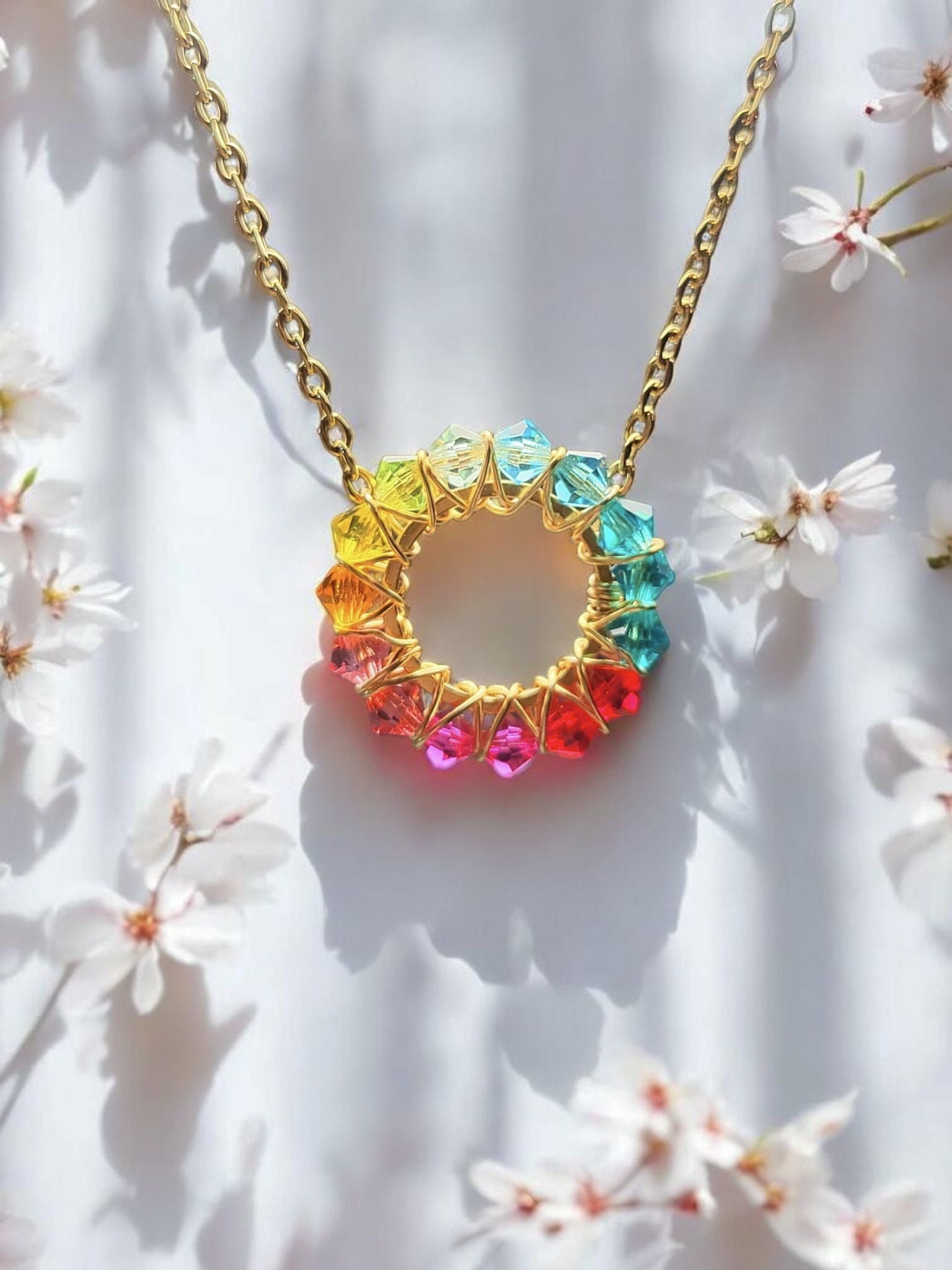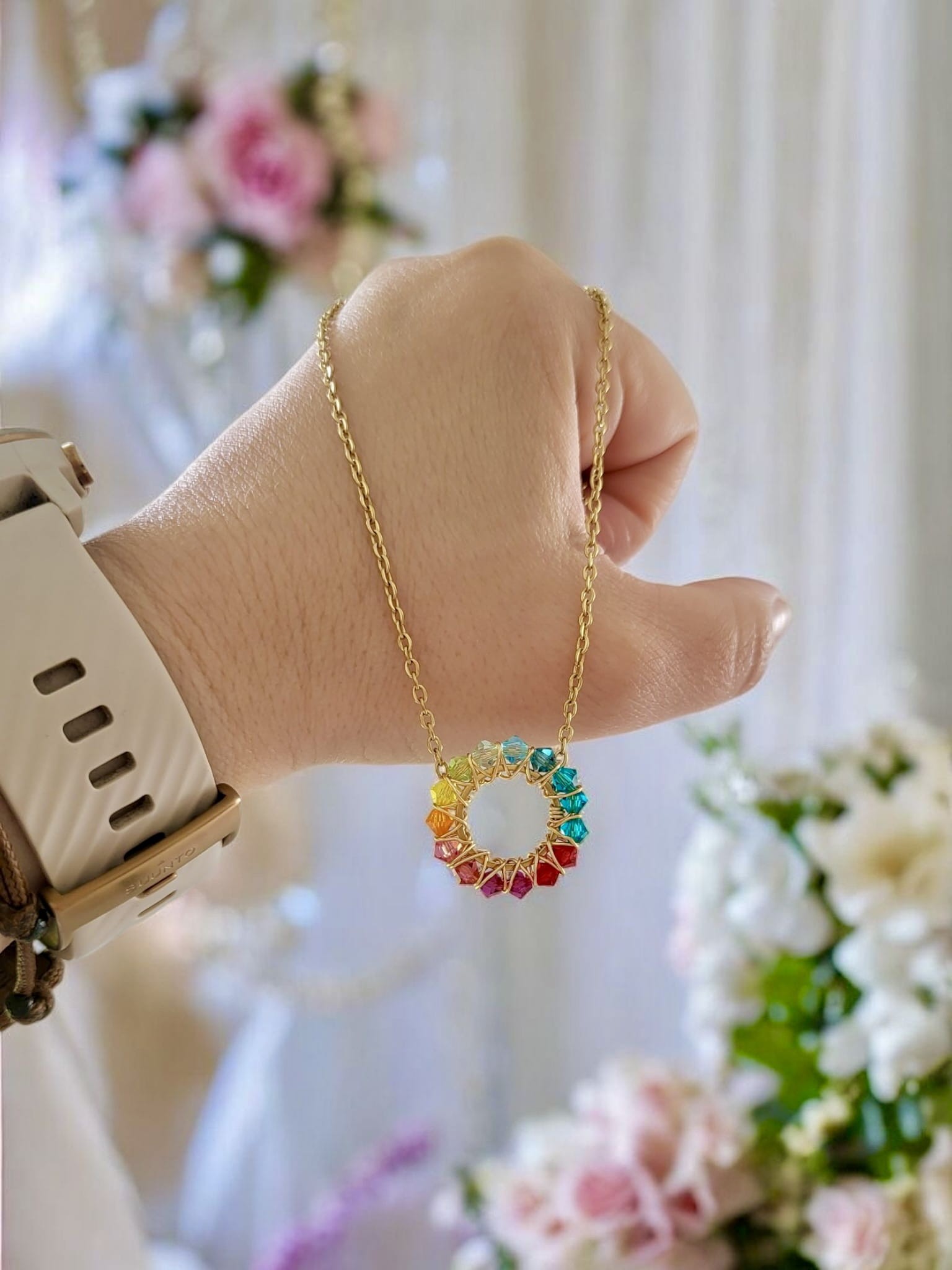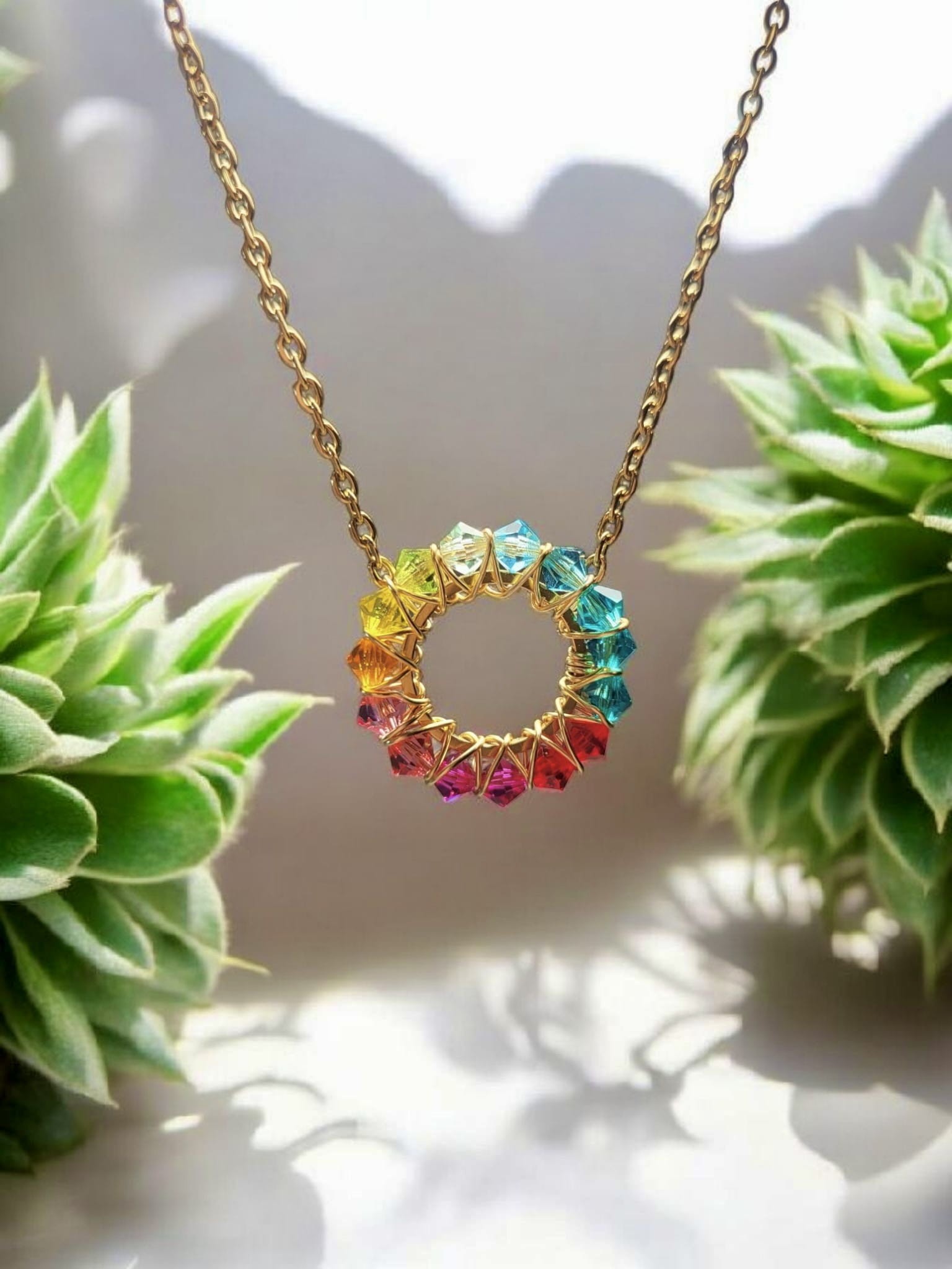 Przed Tobą Tęczowa Magia – ręcznie wykonany naszyjnik z efektowną zawieszką ombre, misternie oplecioną pozłacanym drucikiem jubilerskim. Każdy z kryształków został dobrany z troską o harmonię barw, tworząc wyjątkowy krąg, który hipnotyzuje i przyciąga spojrzenia.