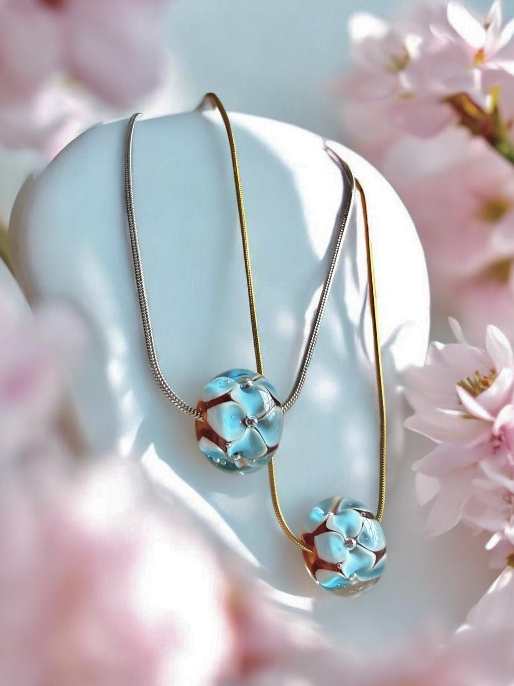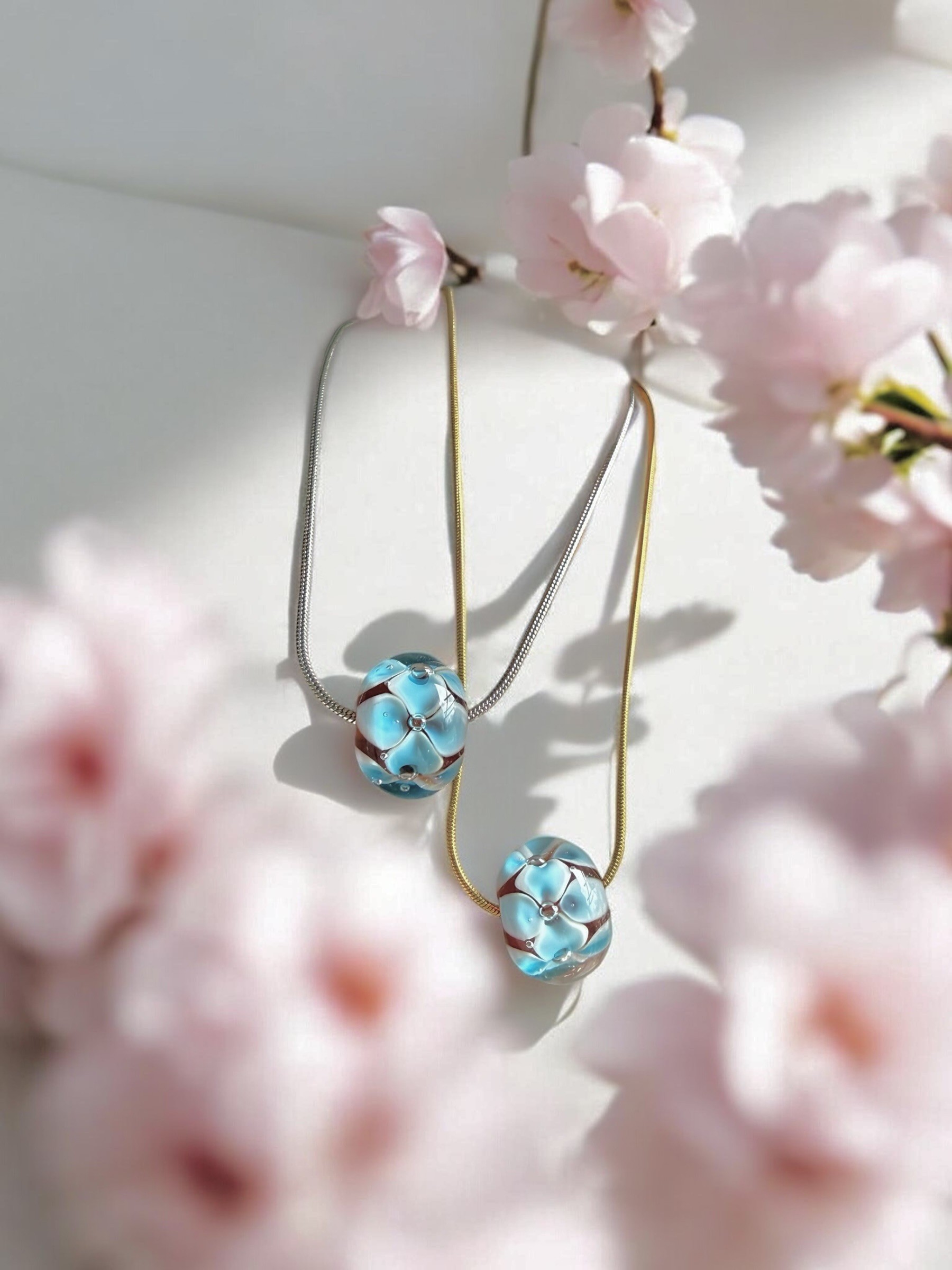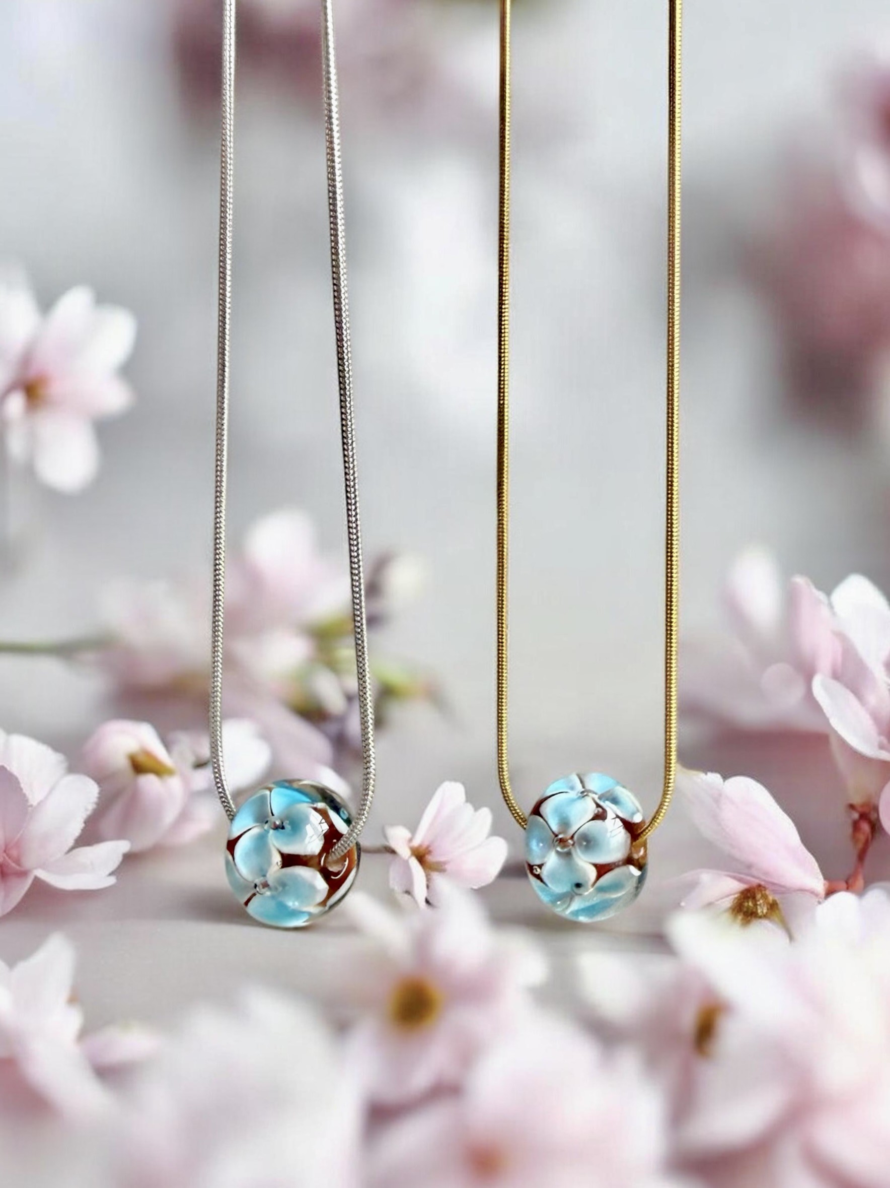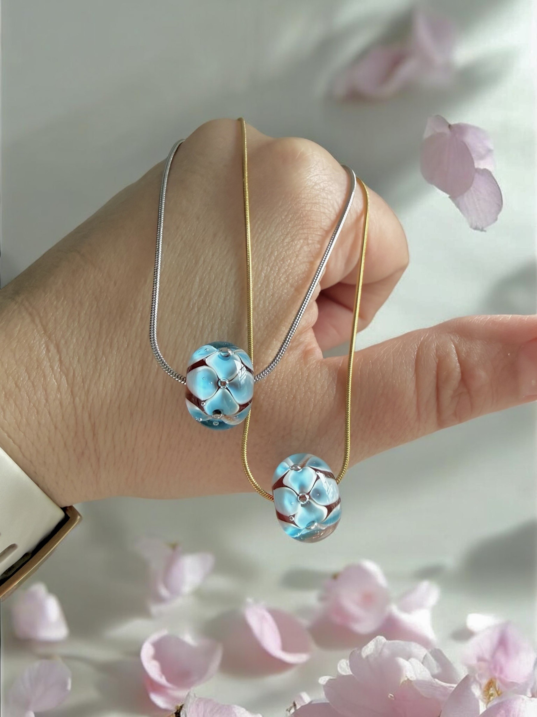 Delikatna żmijka miękko układa się na szyi, podkreślając jej linię subtelnym, złotym lub srebrnym blaskiem. W centrum znajduje się serce tej kompozycji – ręcznie wykonany koralik ze szkła Murano. W jego wnętrzu zakwitają trójwymiarowe, niebieskie kwiaty przypominające niezapominajki – symbol wspomnień, bliskości i tego, co najważniejsze.