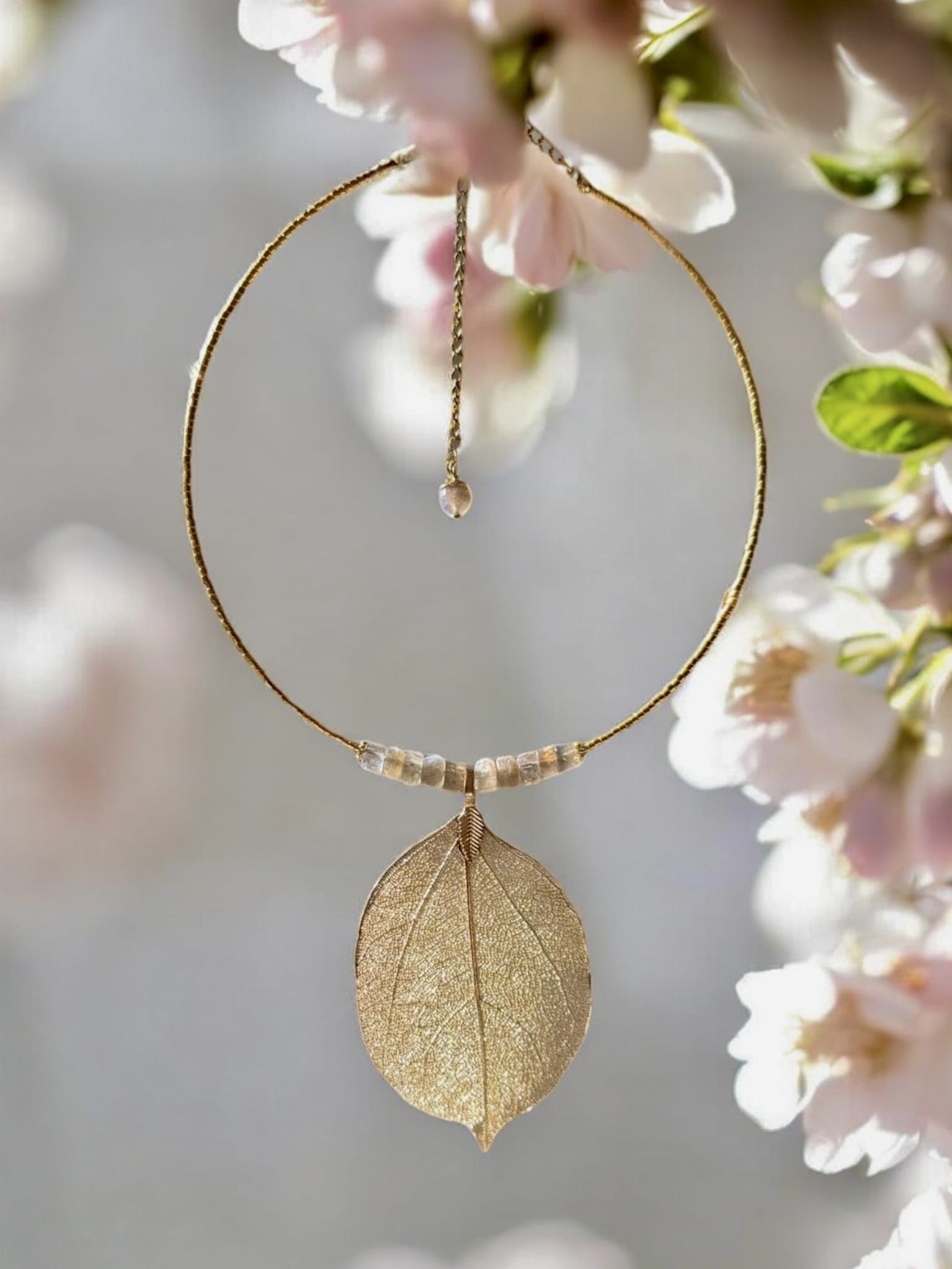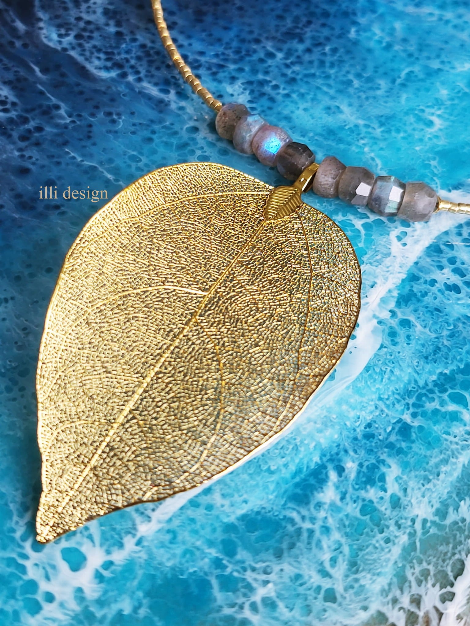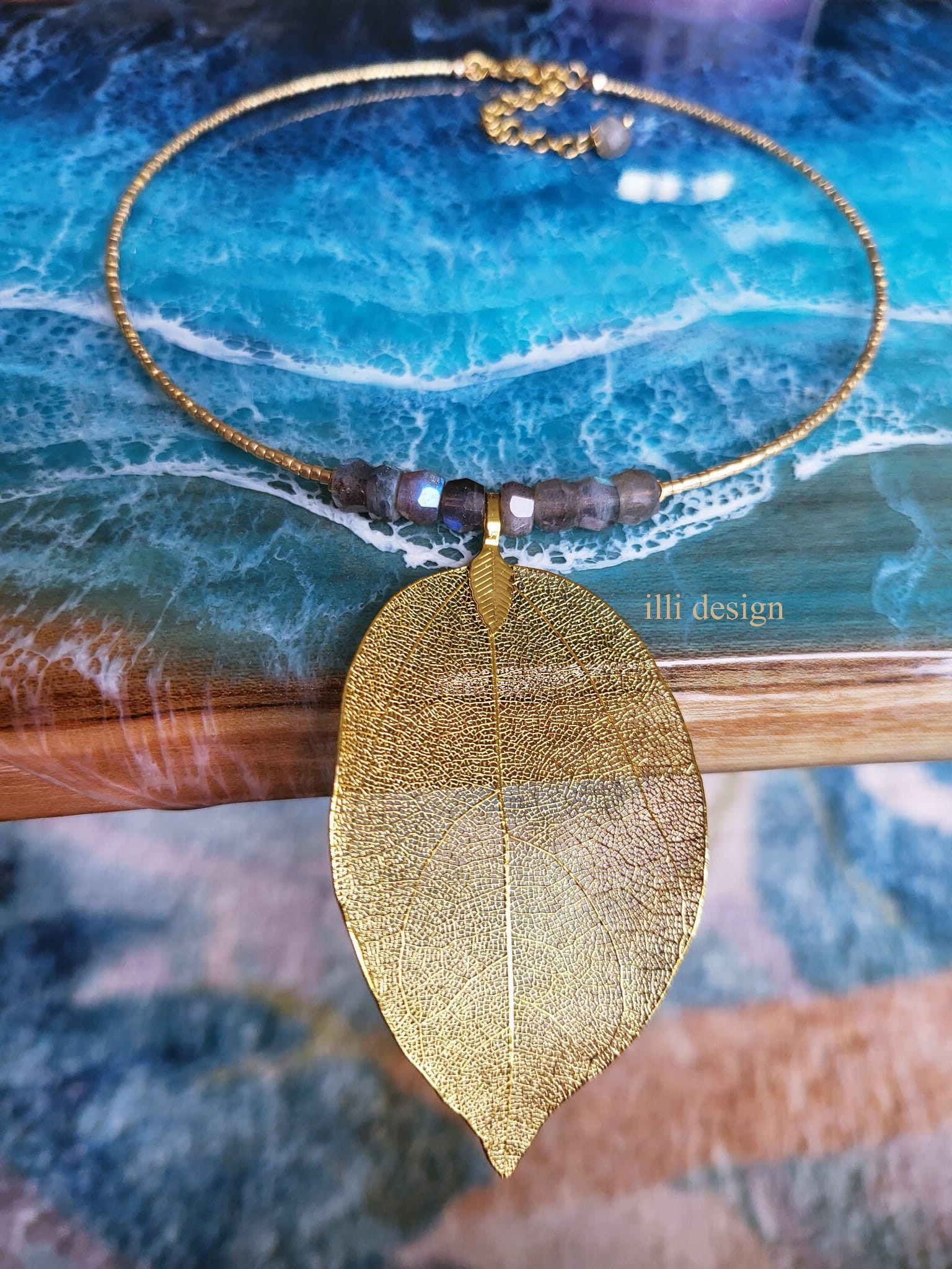 Poznaj biżuterię, która łączy w sobie naturę, sztukę i magię kamieni – naszyjnik z naturalnym złoconym liściem magnolii i labradorytem klasy AA.