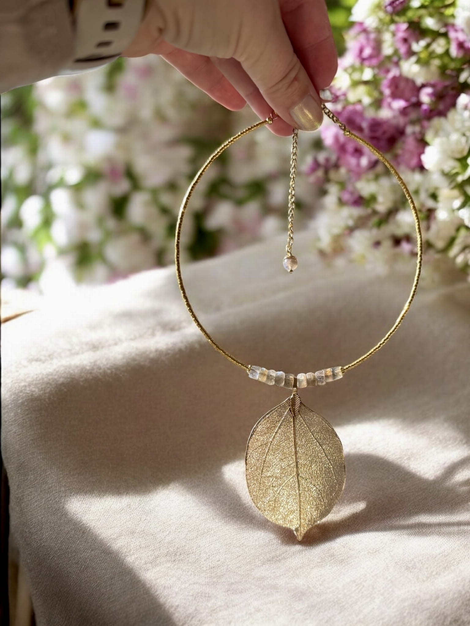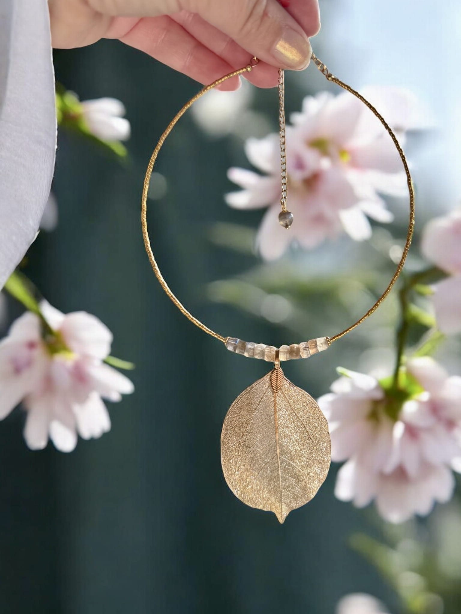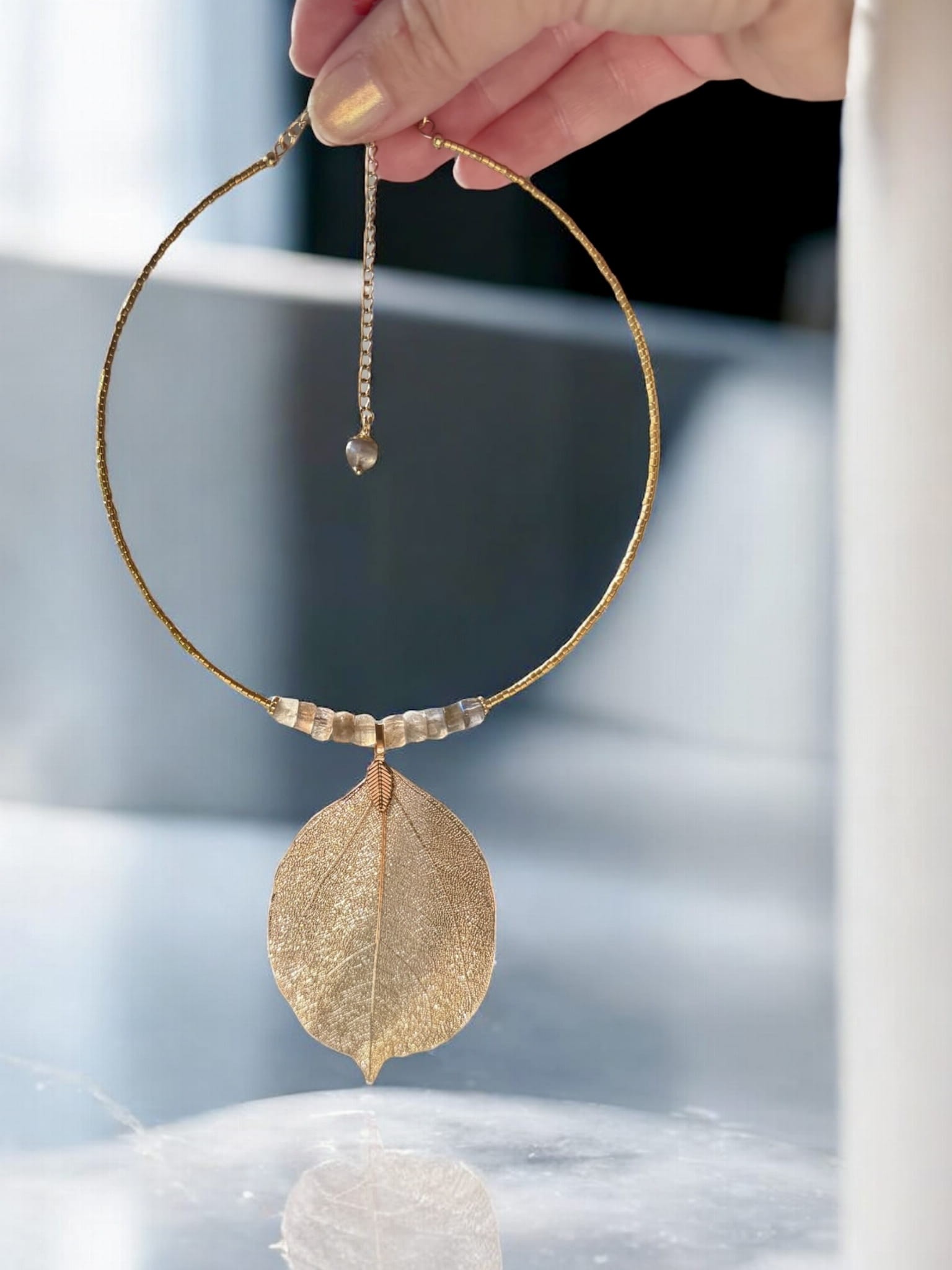 Poznaj biżuterię, która łączy w sobie naturę, sztukę i magię kamieni – naszyjnik z naturalnym złoconym liściem magnolii i labradorytem klasy AA.