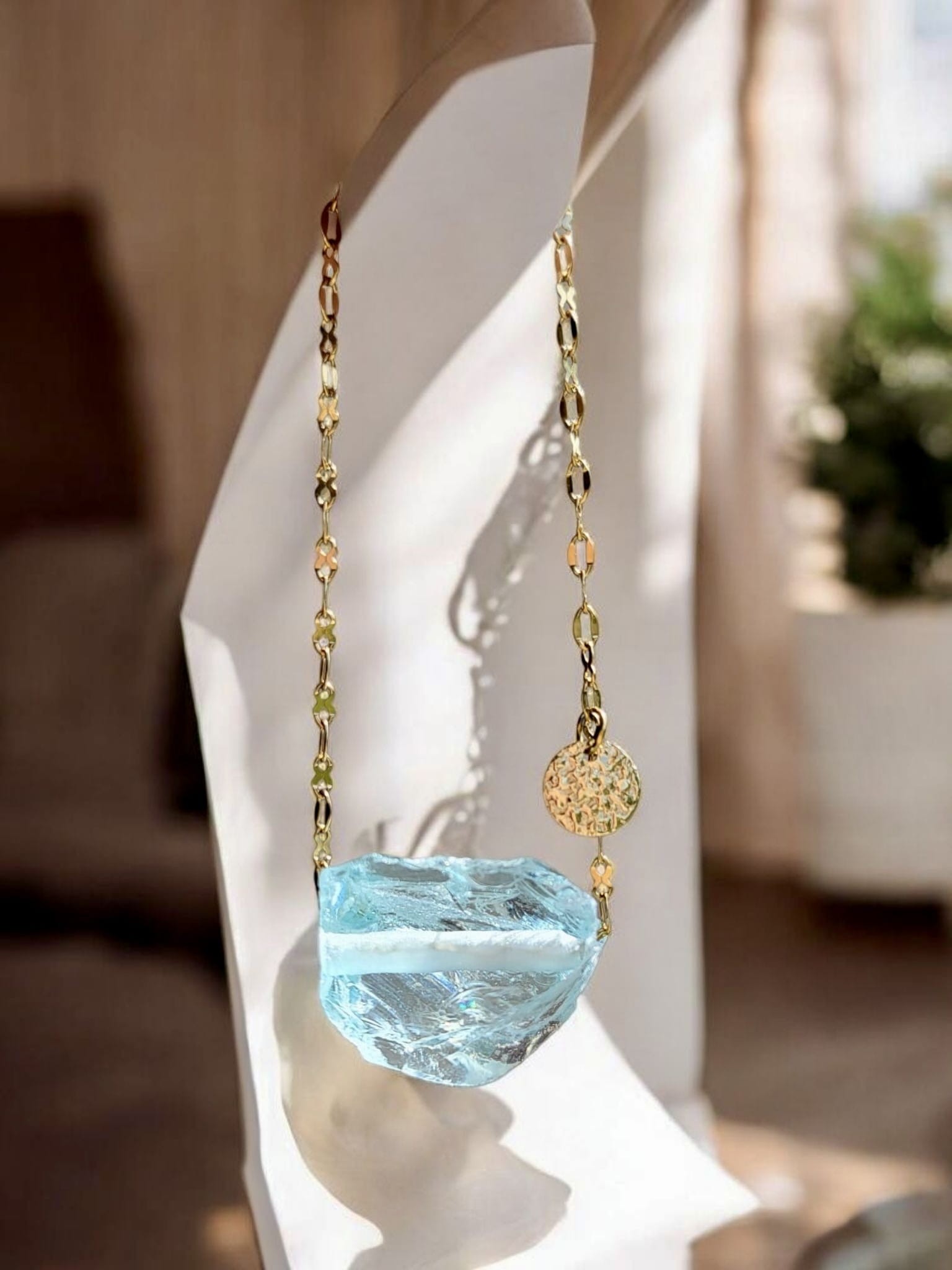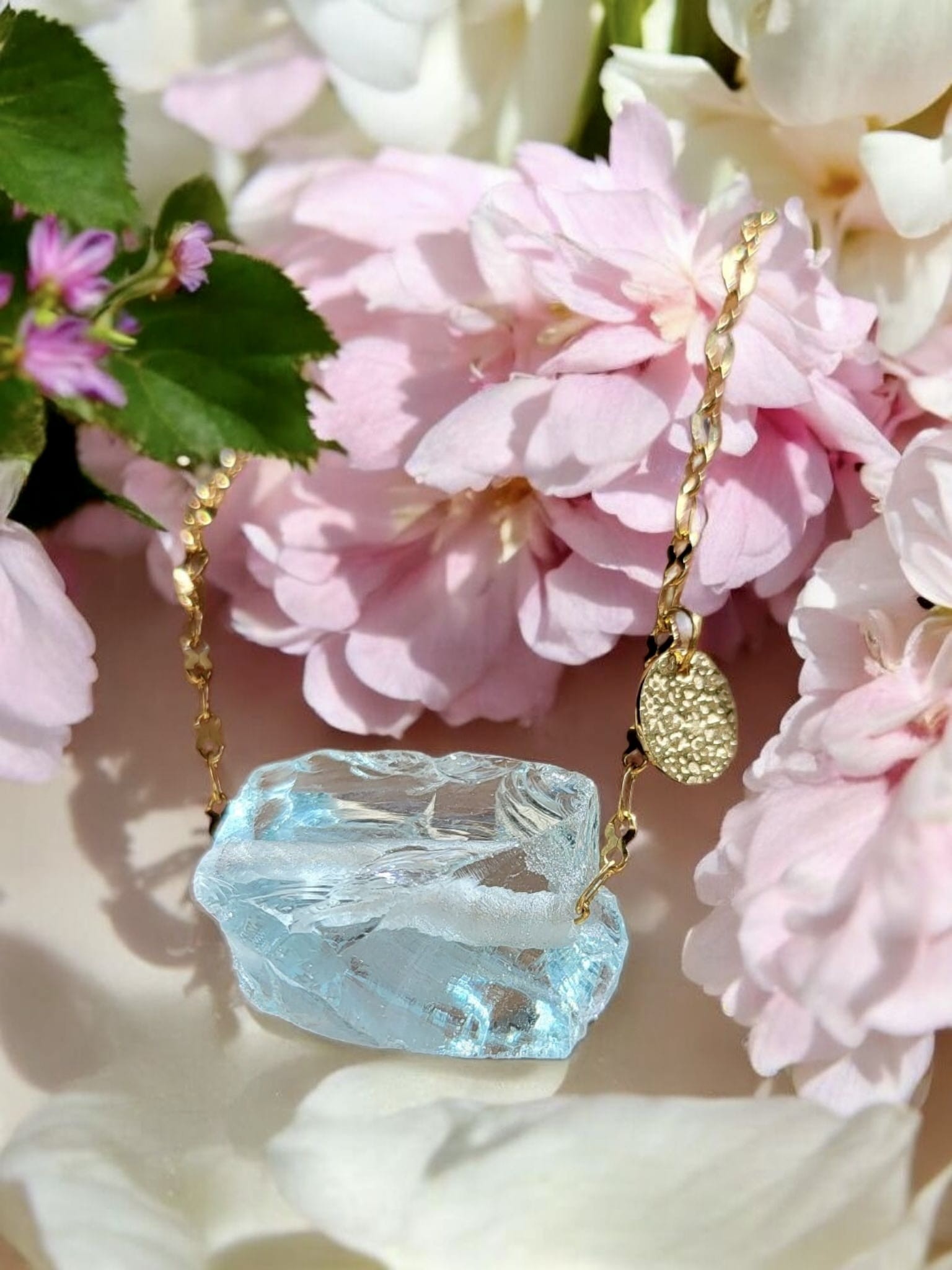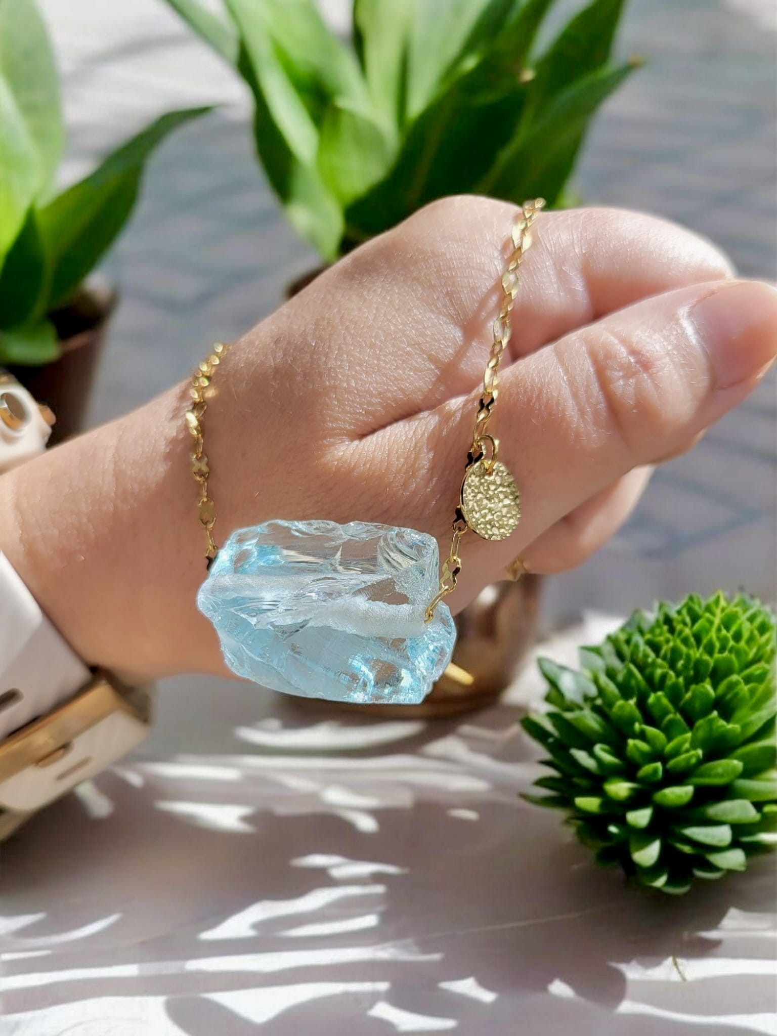 Poznaj Blue Crystal Soul – naszyjnik, który przenosi Cię wprost na słoneczne plaże Karaibów. W jego centrum znajduje się niepowtarzalna, surowa bryła kwarcu aqua o odcieniu przepięknego błękitu. Każdy kamień to unikat – nie istnieją dwie identyczne bryły. To biżuteria, która nie tylko zdobi, ale też opowiada Twoją historię.