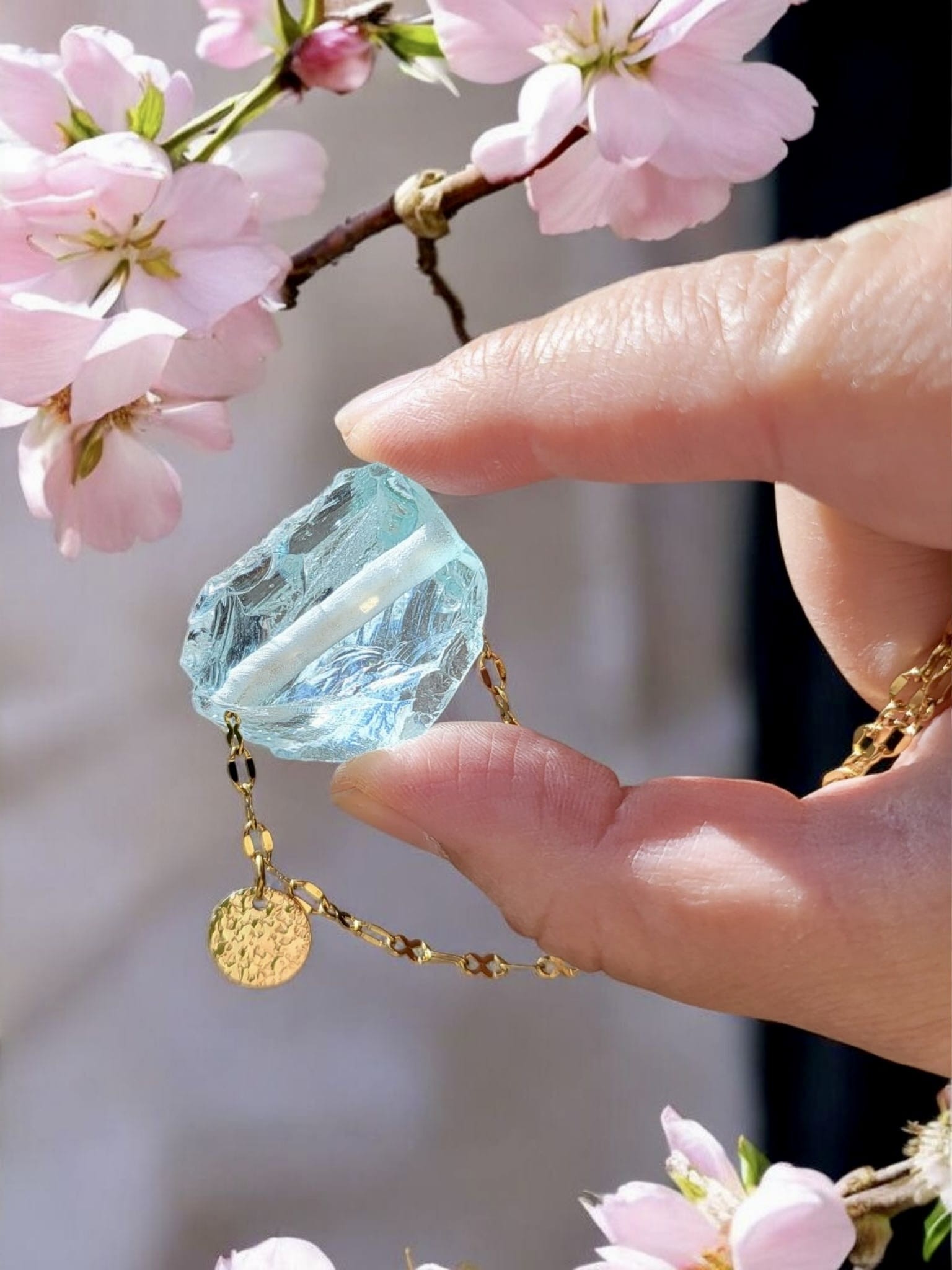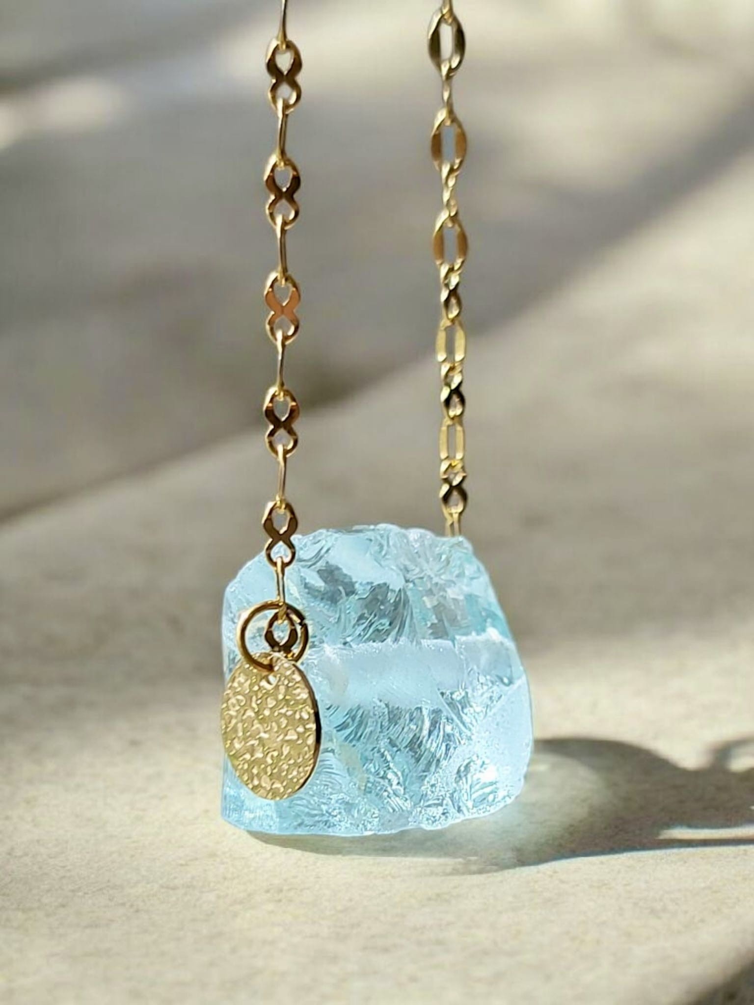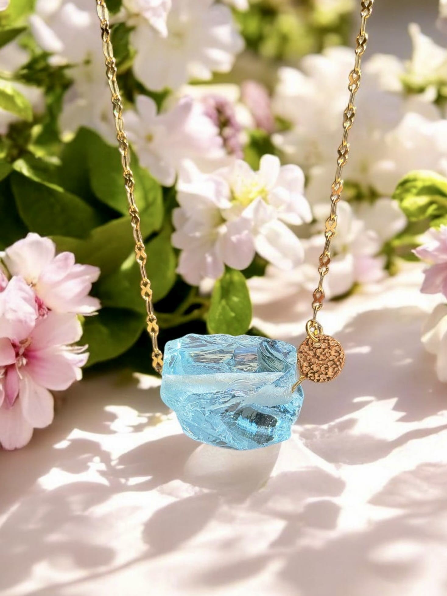 Poznaj Blue Crystal Soul – naszyjnik, który przenosi Cię wprost na słoneczne plaże Karaibów. W jego centrum znajduje się niepowtarzalna, surowa bryła kwarcu aqua o odcieniu przepięknego błękitu. Każdy kamień to unikat – nie istnieją dwie identyczne bryły. To biżuteria, która nie tylko zdobi, ale też opowiada Twoją historię.