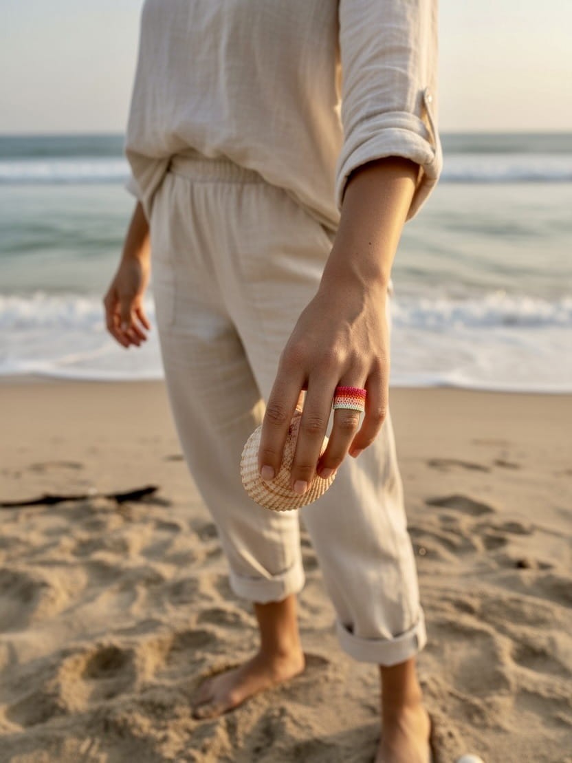 Wykonany ręcznie z kultowych japońskich koralików Miyuki, znanych z absolutnej precyzji wykonania i hipnotyzującego błysku. Rześkie odcienie fuksji, pomarańczy, limonki i mięty tworzą soczystą, egzotyczną mozaikę. Ten szeroki pierścionek (ok. 14 mm) to małe dzieło sztuki na Twoim palcu – biżuteryjna pocztówka z wakacji.