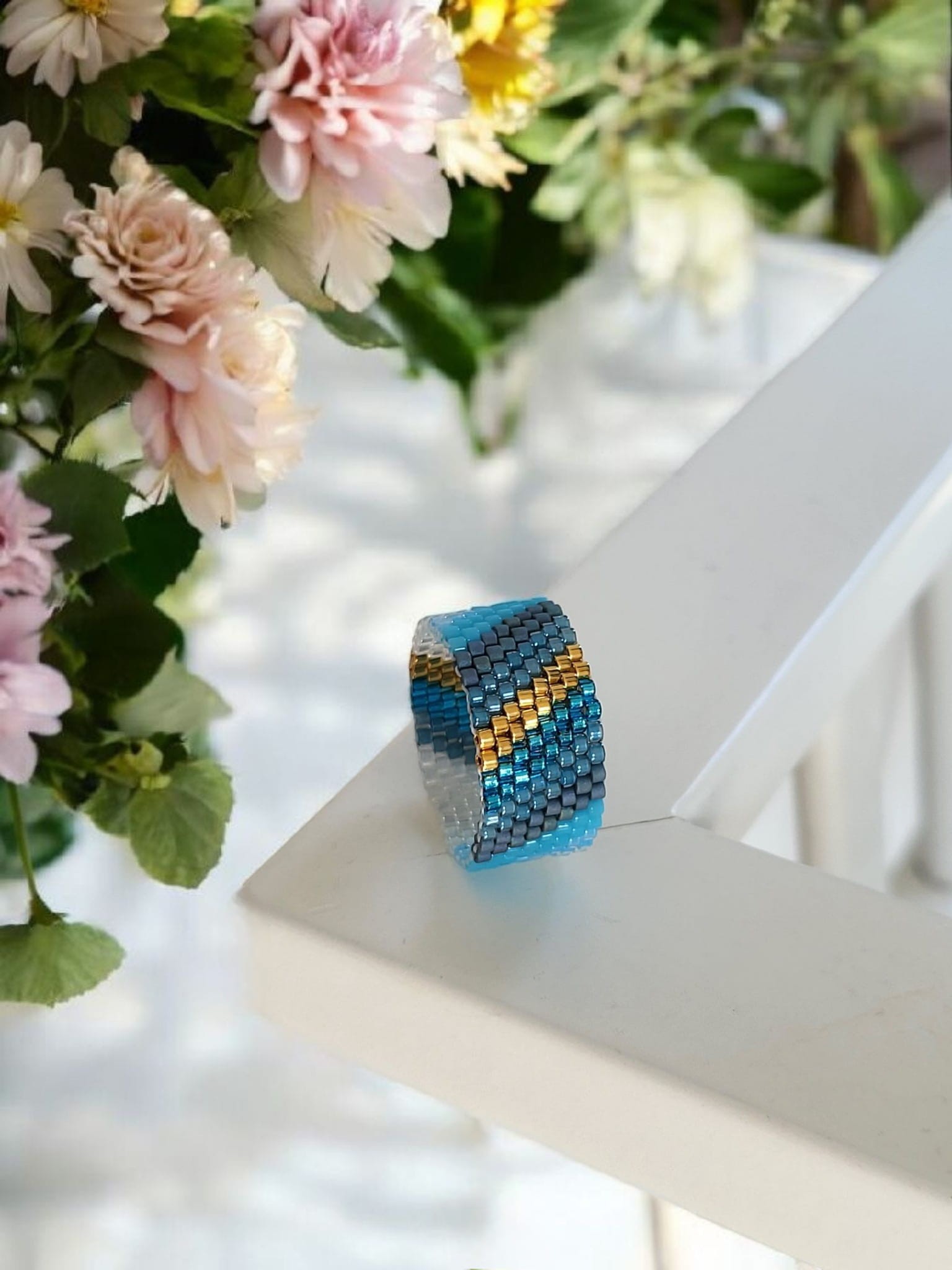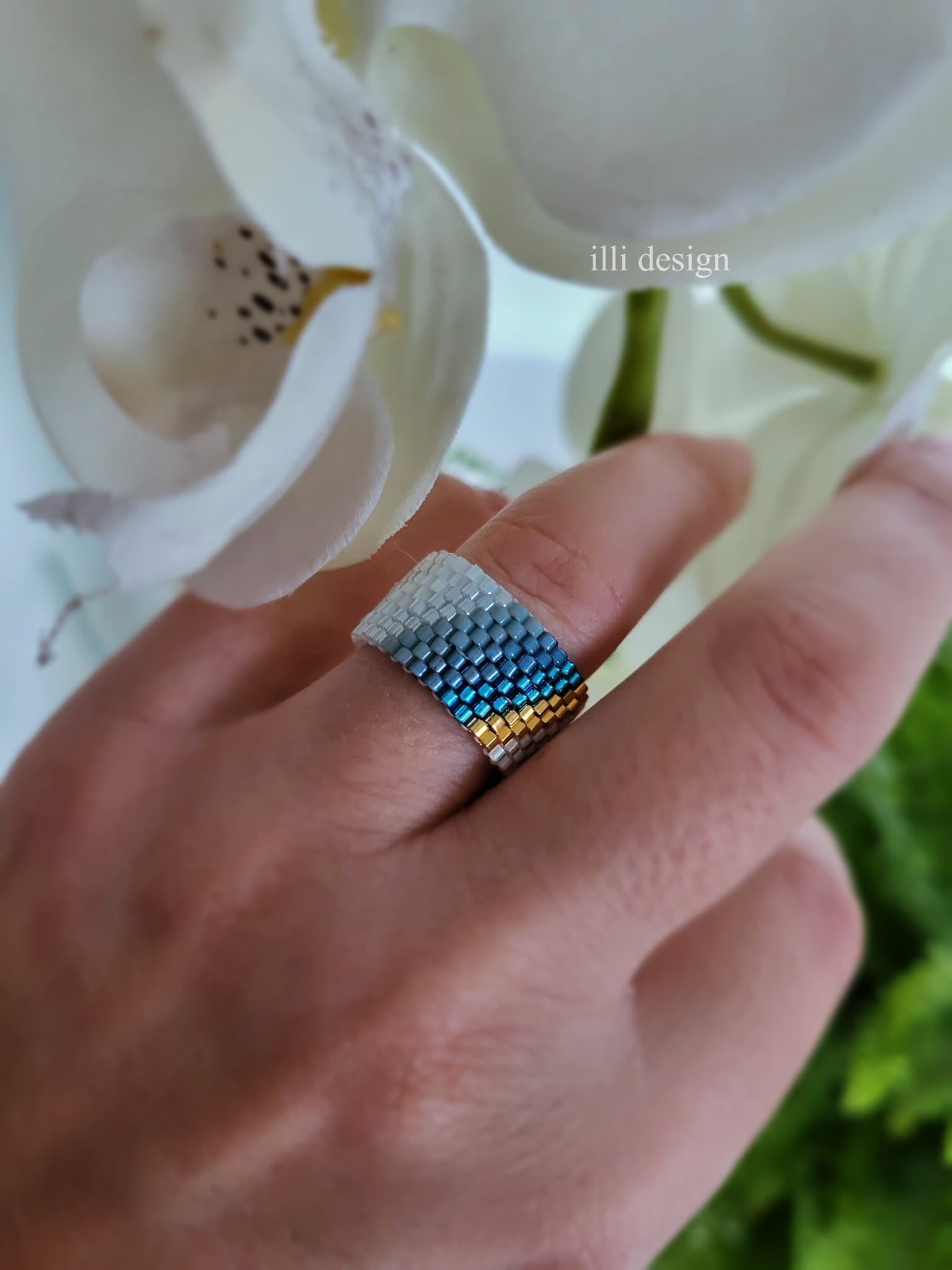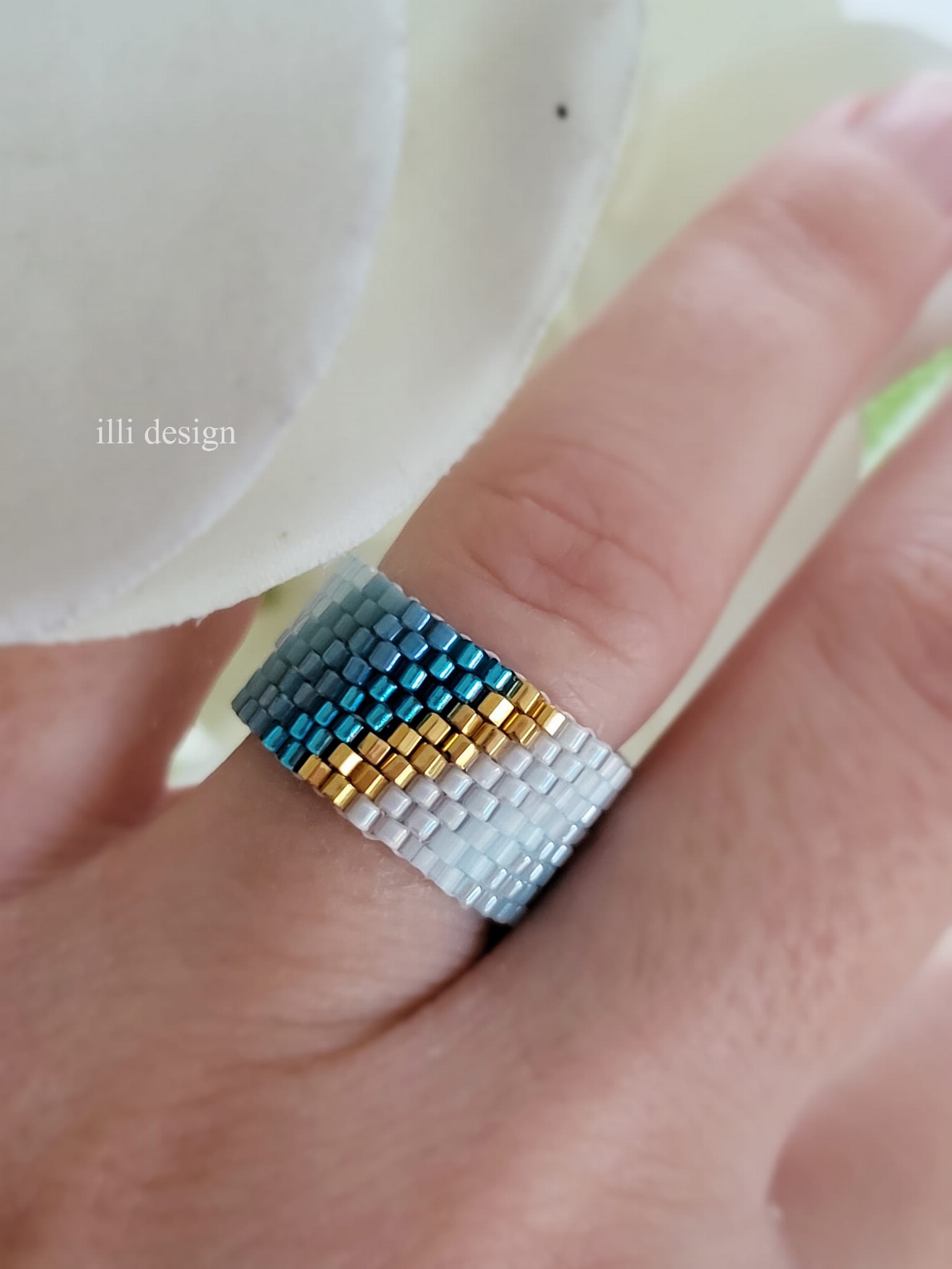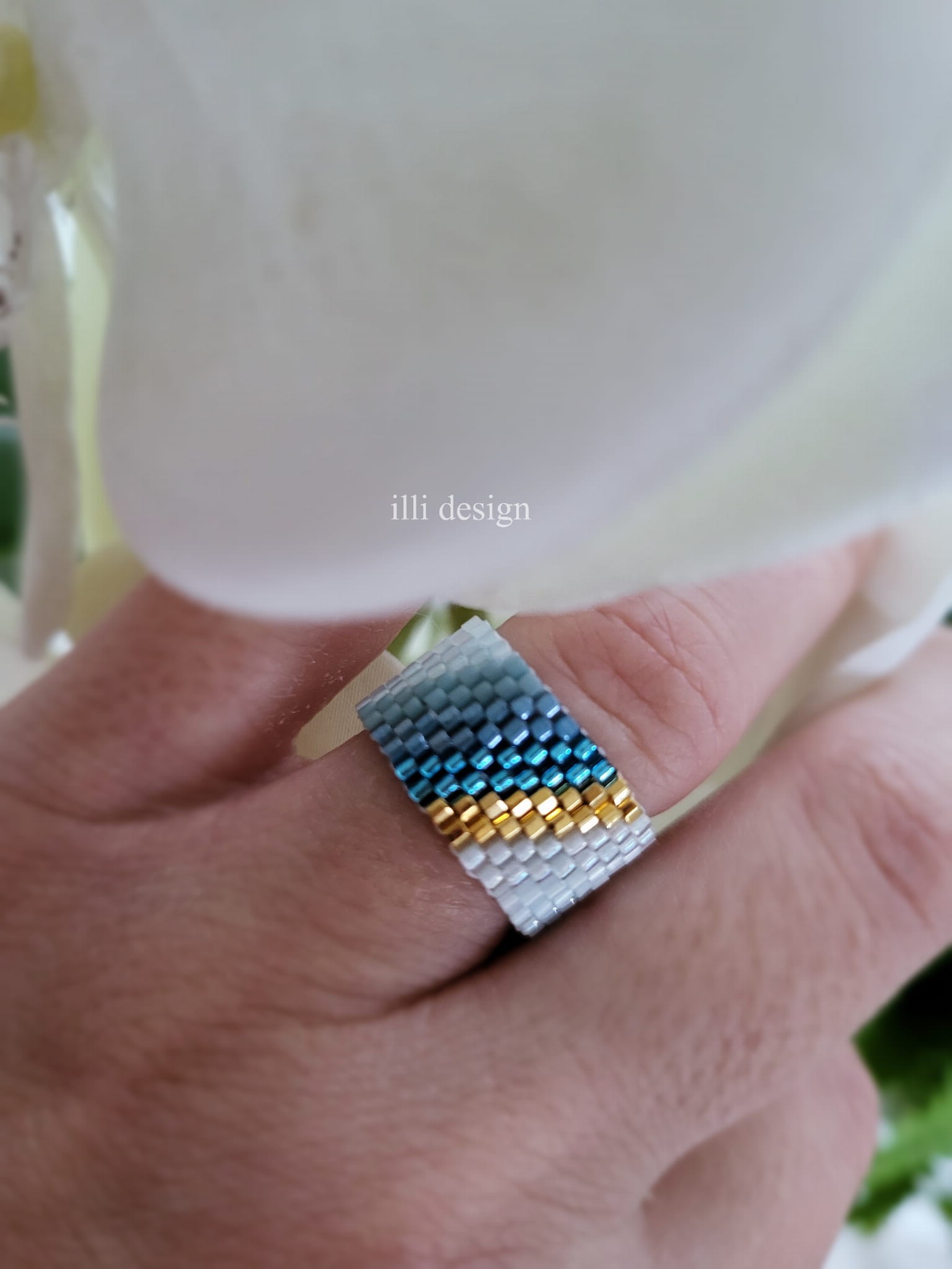 Pierścionek tkany biało - niebieski ze złotem Harmonia rozm 18/19