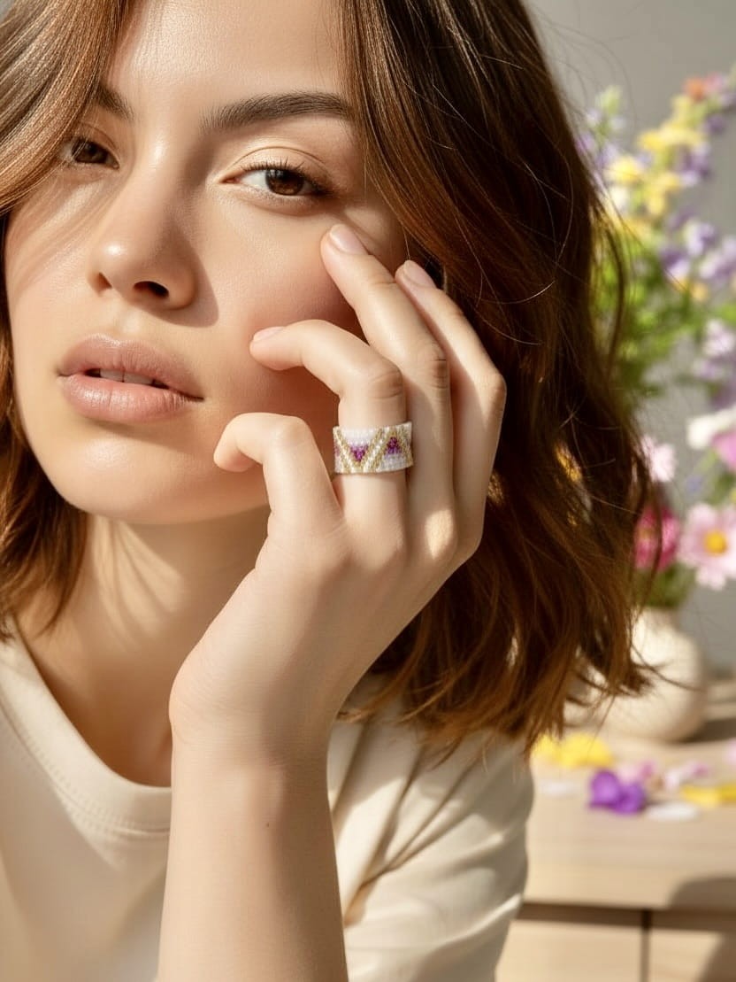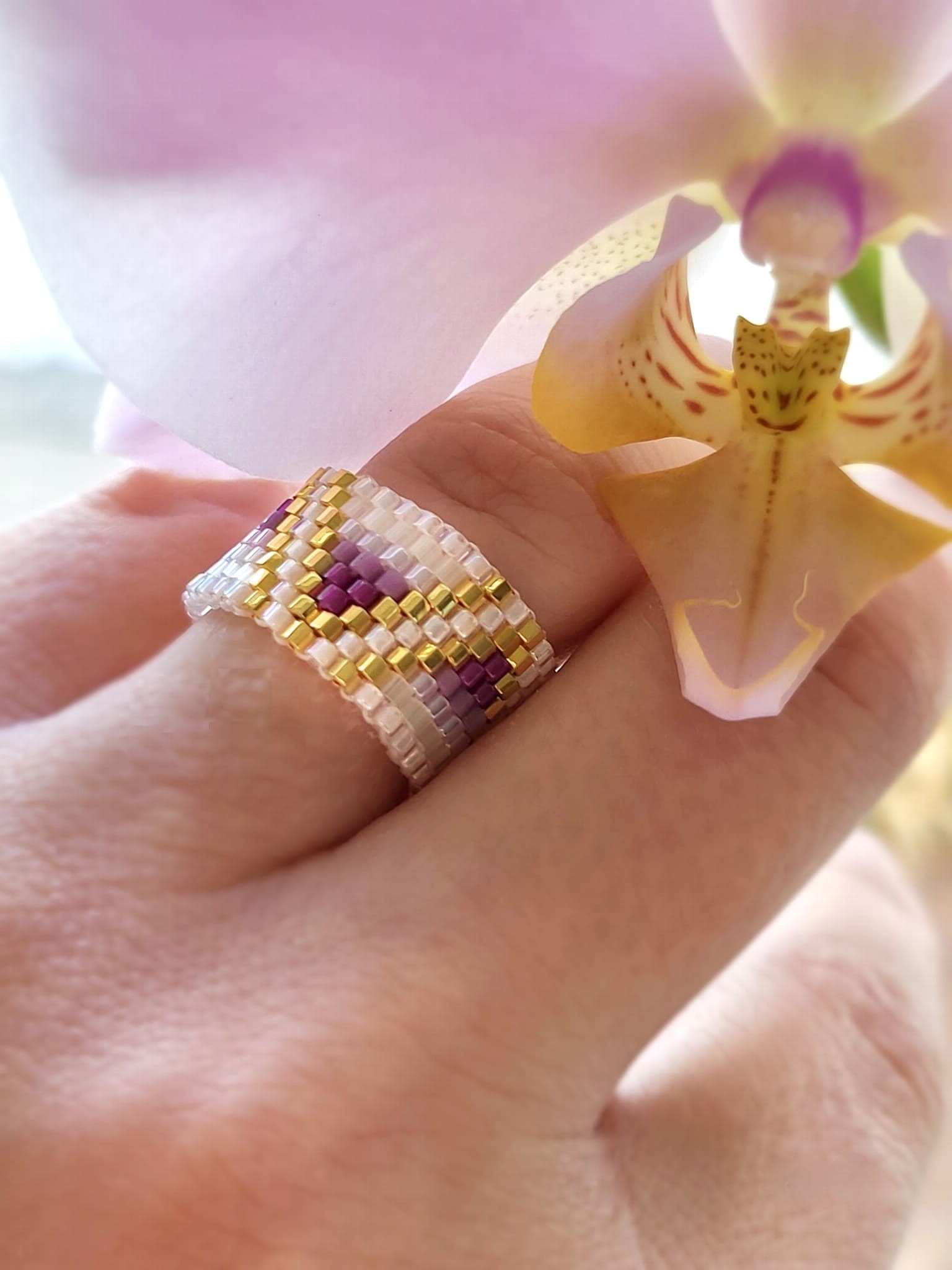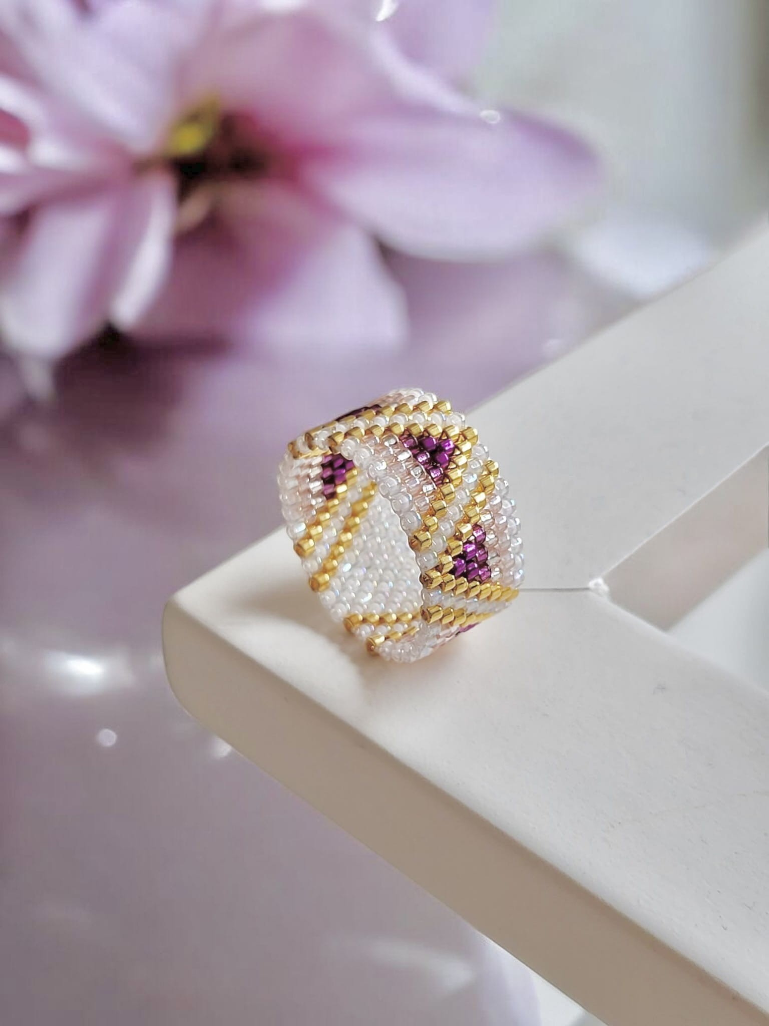 Ten pierścionek to więcej niż biżuteria – to mikroarcydzieło, które hipnotyzuje subtelnym blaskiem i harmonią barw. Ręcznie tkany z precyzyjnych, szklanych koralików Miyuki, w odcieniach głębokiego fioletu, perłowej bieli i luksusowego 24-karatowego złota.