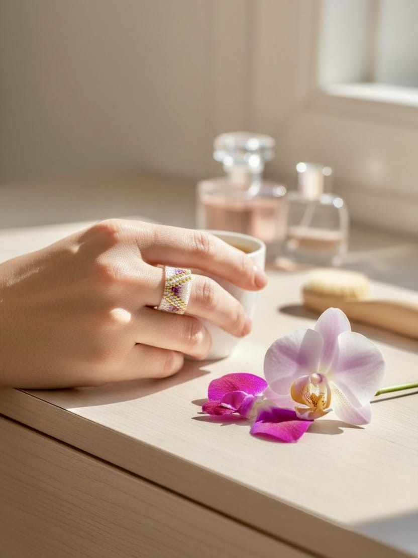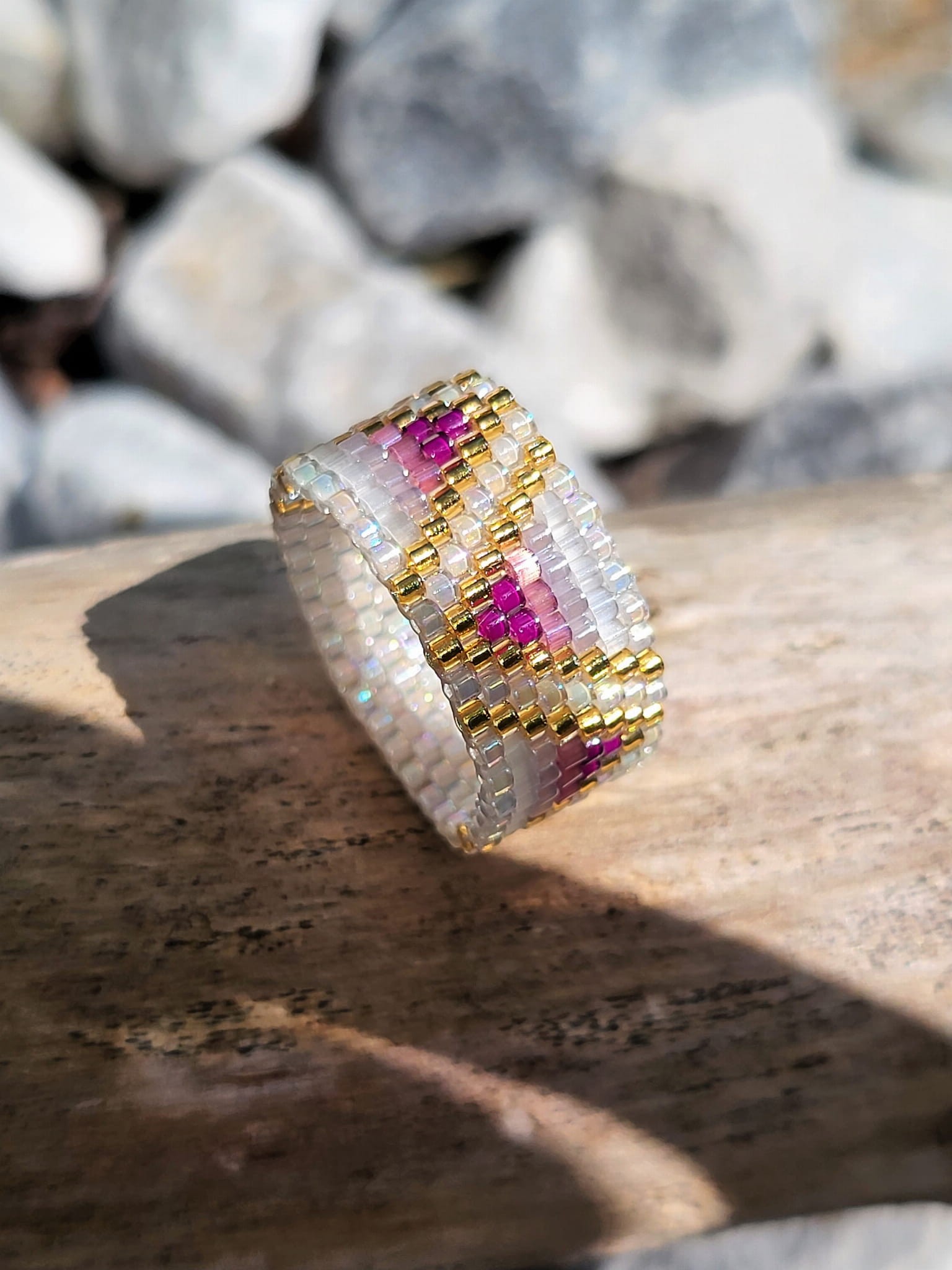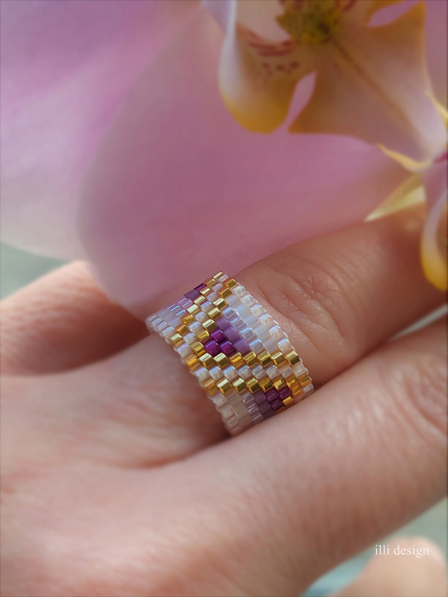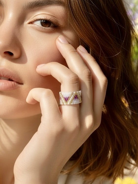 Ten pierścionek to więcej niż biżuteria – to mikroarcydzieło, które hipnotyzuje subtelnym blaskiem i harmonią barw. Ręcznie tkany z precyzyjnych, szklanych koralików Miyuki, w odcieniach głębokiego fioletu, perłowej bieli i luksusowego 24-karatowego złota.