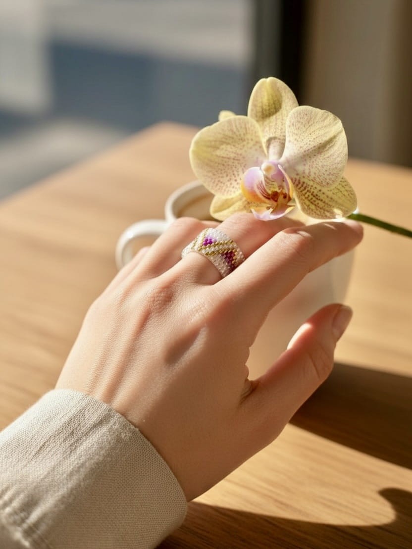 Każdy koralik – o perfekcyjnej średnicy 1,6 mm – został wybrany z ogromną dbałością, a ułożenie wzoru tworzy niezwykły efekt gry światła i koloru, który wręcz tańczy na dłoni. Szerokość pierścionka nadaje mu wyrazisty, a zarazem elegancki charakter. To biżuteria klasy premium, dla kobiet, które kochają unikalność, magię rękodzieła i najwyższą jakość.