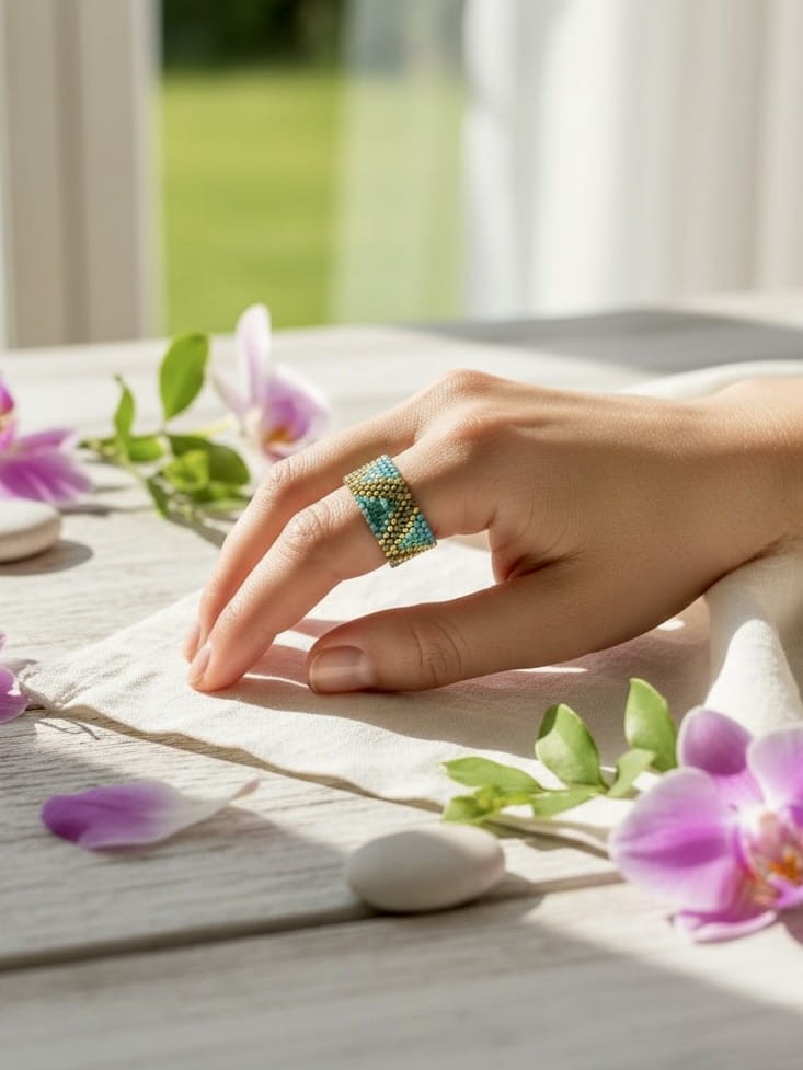 Pierścionek tkany z koralików Miyuki, szeroki, zielono - złoty Evelyn