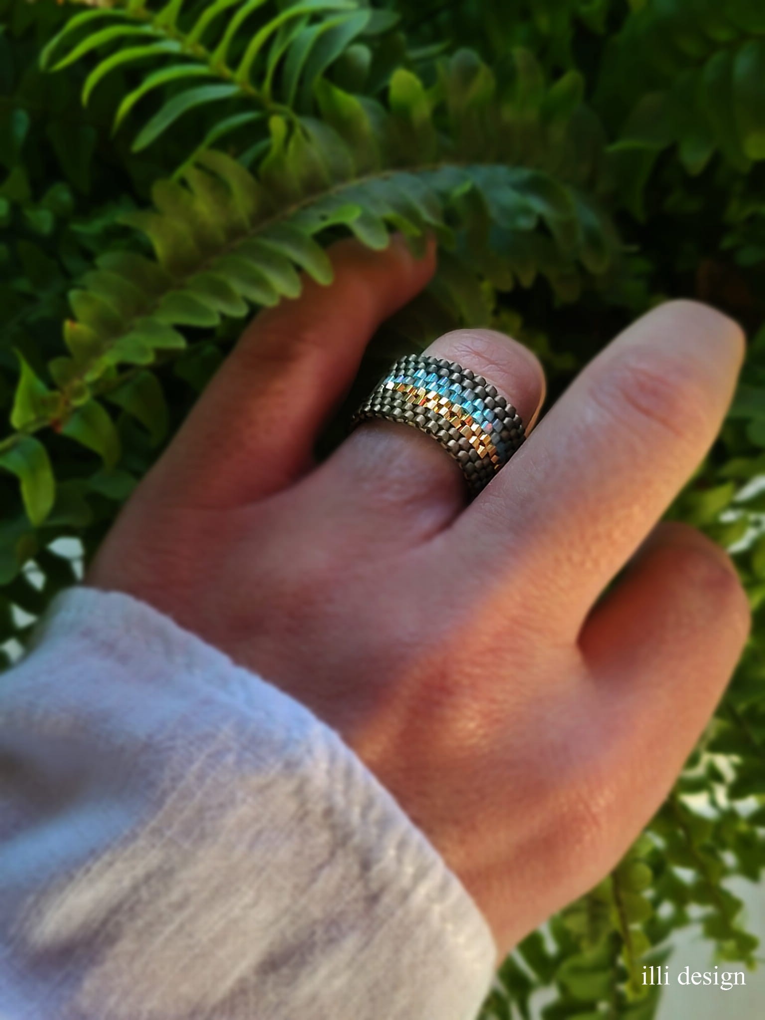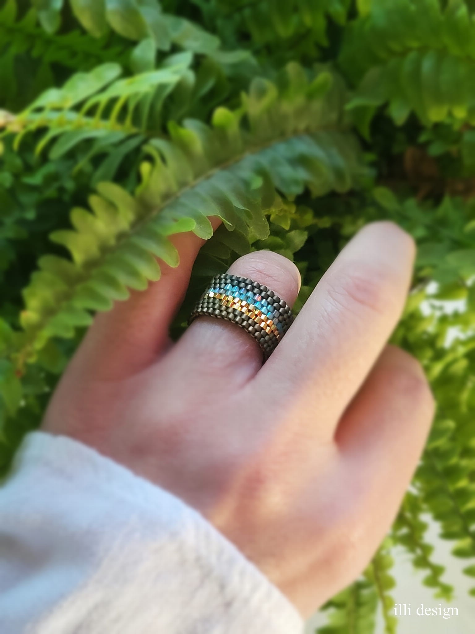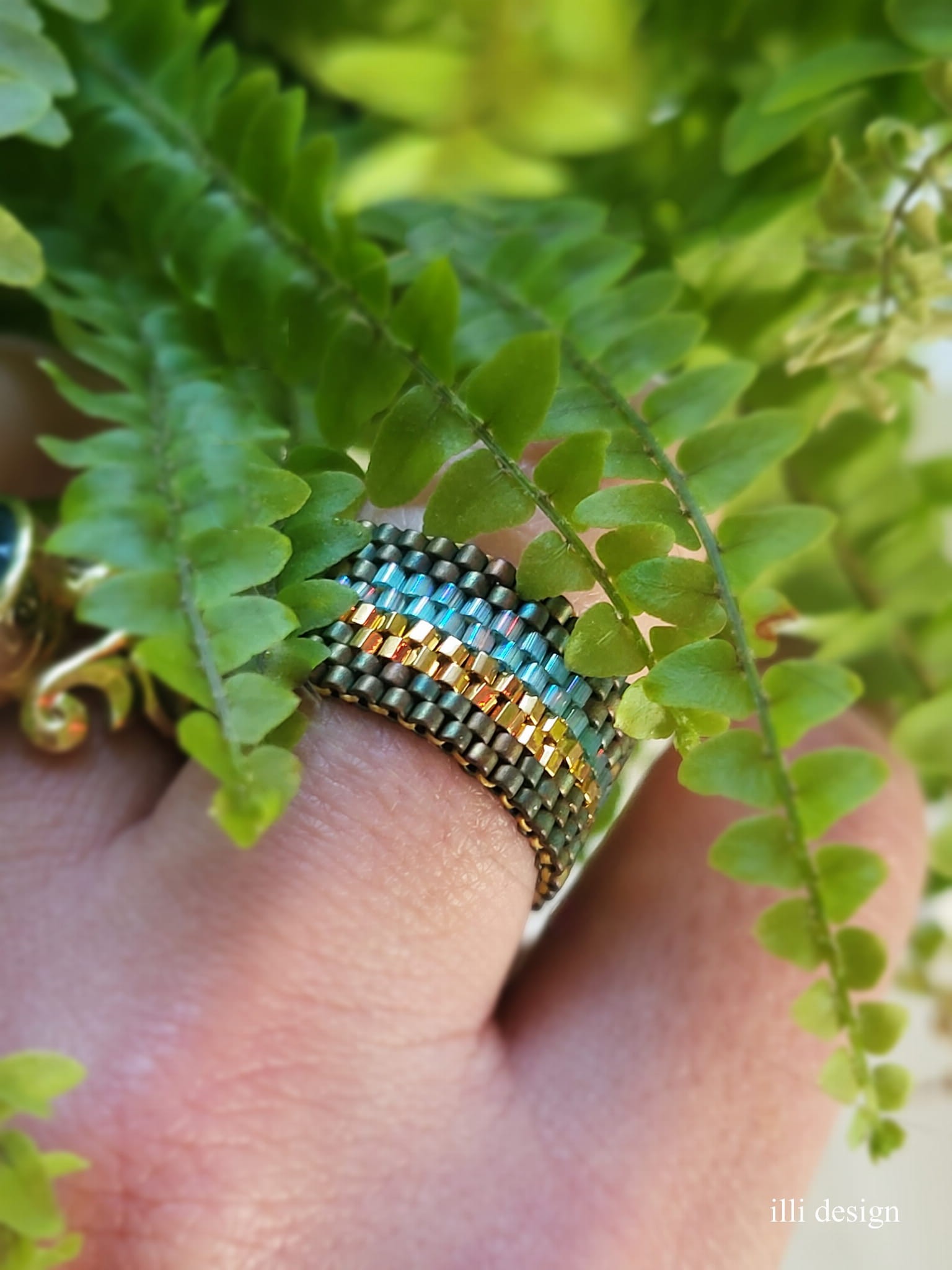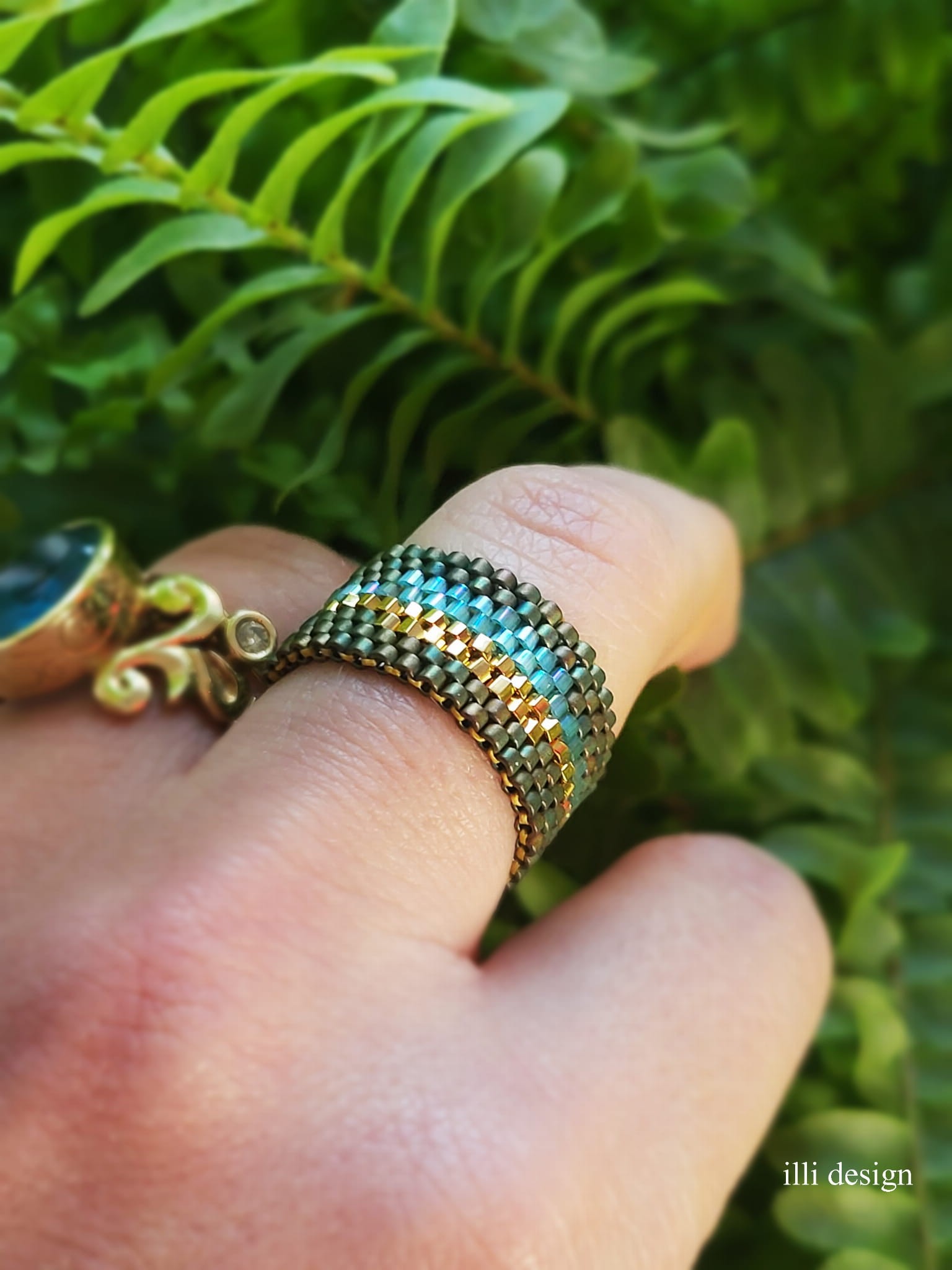 Pierścionek tkany z koralików Miyuki, szeroki, zielony Runo leśne