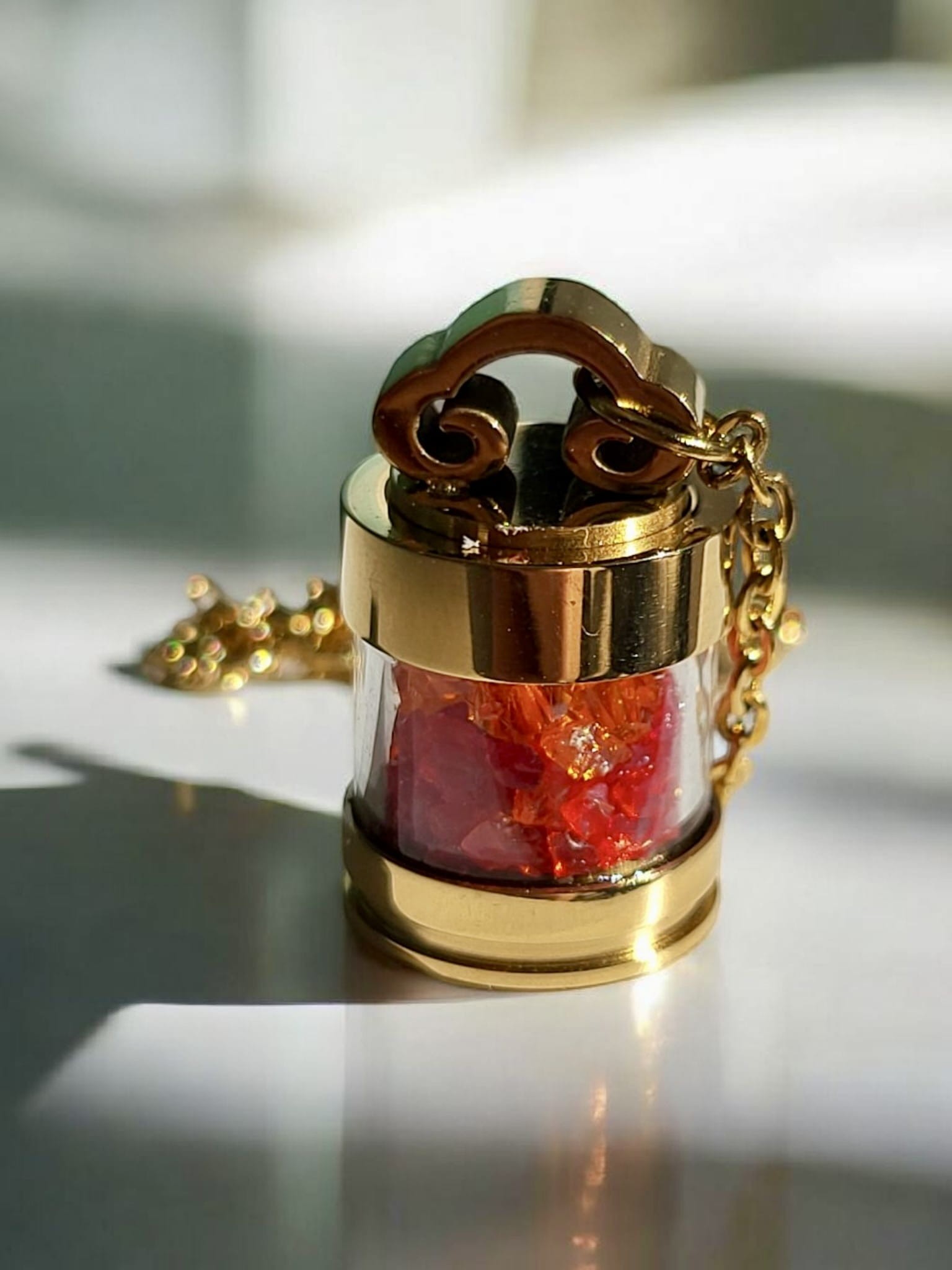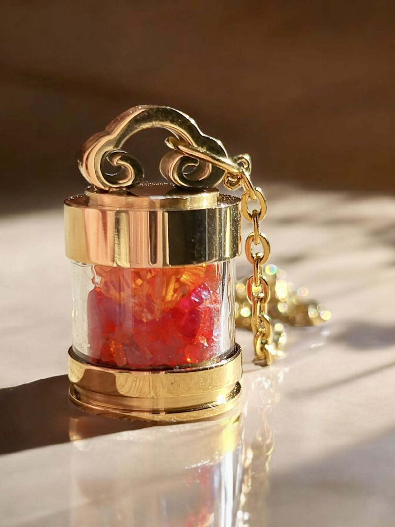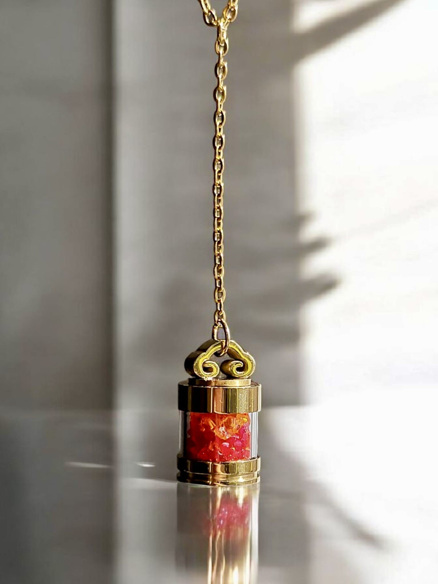 Odkryj wyjątkowy medalion inspirowany naturą, wypełniony autentycznym szkłem morskim w odcieniach głębokiej czerwieni. Pomarańczowe kryształki subtelnie otulające szkło potęgują efekt załamania światła, tworząc niezwykły blask. Każdy egzemplarz jest niepowtarzalny, niczym fale, które przez lata wygładzały szkło, nadając mu wyjątkowy charakter.