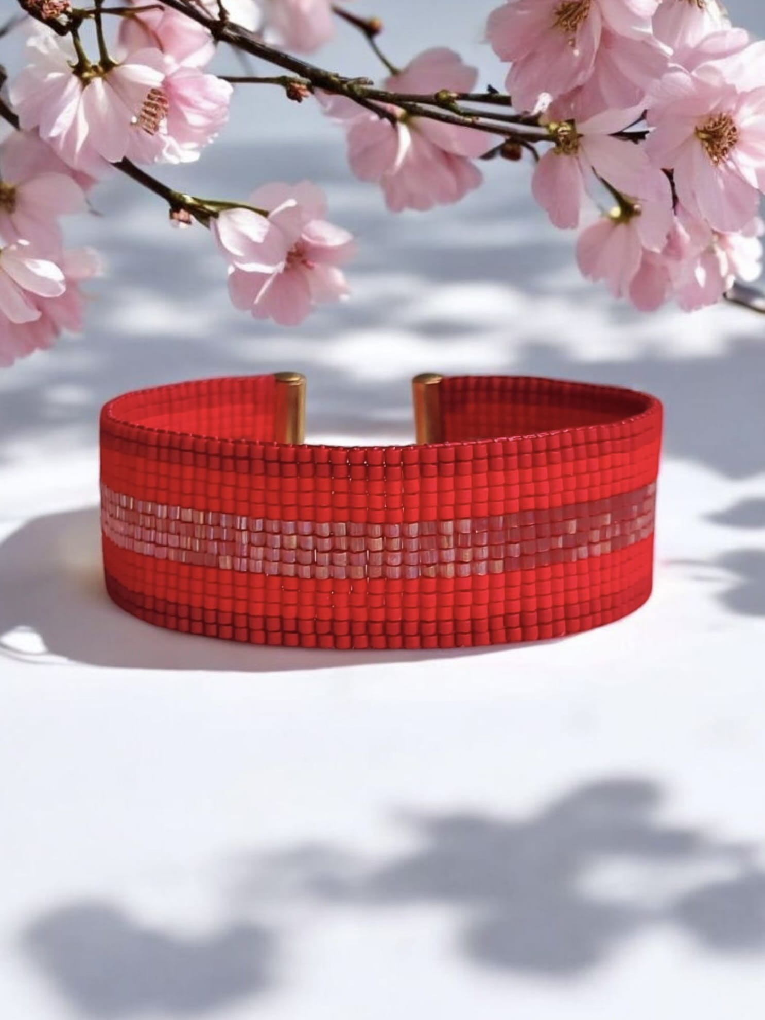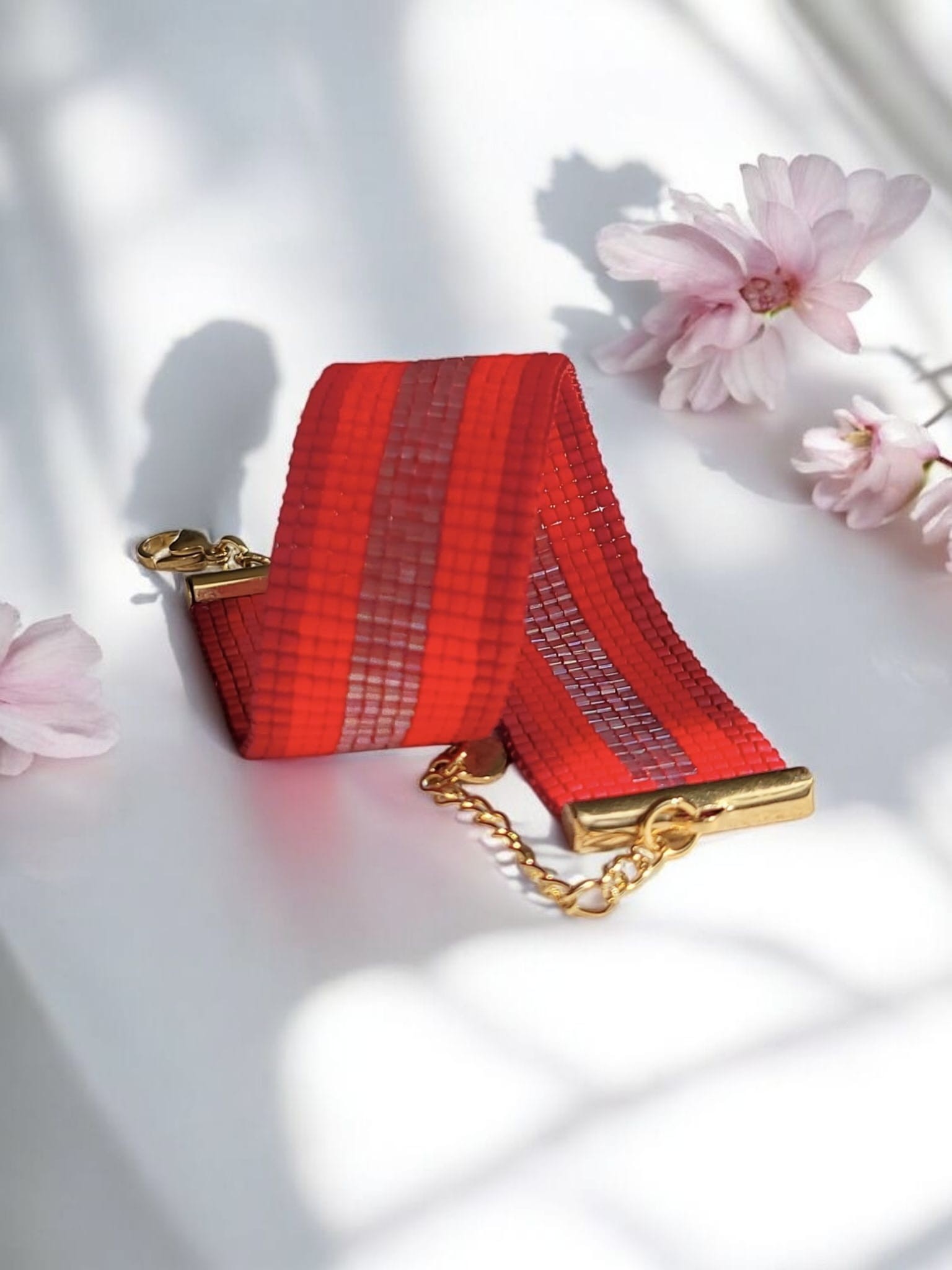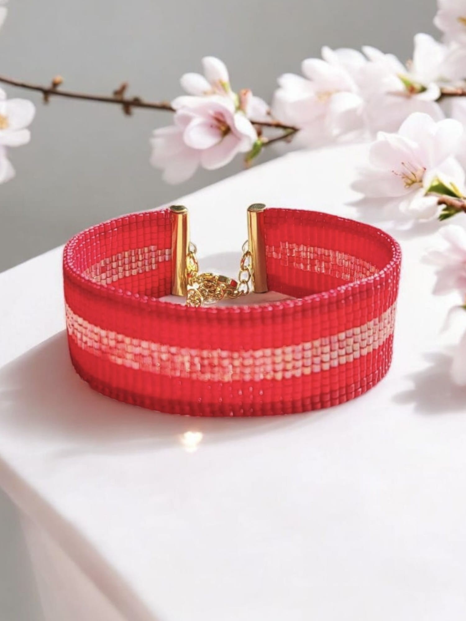 Ręcznie tkana bransoletka z japońskich koralików Miyuki – czerwona elegancja w nowoczesnym wydaniu