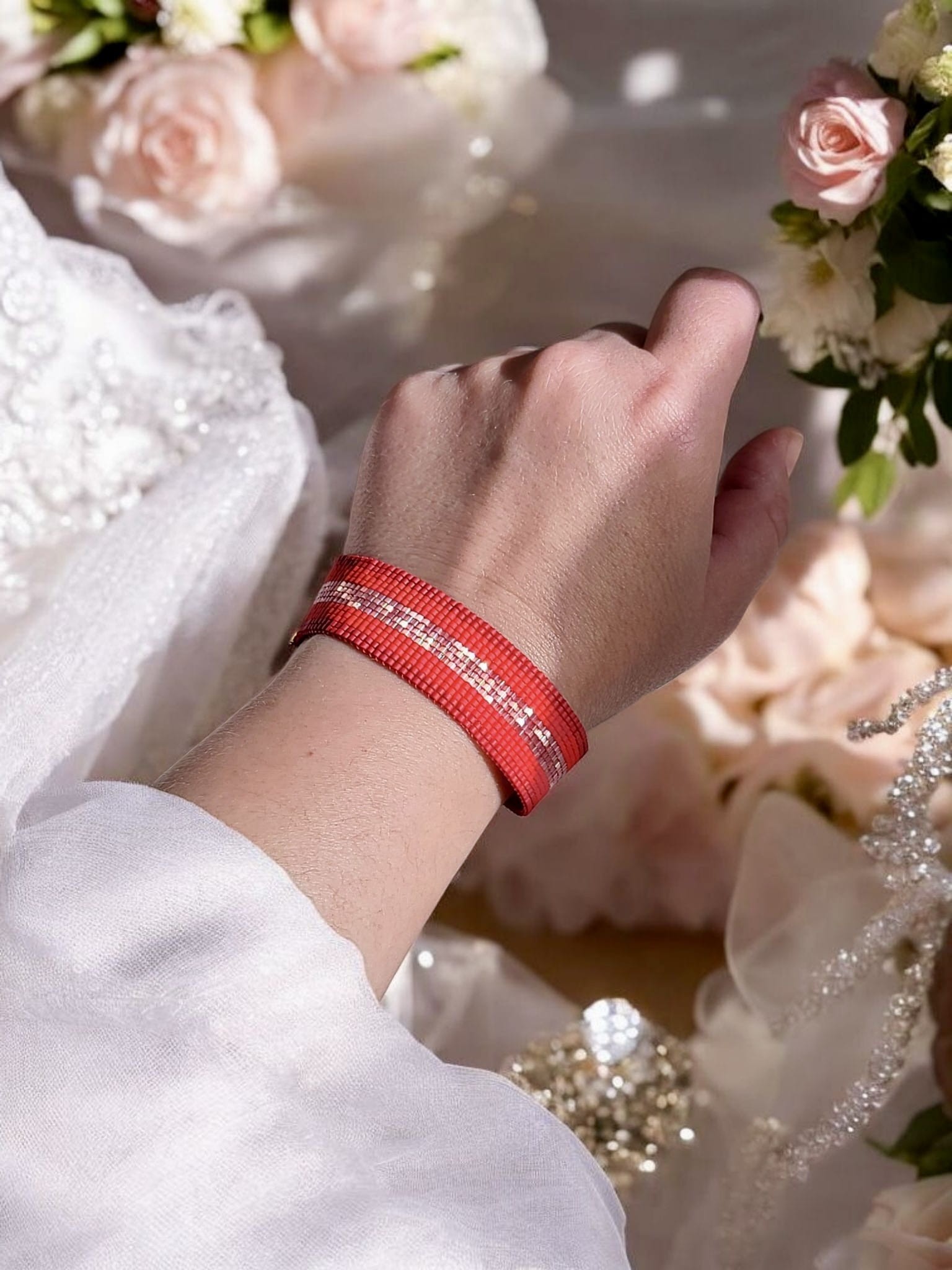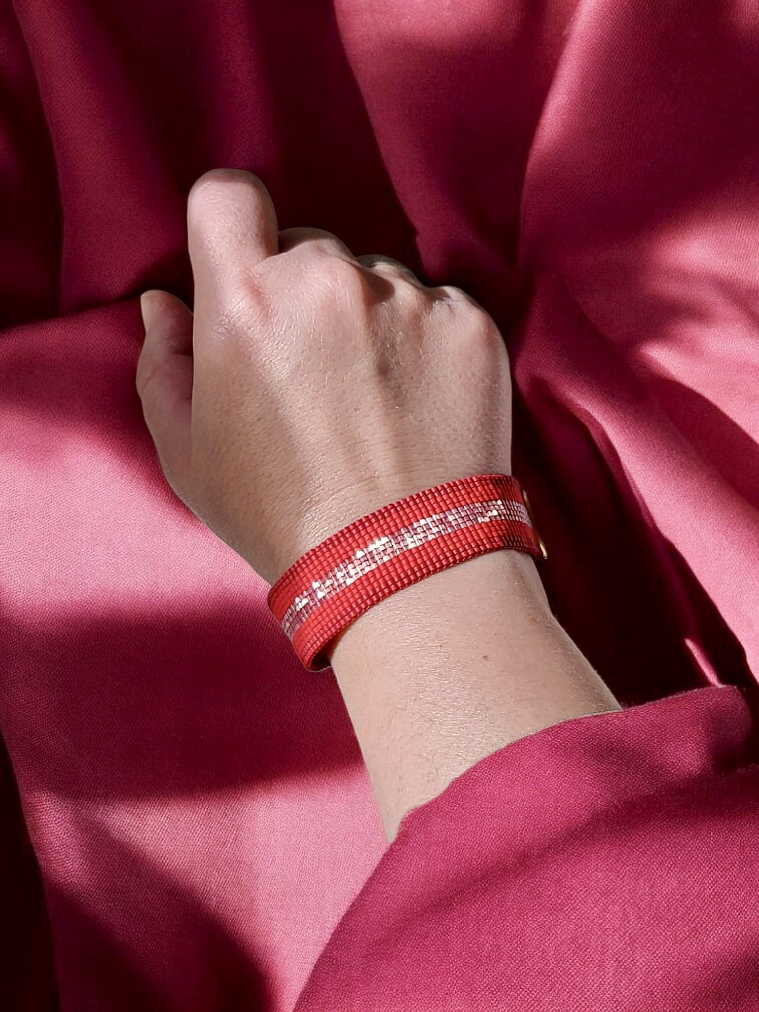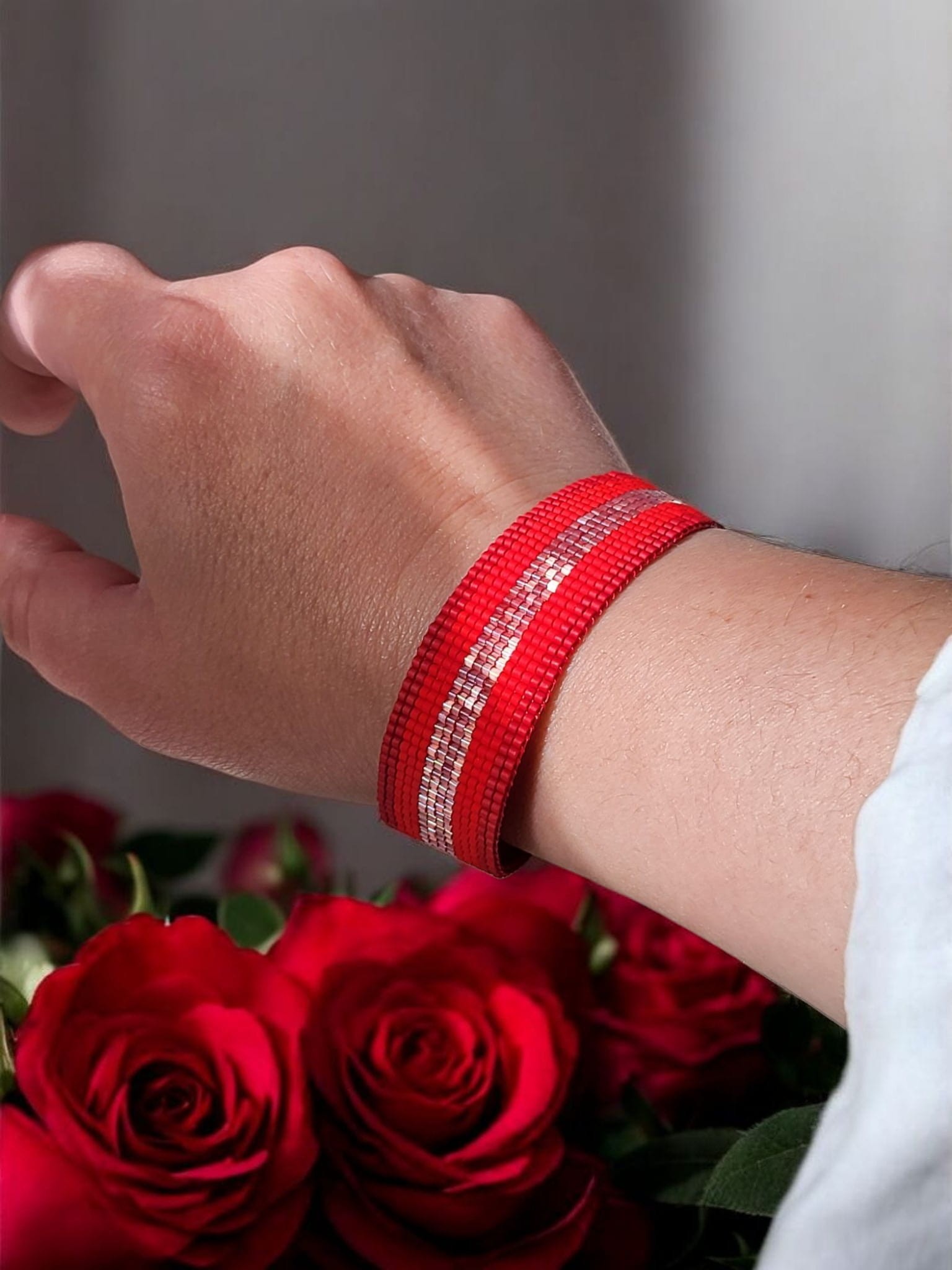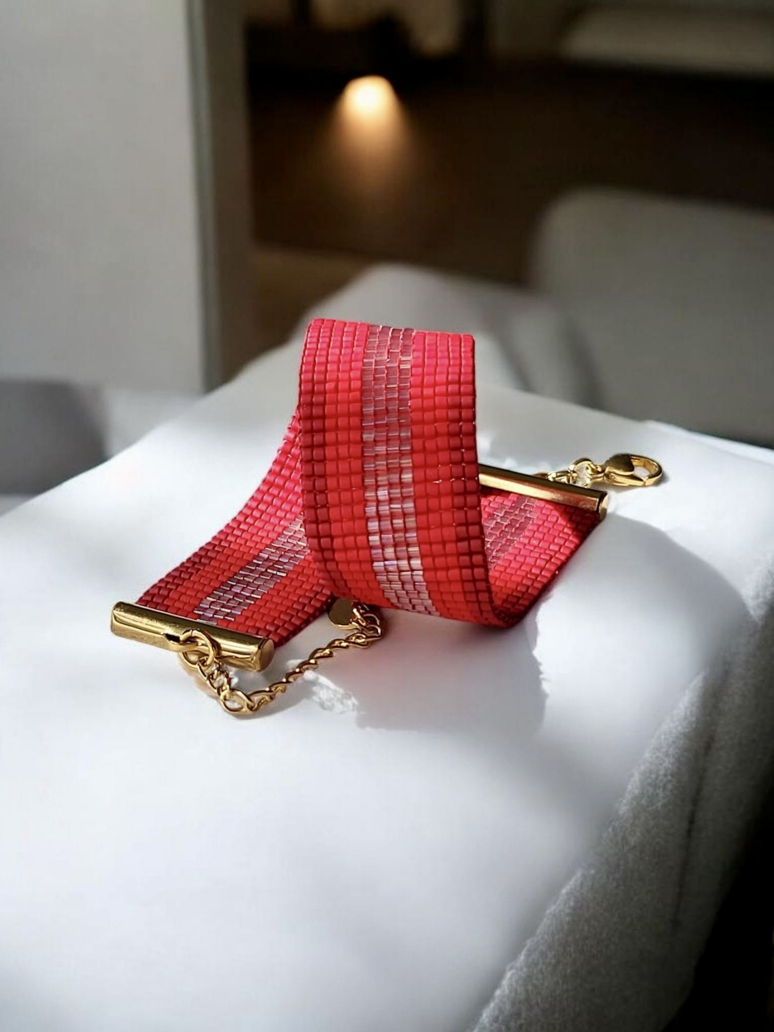 Ręcznie tkana bransoletka z japońskich koralików Miyuki – czerwona elegancja w nowoczesnym wydaniu