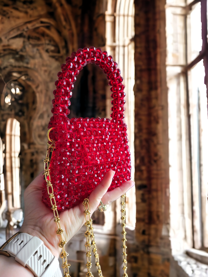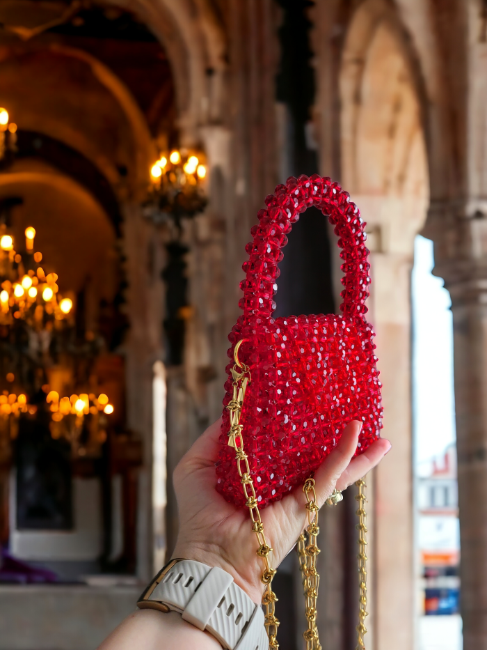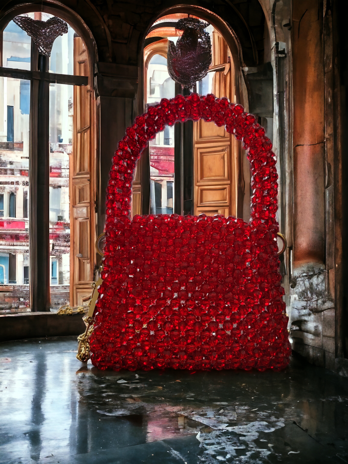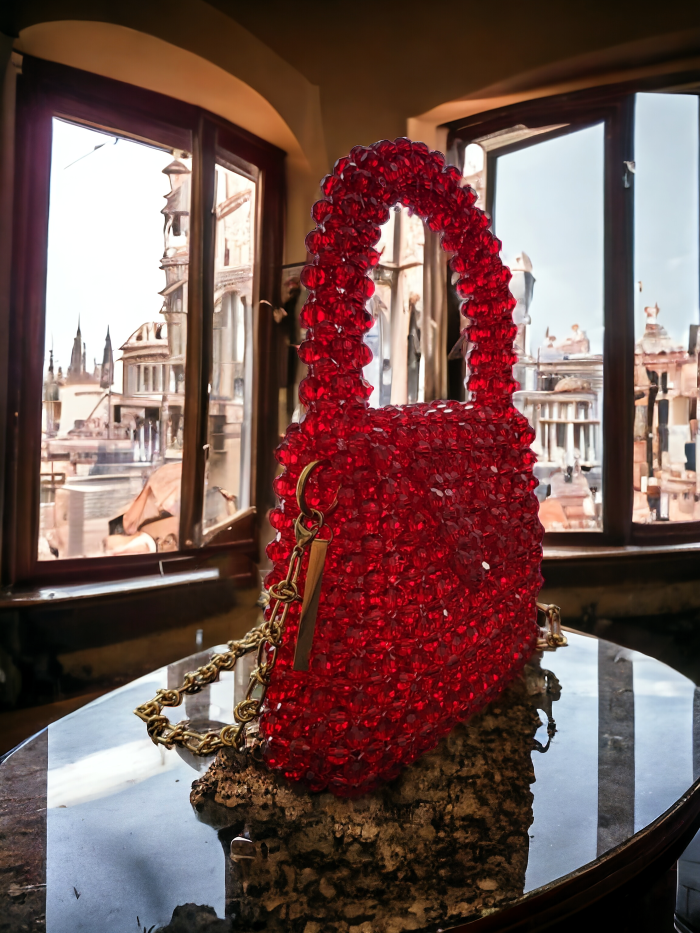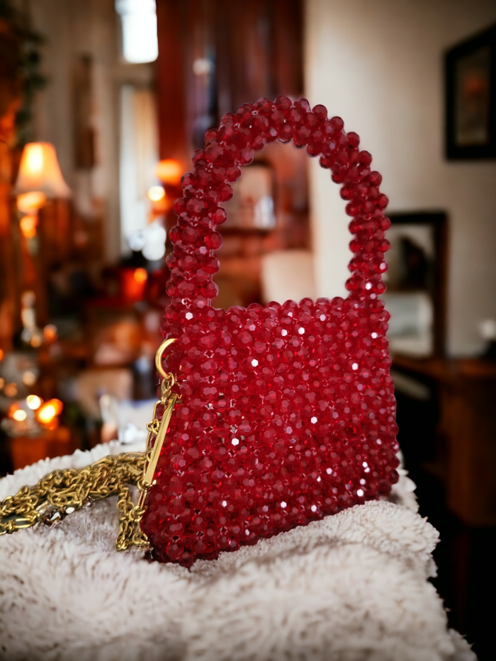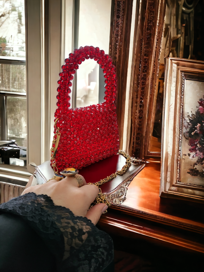 Zjawiskowa biżuteryjna torebka z kryształów – ręcznie tkana z ponad tysiąca szlifowanych kryształów o głębokiej czerwono-bordowej barwie. Luksusowy dodatek, który olśniewa blaskiem, idealny na wieczorowe wyjścia, bankiety i imprezy. Wyjątkowa, elegancka i pełna magii. ✨